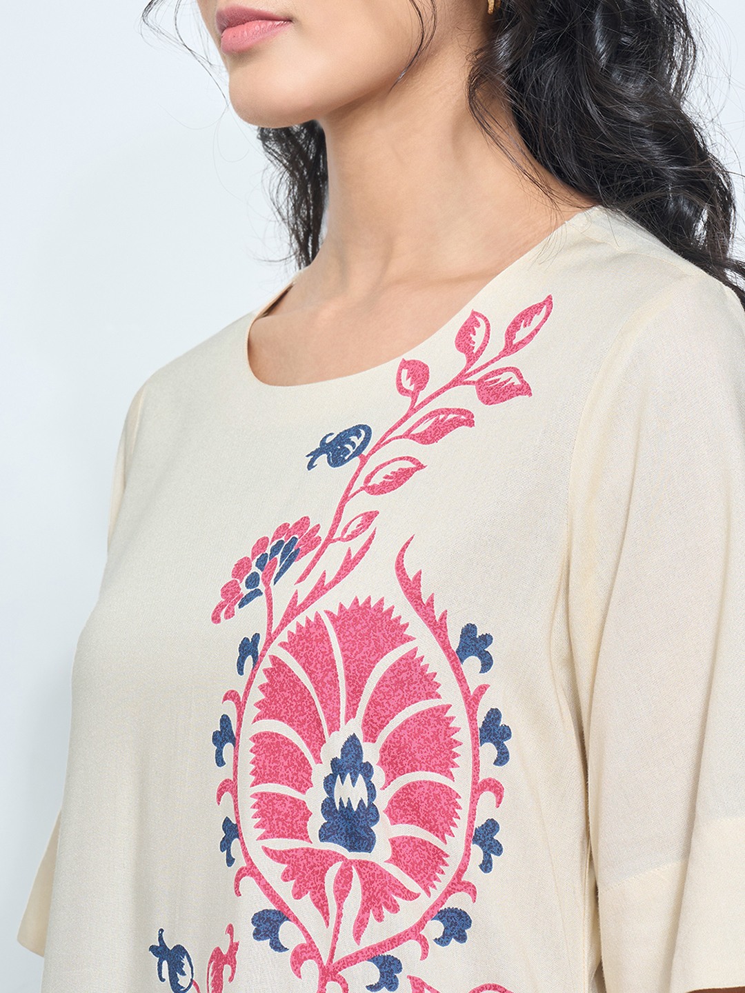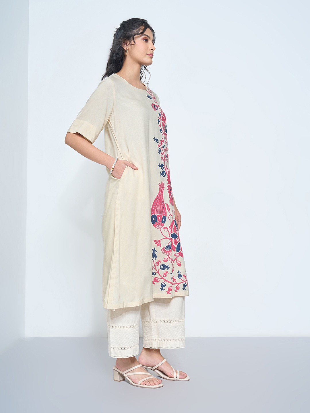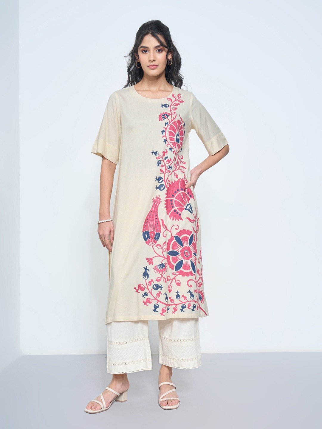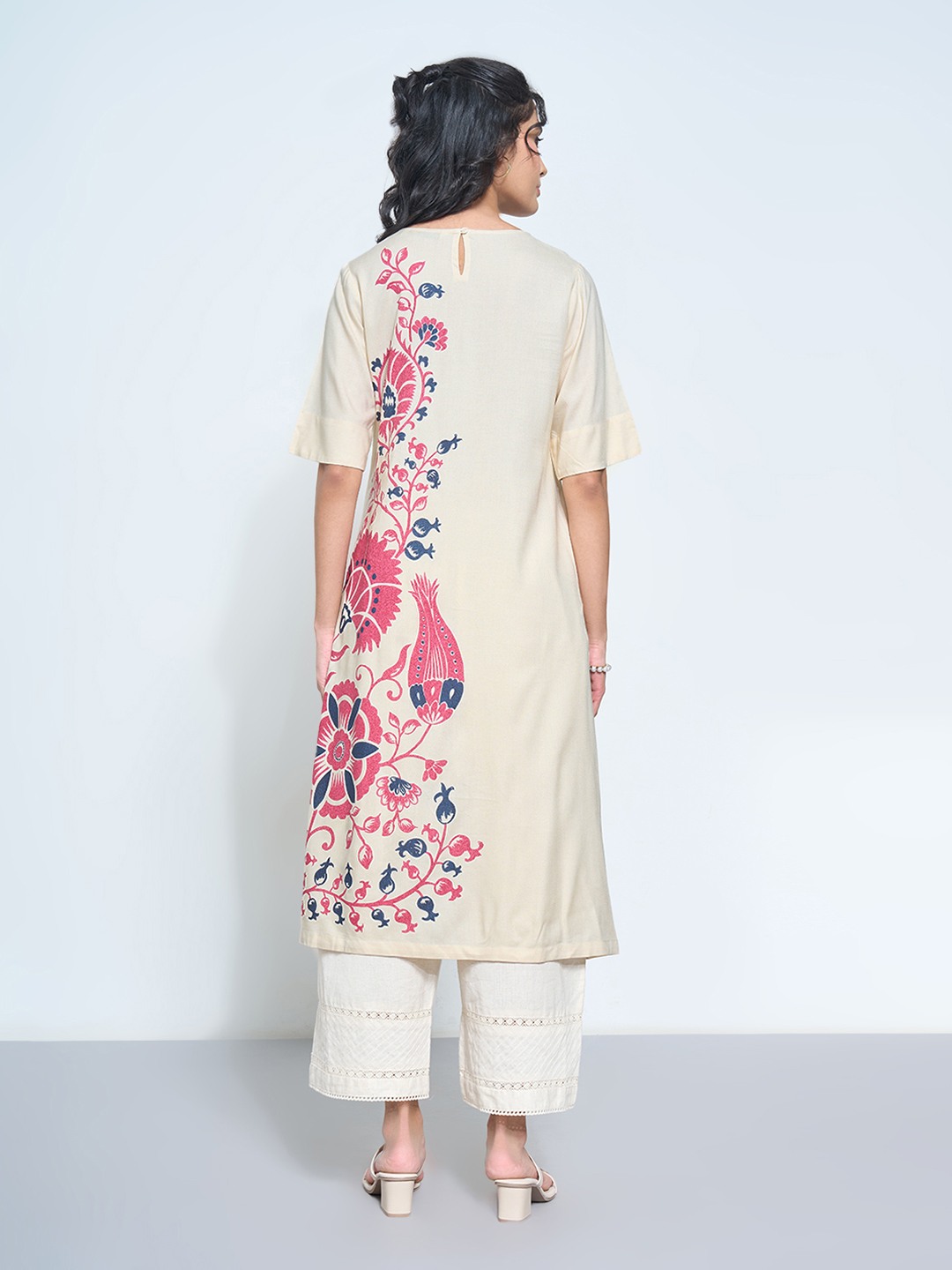 Refreshing and effortless, this kurta showcases a large-scale floral placement print in contrasting tones. Designed with a round neckline, elbow-length sleeves, and side slits for easy movement. The soft woven fabric drapes fluidly, offering everyday comfort with a touch of artistry.