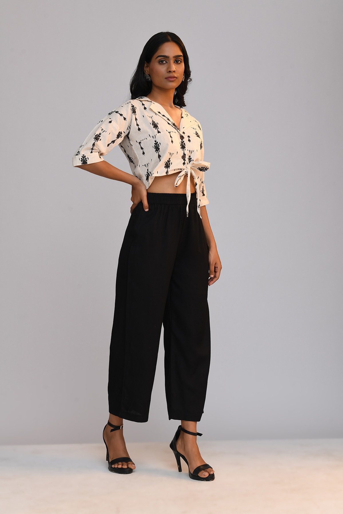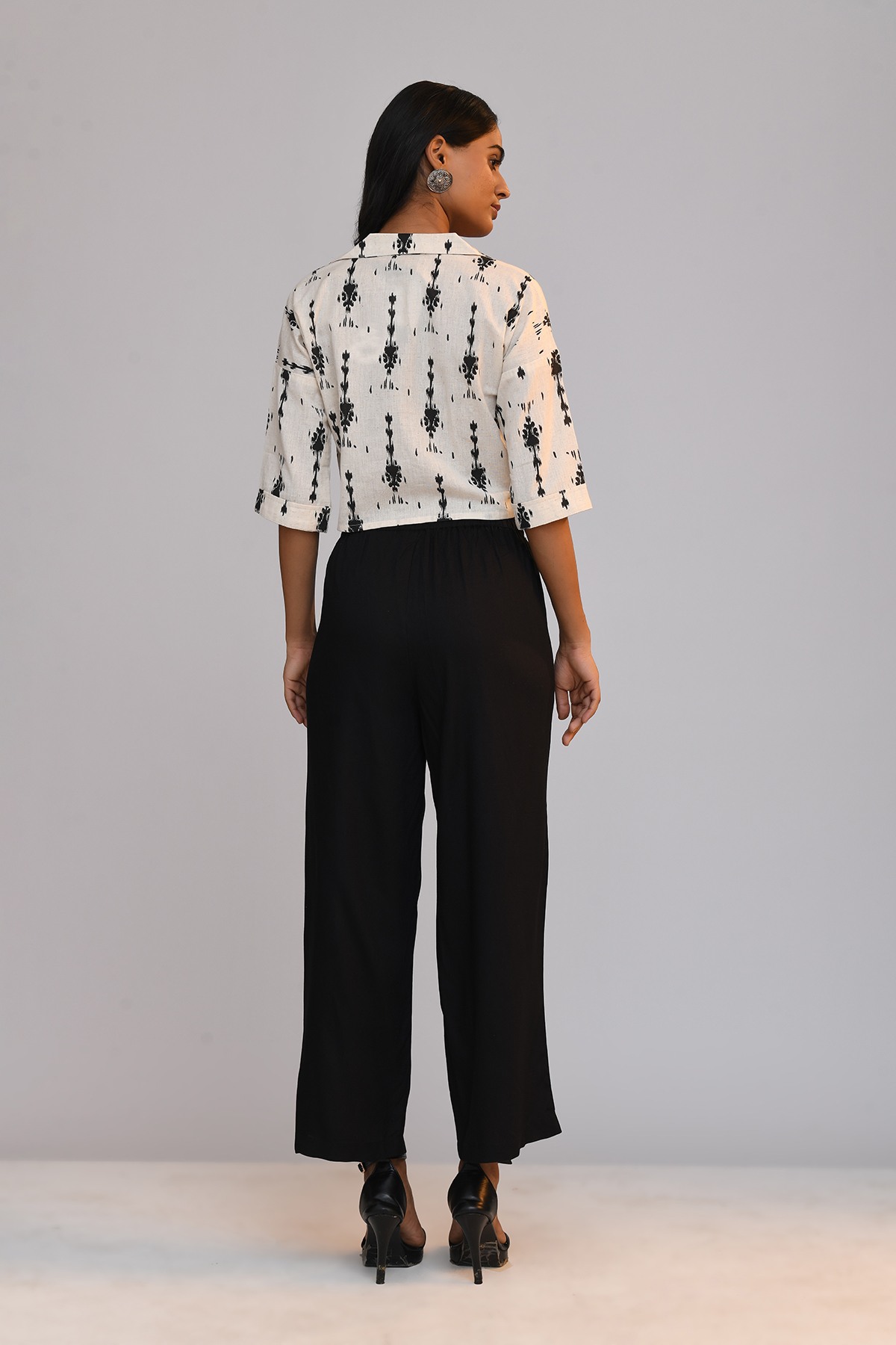 Presenting our chic cream cord set featuring black palazzo pants and a crop top, designed for both style and comfort. the ensemble comes together with a shirt collar neck adorned with a trendy print, adding a fashionable flair to the overall look. the palazzo pants provide a relaxed and contemporary fit, while the crop top adds a touch of modern elegance.