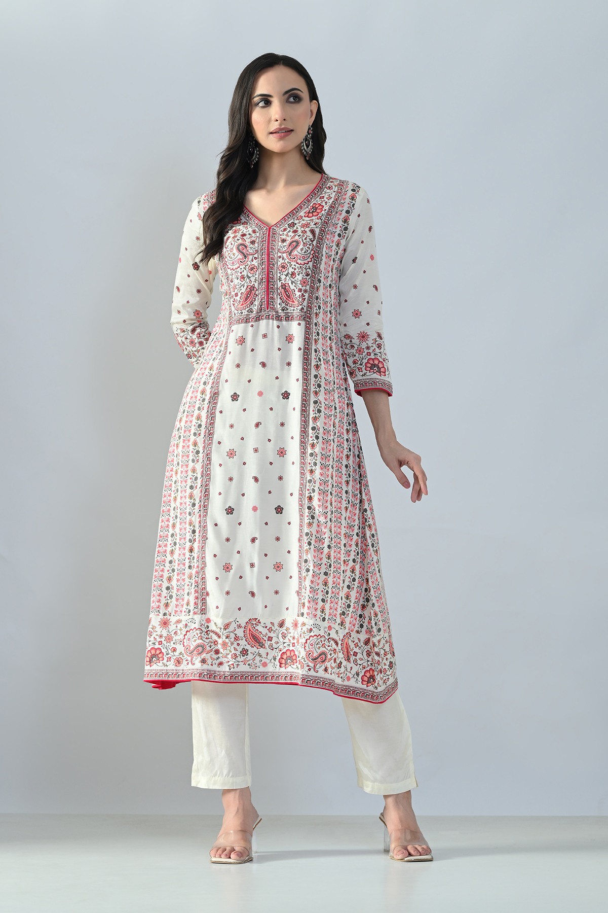 Elegant And Stylish, This Cream Printed Kurta Set Features A V Neck, Three-Quarter Sleeves, And An A-Line Hemline. Paired With Matching Pants And A Dupatta, It Offers Comfort And Sophistication, Perfect For Casual And Semi-Formal Occasions.