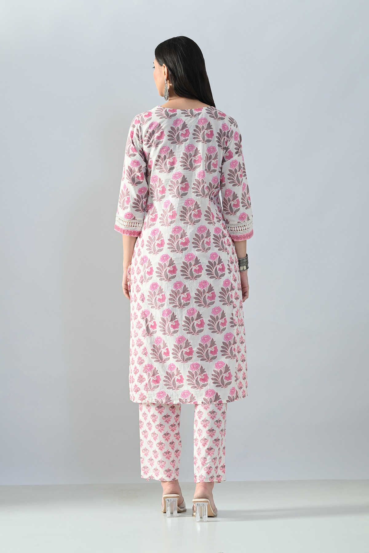 Elevate Your Style With This Elegant Cream Printed Straight-Fit Set. Featuring A V-Neckline, Three-Quarter Sleeves, Side Slits, And A Straight Hemline, This Outfit Offers Both Comfort And Sophistication. Paired With Matching Pant And Dupatta, It’S Perfect For Casual And Semi-Formal Occasions.