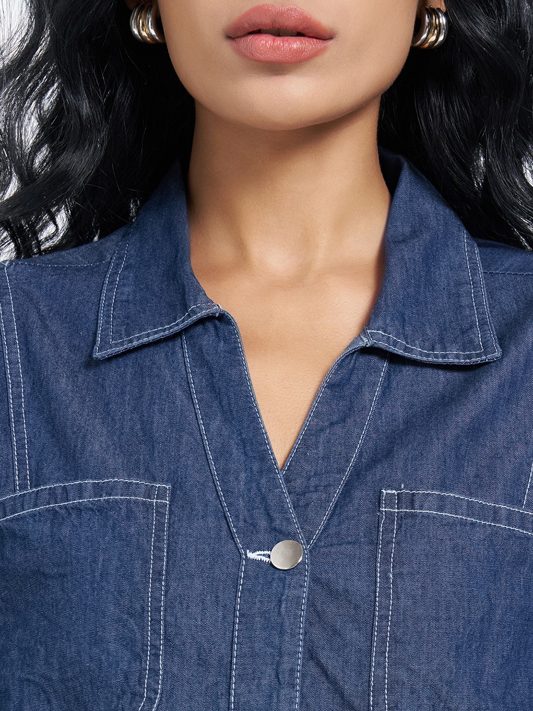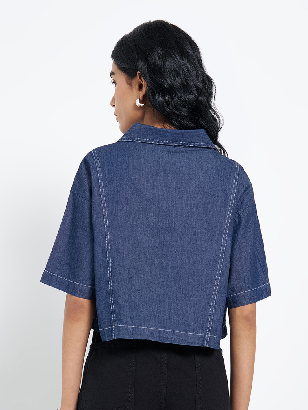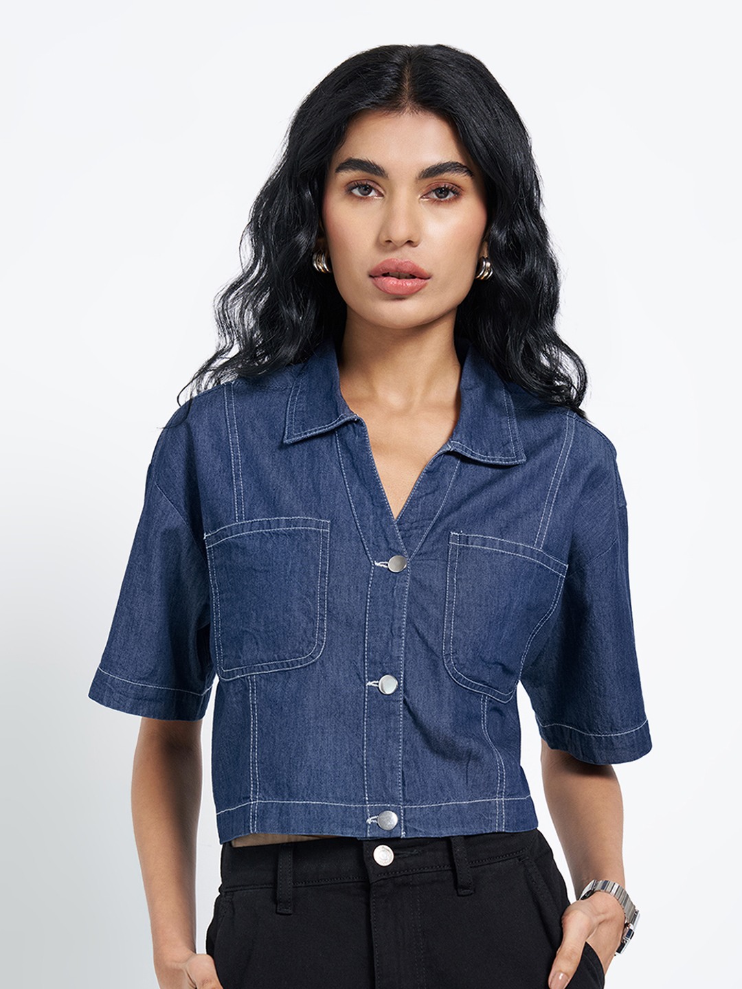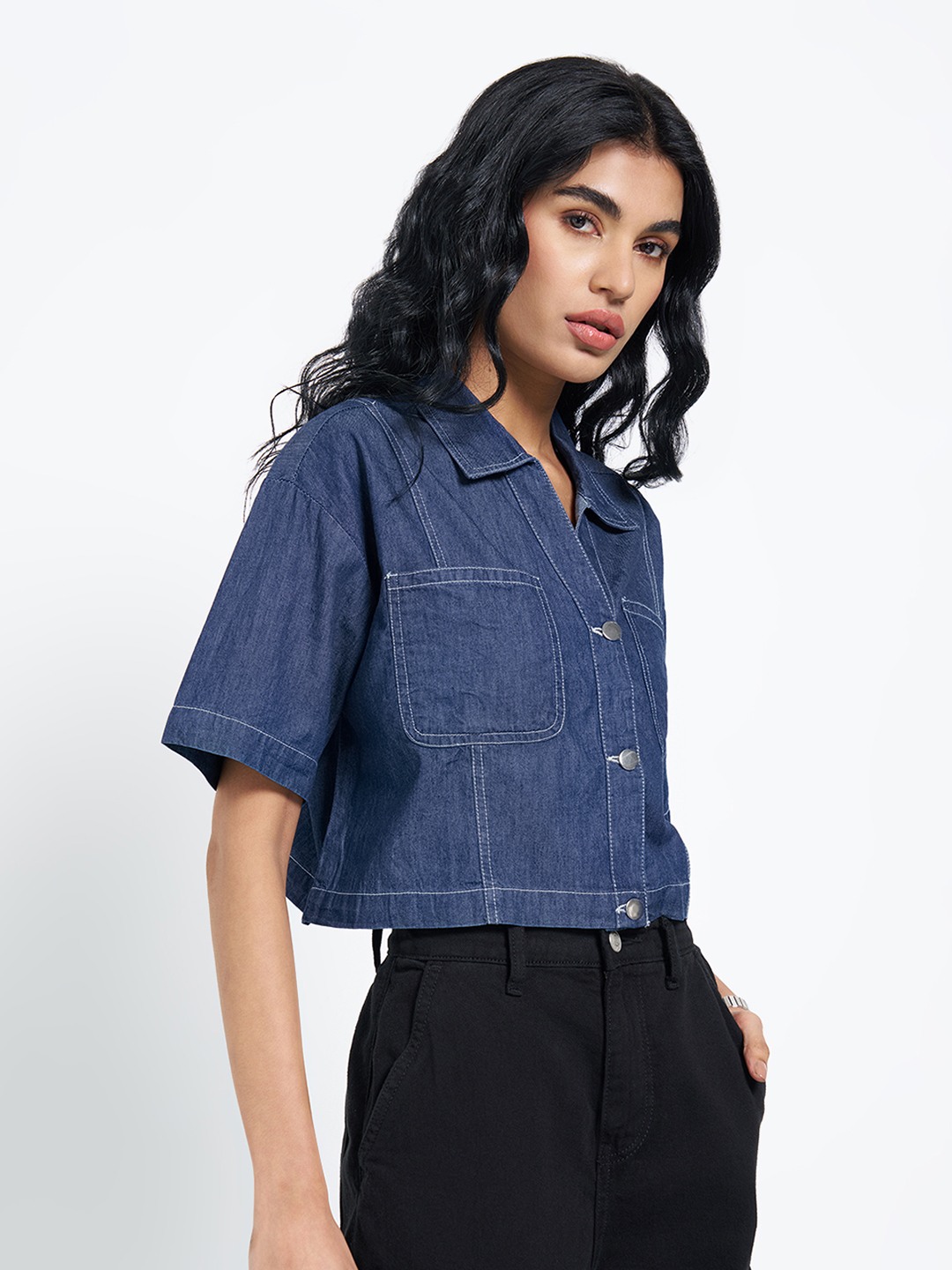 Cut in a structured cropped silhouette, this denim shirt features a sharp collar, half sleeves, metal buttons, and utility-style patch pockets at the chest. Clean seam detailing and a crisp hem keep the look polished while retaining a workwear edge. The compact length makes it ideal for high-rise pairings without feeling bulky.
