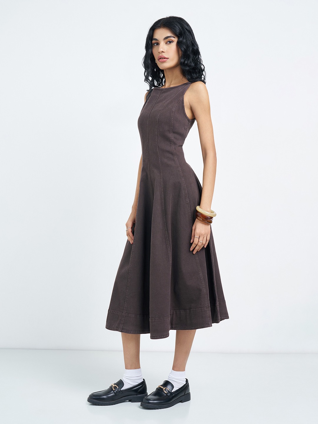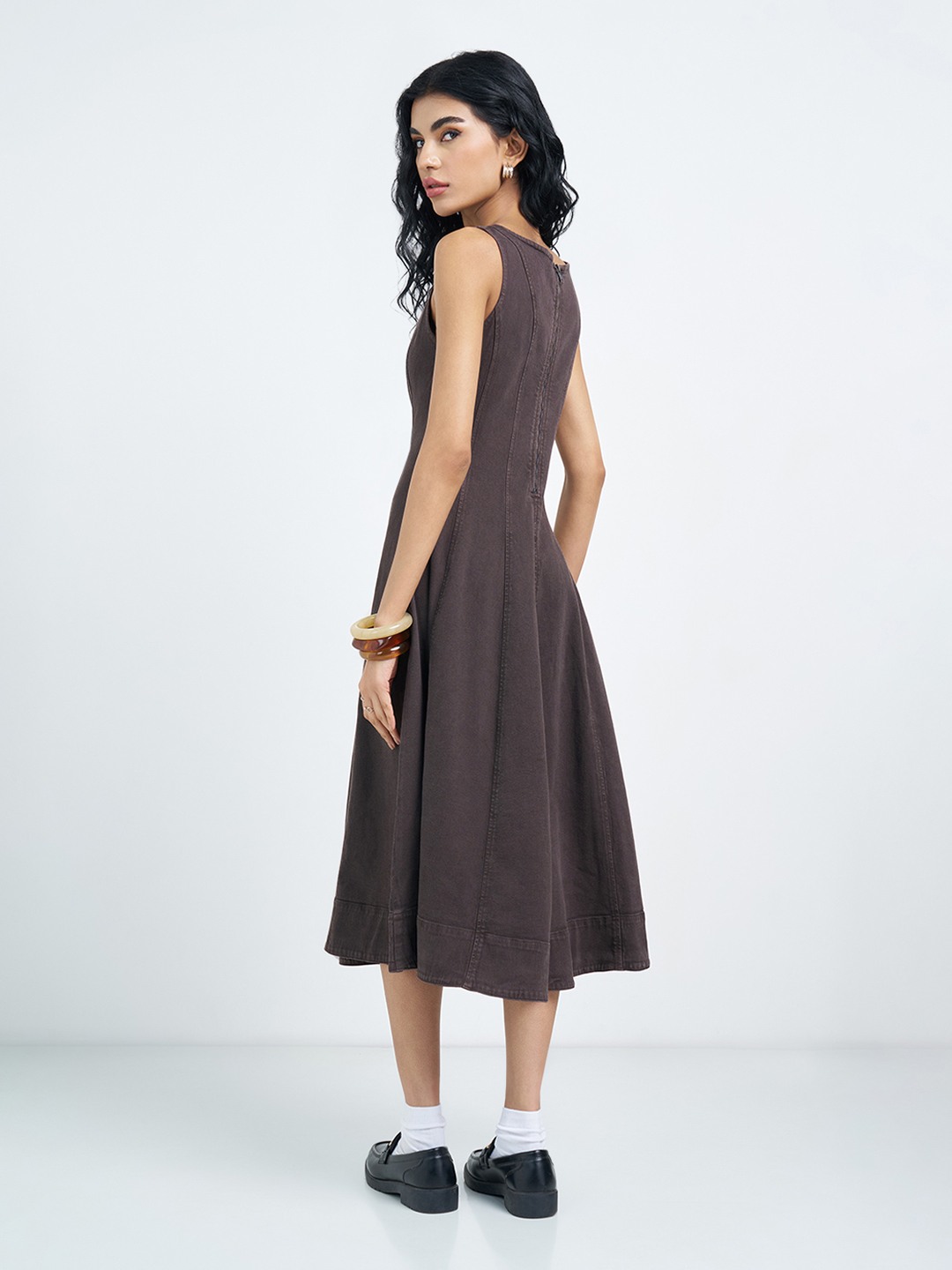 An understated silhouette with a strong, sculpted presence. This sleeveless dress is designed with a round neckline, vertical panel detailing through the bodice and a softly flared skirt that moves with ease. Clean lines and a structured fall give it a refined yet wearable feel.