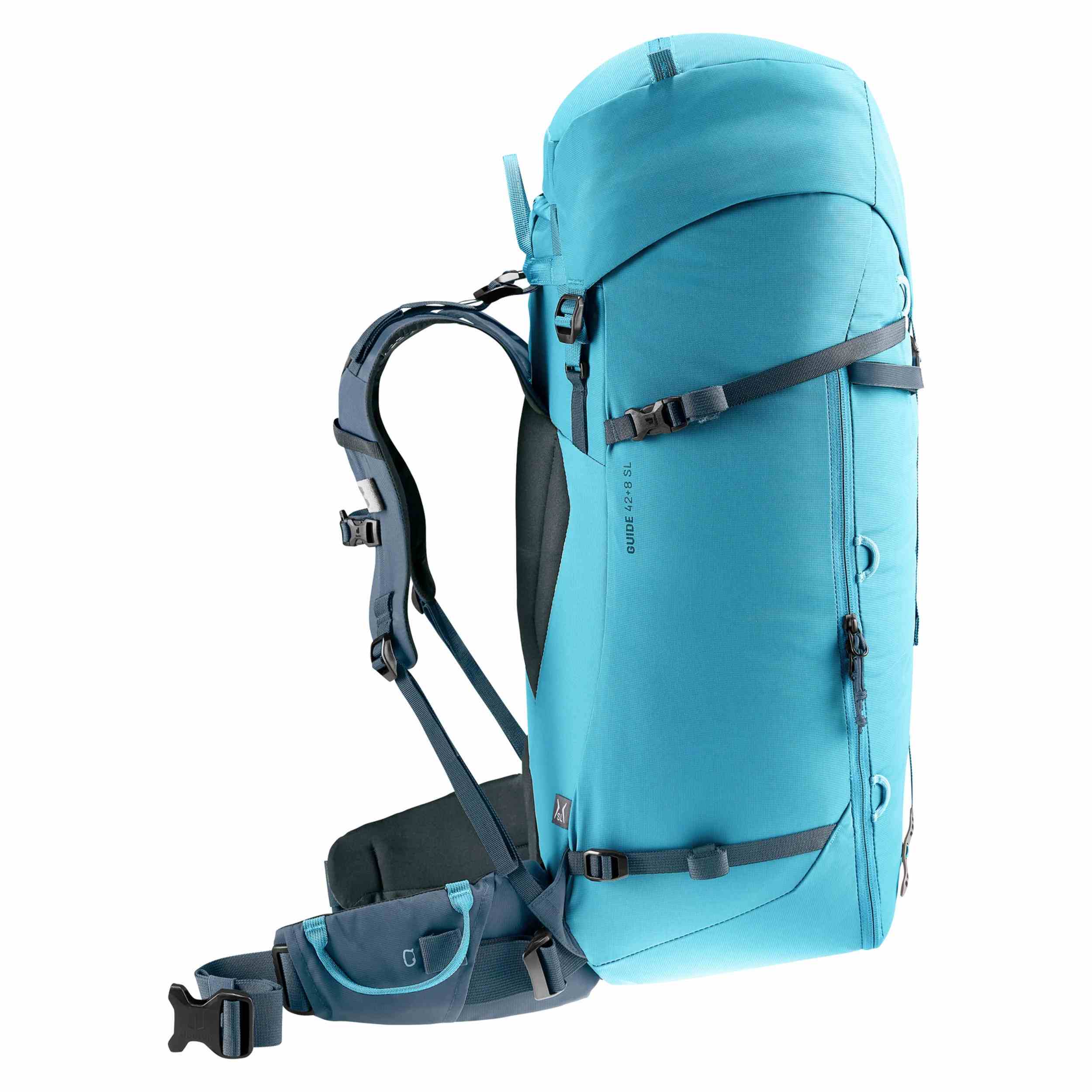 The climate neutral, PFC free Guide SL strikes the perfect balance between light weight, comfort and functionality. The comfortable, well ventilated back system; snug fit that keeps the load close to your center of gravity; ergonomic, detachable hip fins; hard-wearing materials; further improved attachment systems; and stowable rope strap all combine to generate fine-tuned load control and maximum freedom of movement on multi-day alpine projects. The J-shaped front zipper opening also provides quick access to the main compartment.