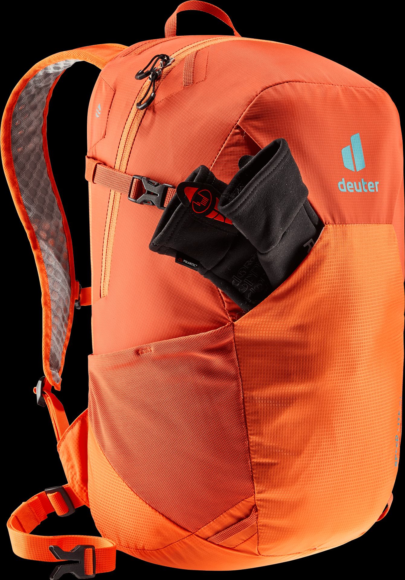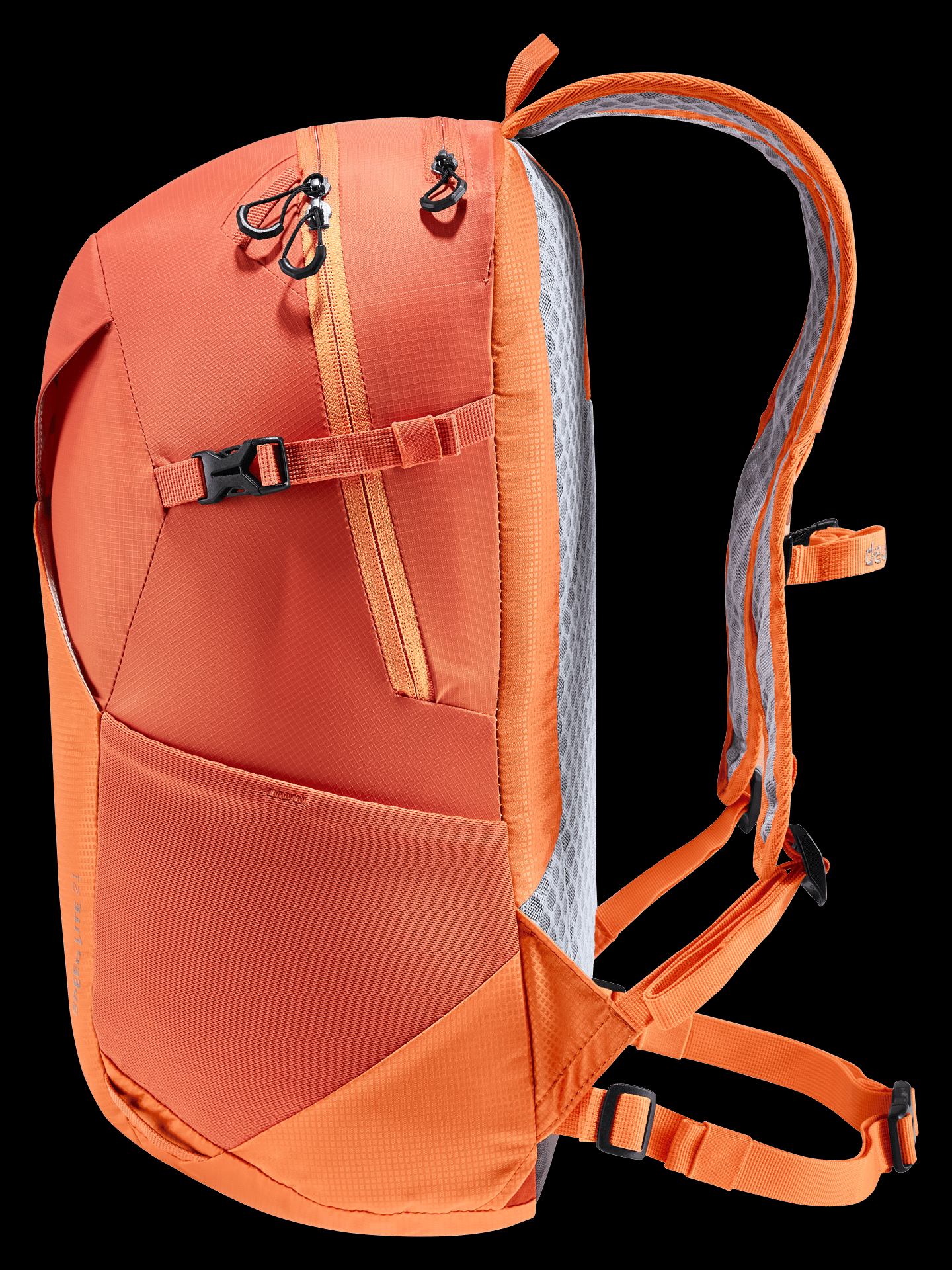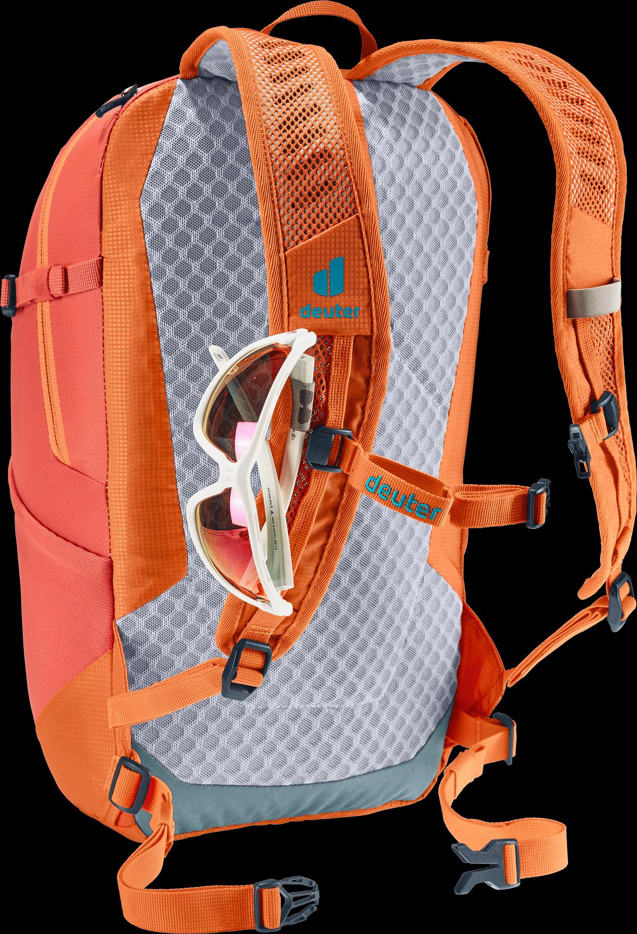 This pack is speedy, light and sustainable thanks to deuter’s Lite back system, ergonomic, perforated shoulder straps, a detachable waist belt, precision-adjustable sternum strap and 100% recycled, bluesign® certified body fabric. Designed for fast-paced hiking, side compression straps effectively reduce load wobble and enable full range of movement. This helps save energy over longer distances too.