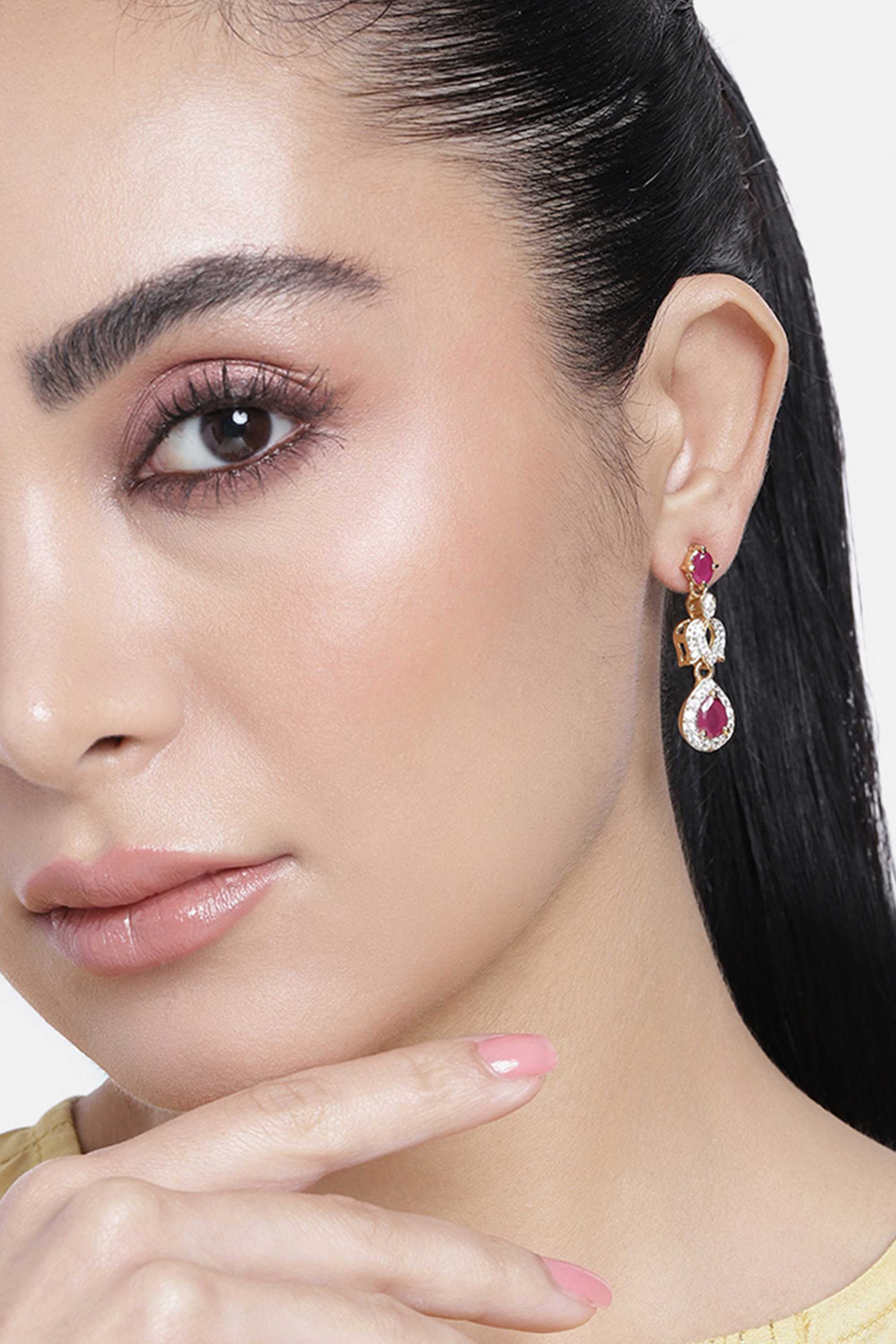 These elegant drop earrings from Estele feature a gold and rhodium plated finish, designed with oval and teardrop-shaped ruby-toned stones at both the top and base. The stones are surrounded by sparkling white accents that add refined brilliance. A delicate floral-inspired connector links the elements, offering a graceful, elongated silhouette. Ideal for festive occasions, traditional attire, and special celebrations, these earrings bring a blend of classic charm and modern sophistication.