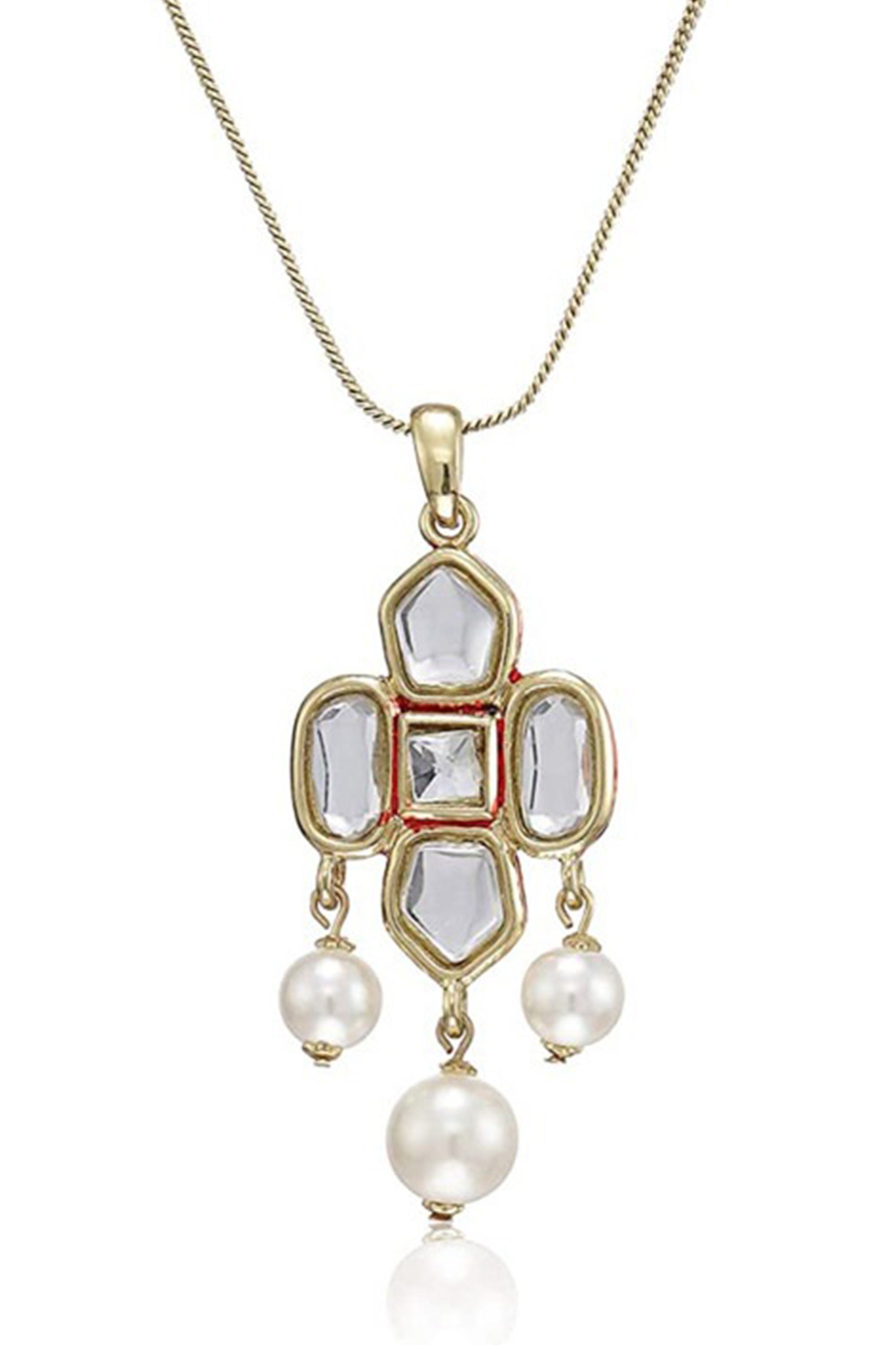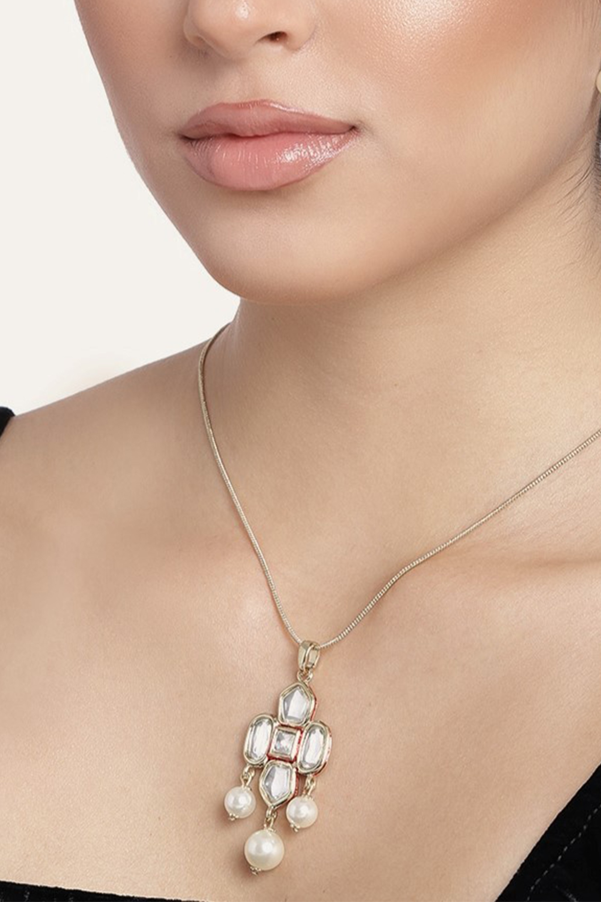 Classic kundan-style pendant set with mirror-finish stones and finished with three graceful pearl danglers on a sleek chain. A timeless pick for weddings, pujas and festive dressing.