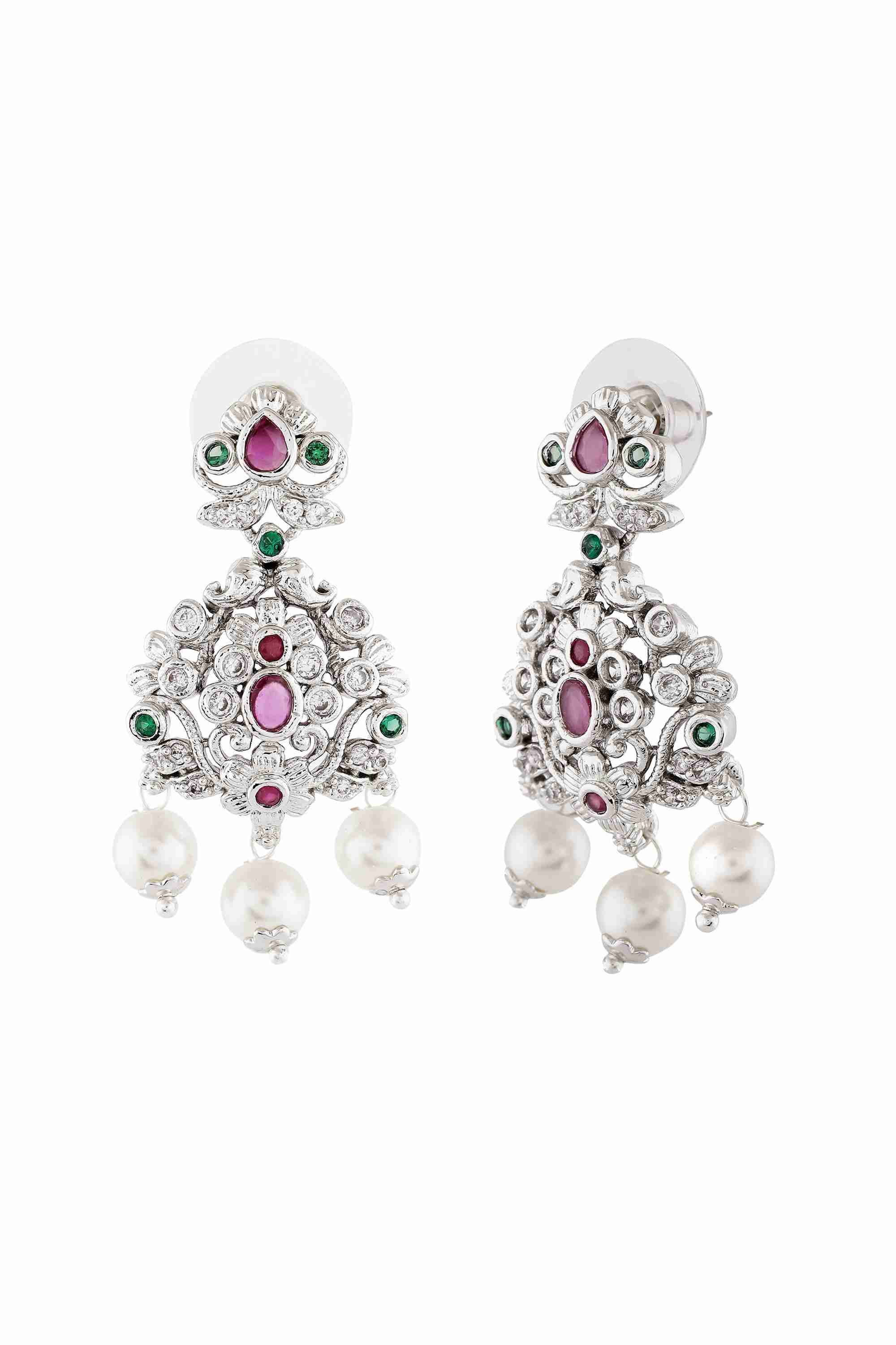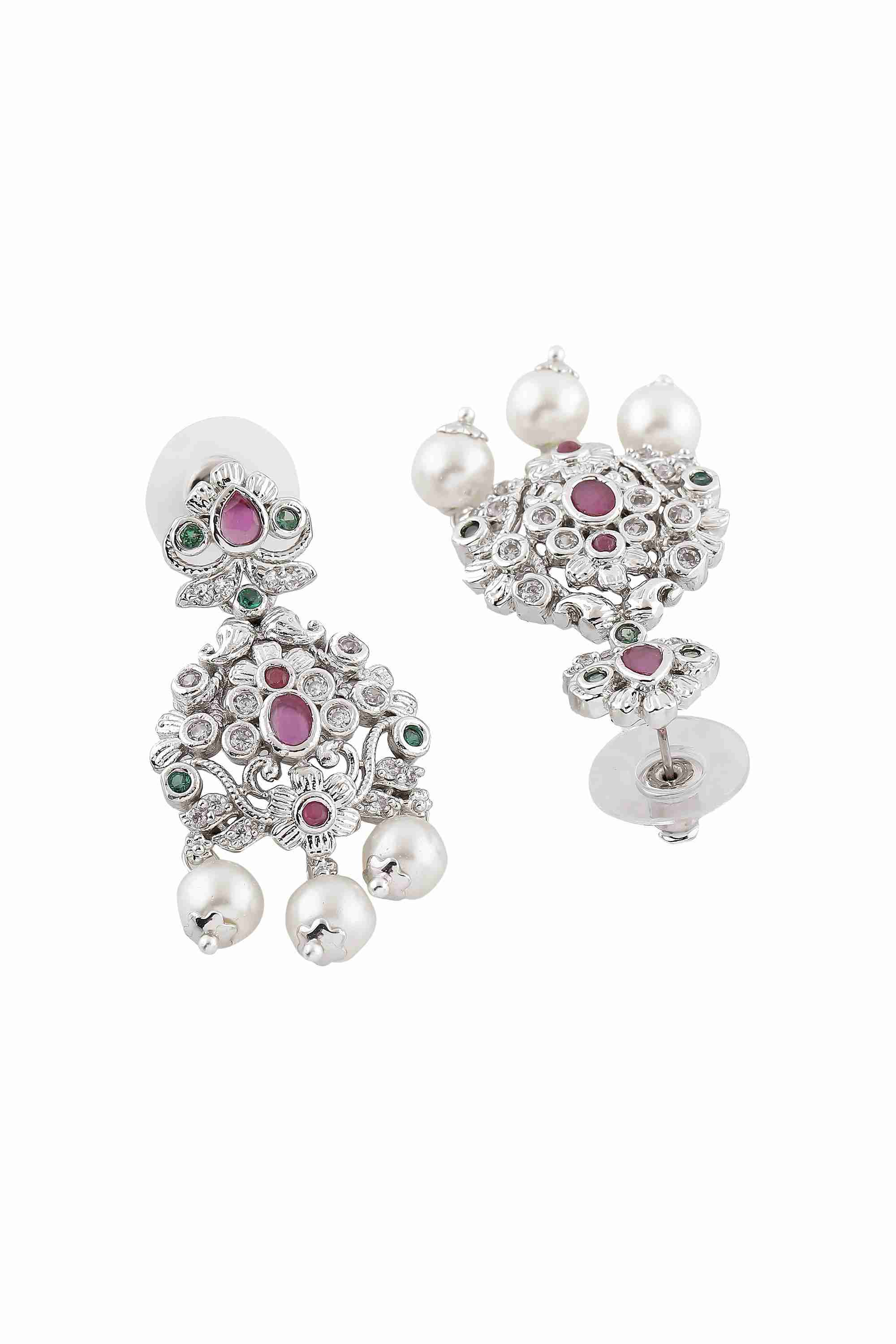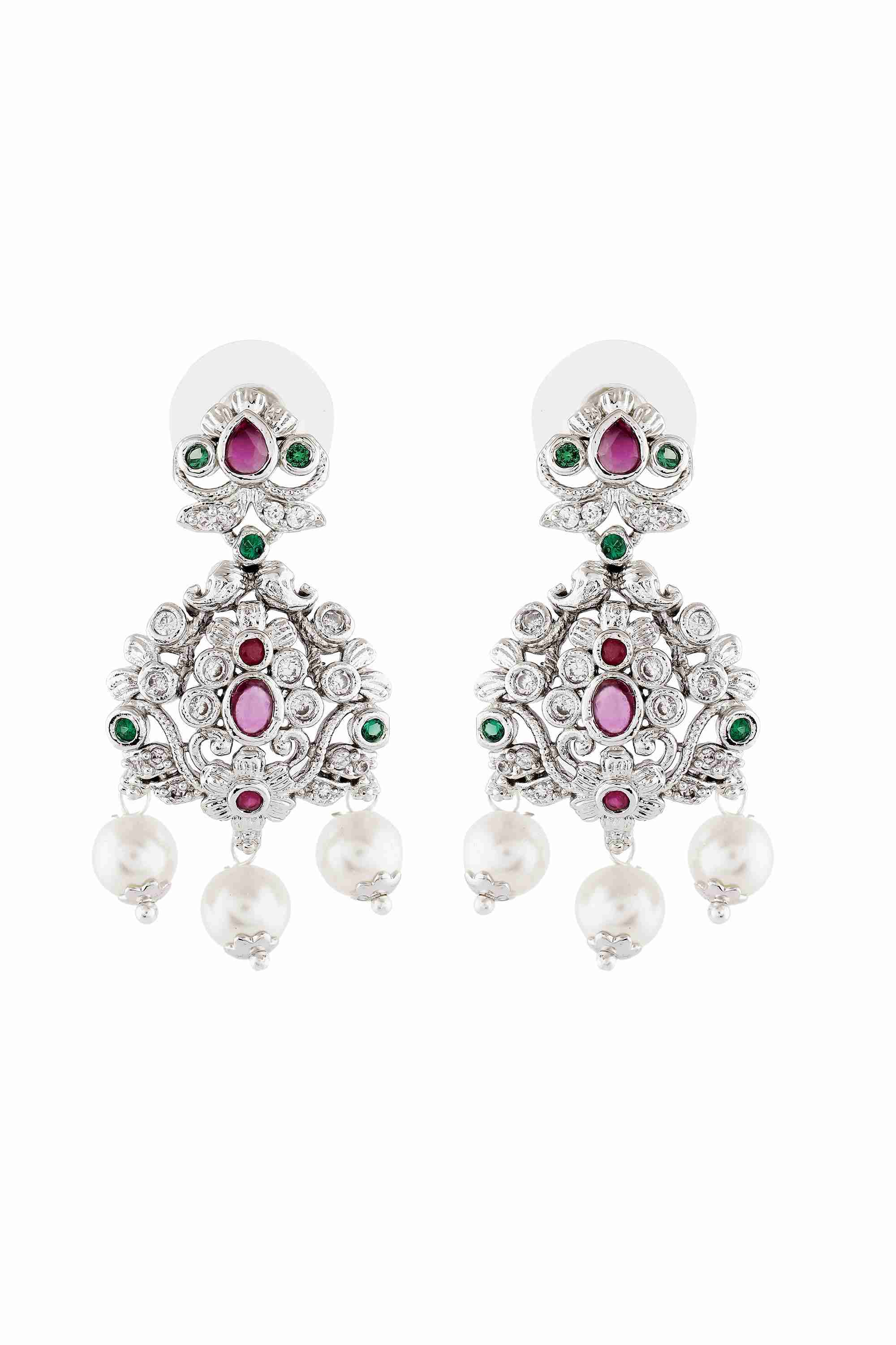 Estele Rhodium Plated American Daimond Traditional Glory Dangle Bridal Earrings with Pearls & Multicolor Stones for Women