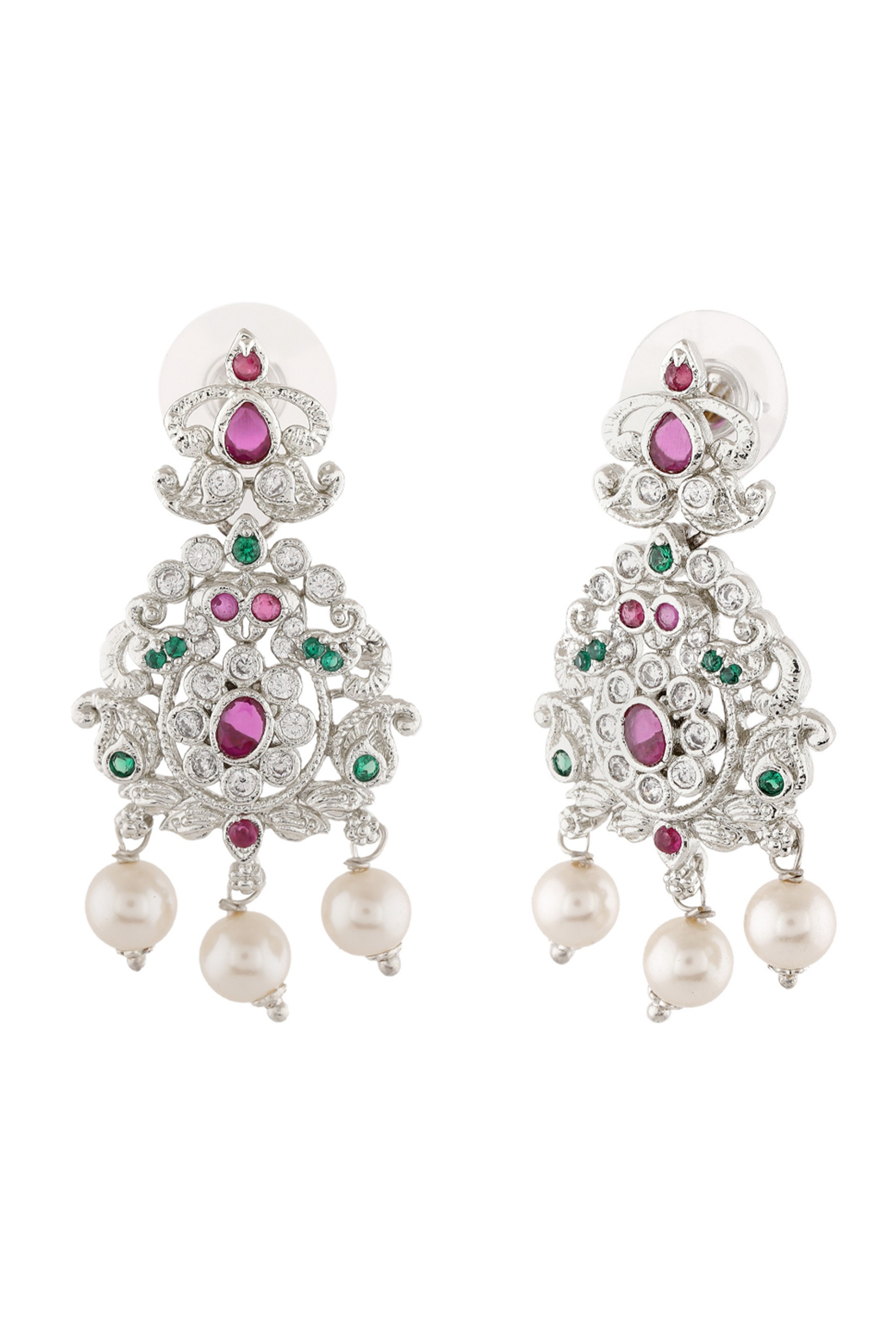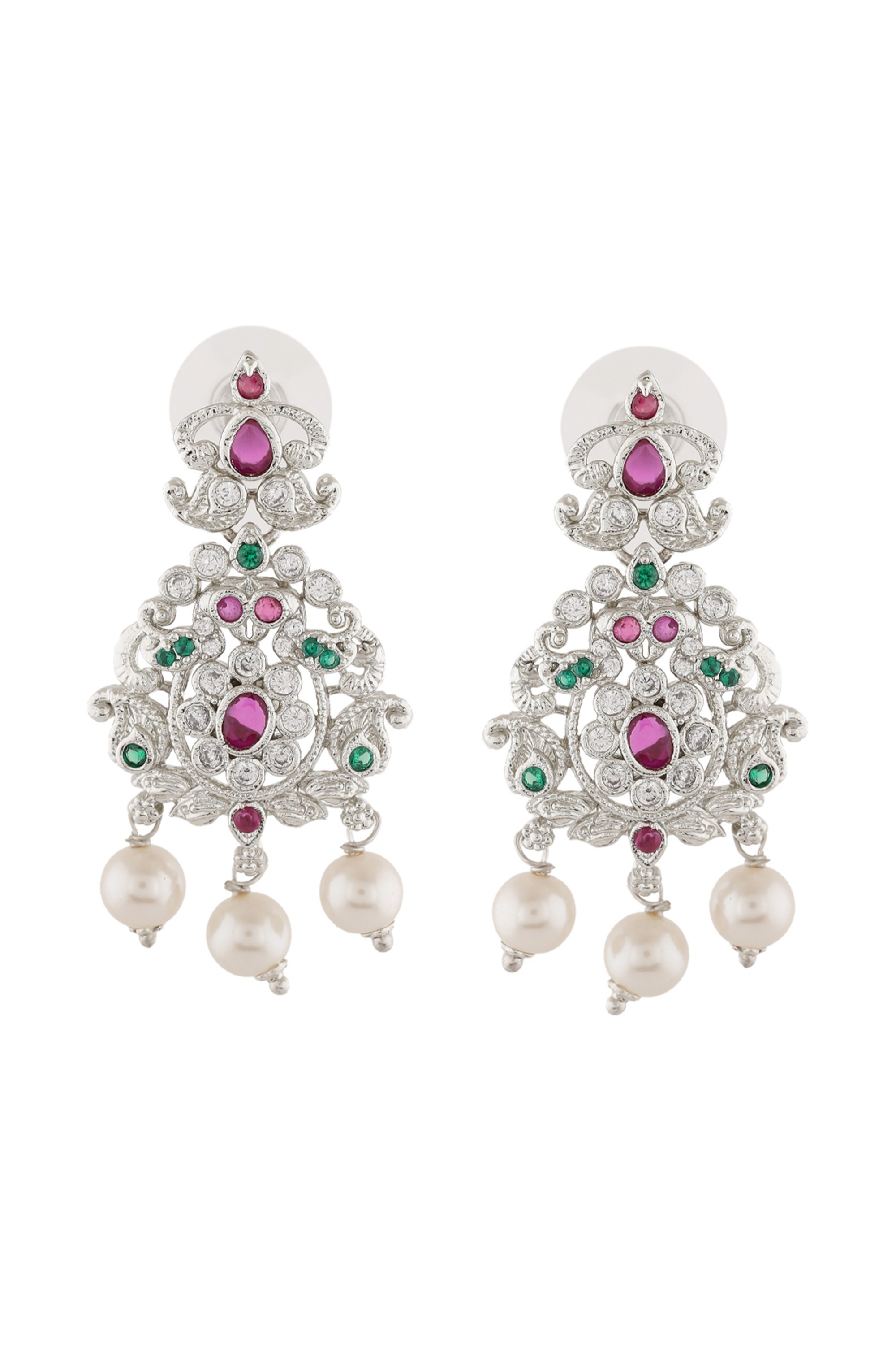 Estele Rhodium Plated American Diamond Captivating Bridal Dangle Earrings with Pearls & Multi-Color Stones for Women