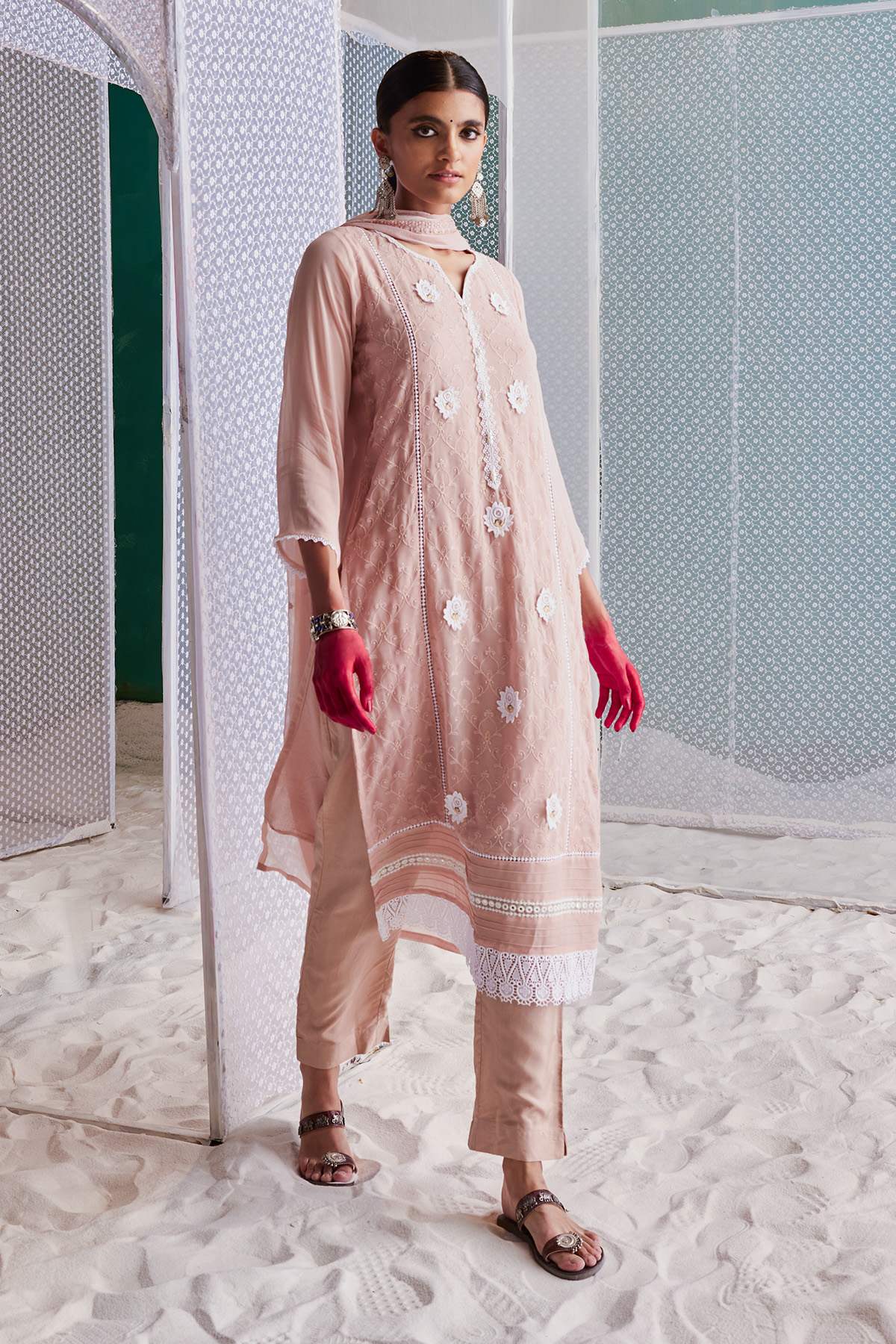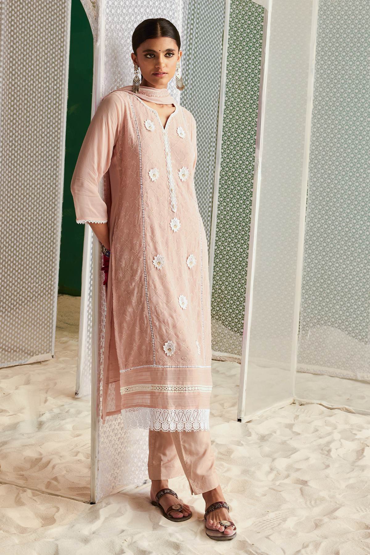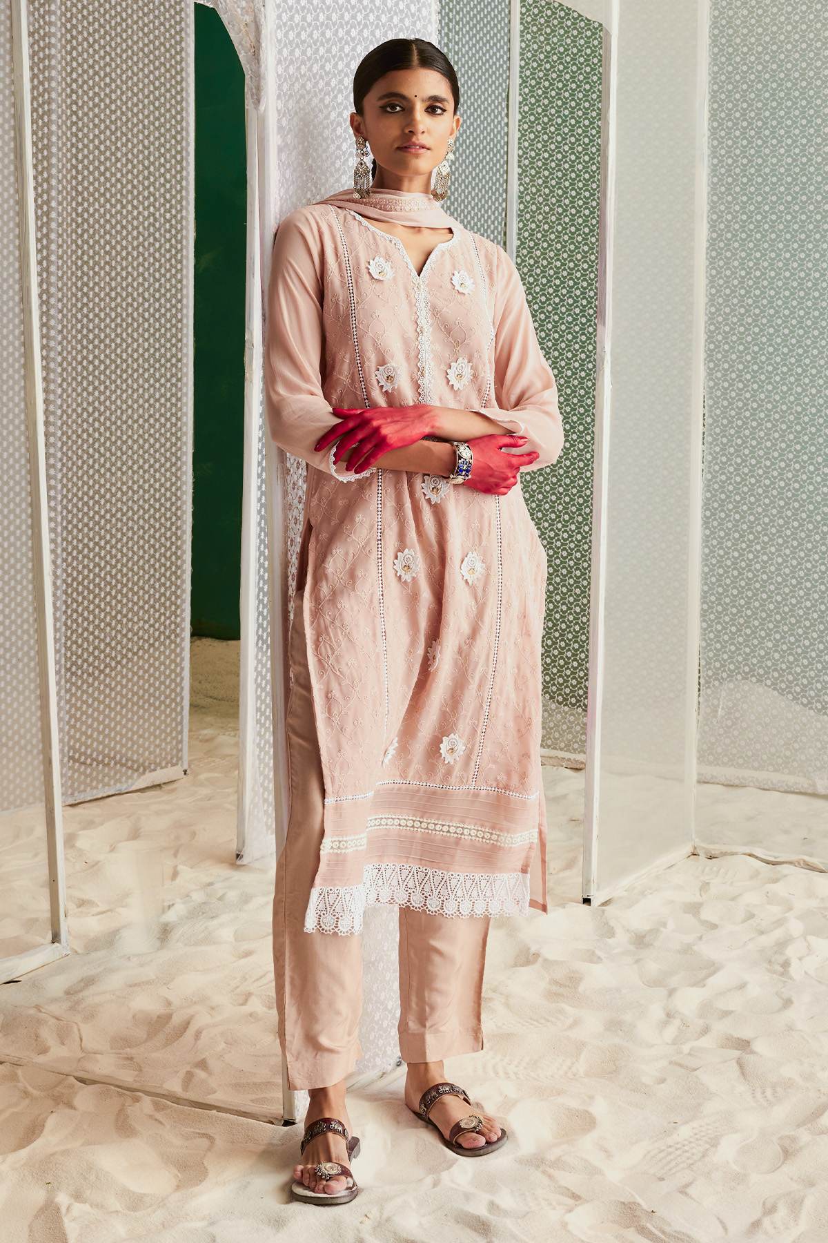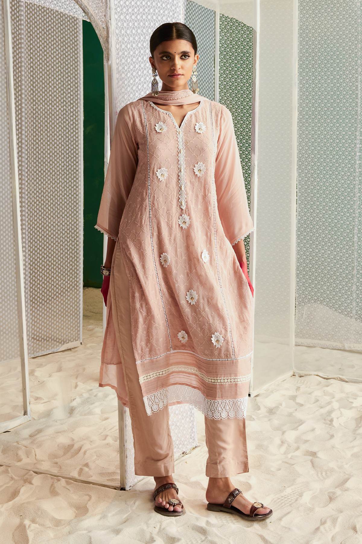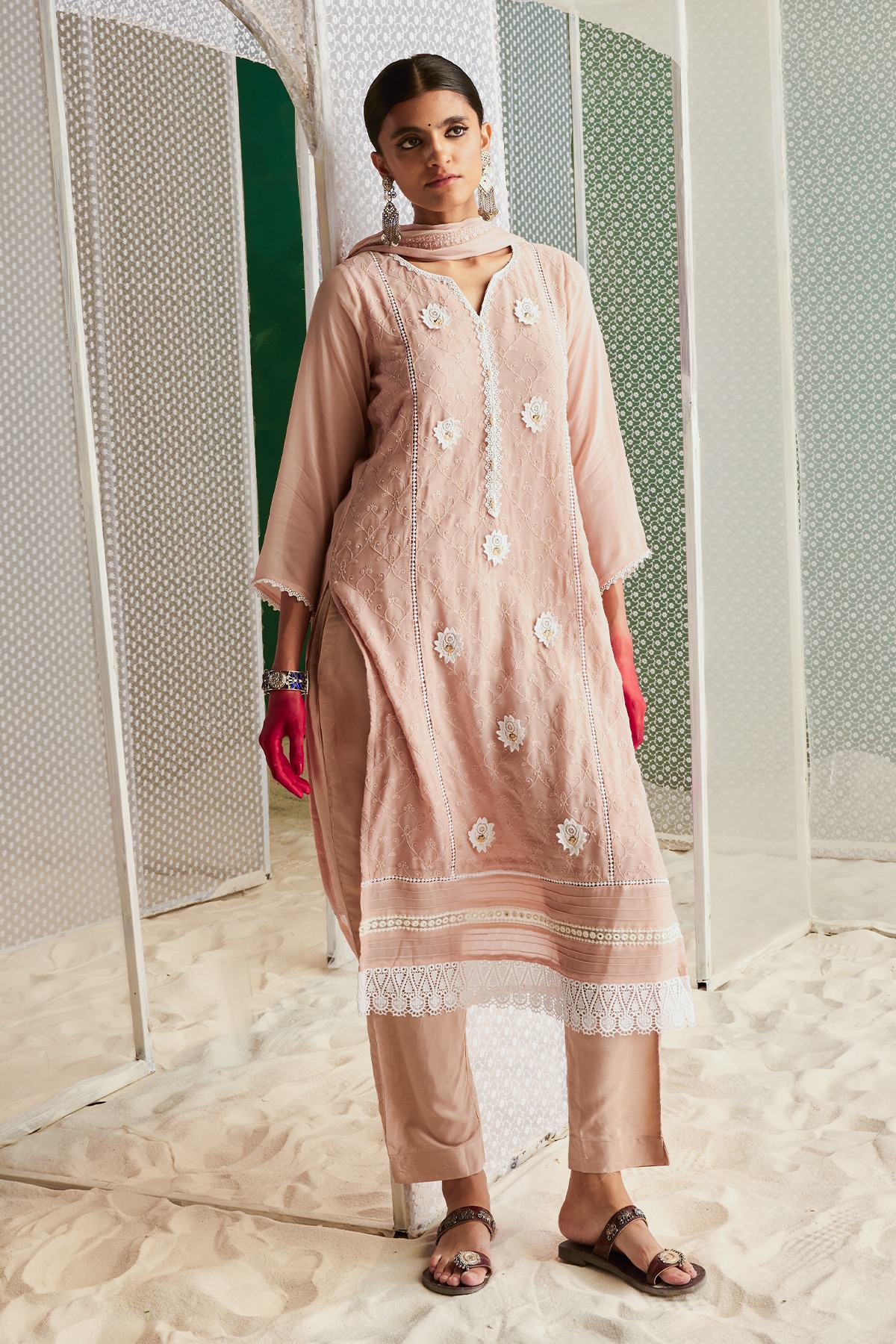 This outfit feature a fawn embroidered straight kurta set! this ensemble includes a kurta with a round neck, three-quarter sleeves, and a straight hemline, paired with matching pant and dupatta. perfect for any occasion, it offers a stylish and comfortable look.