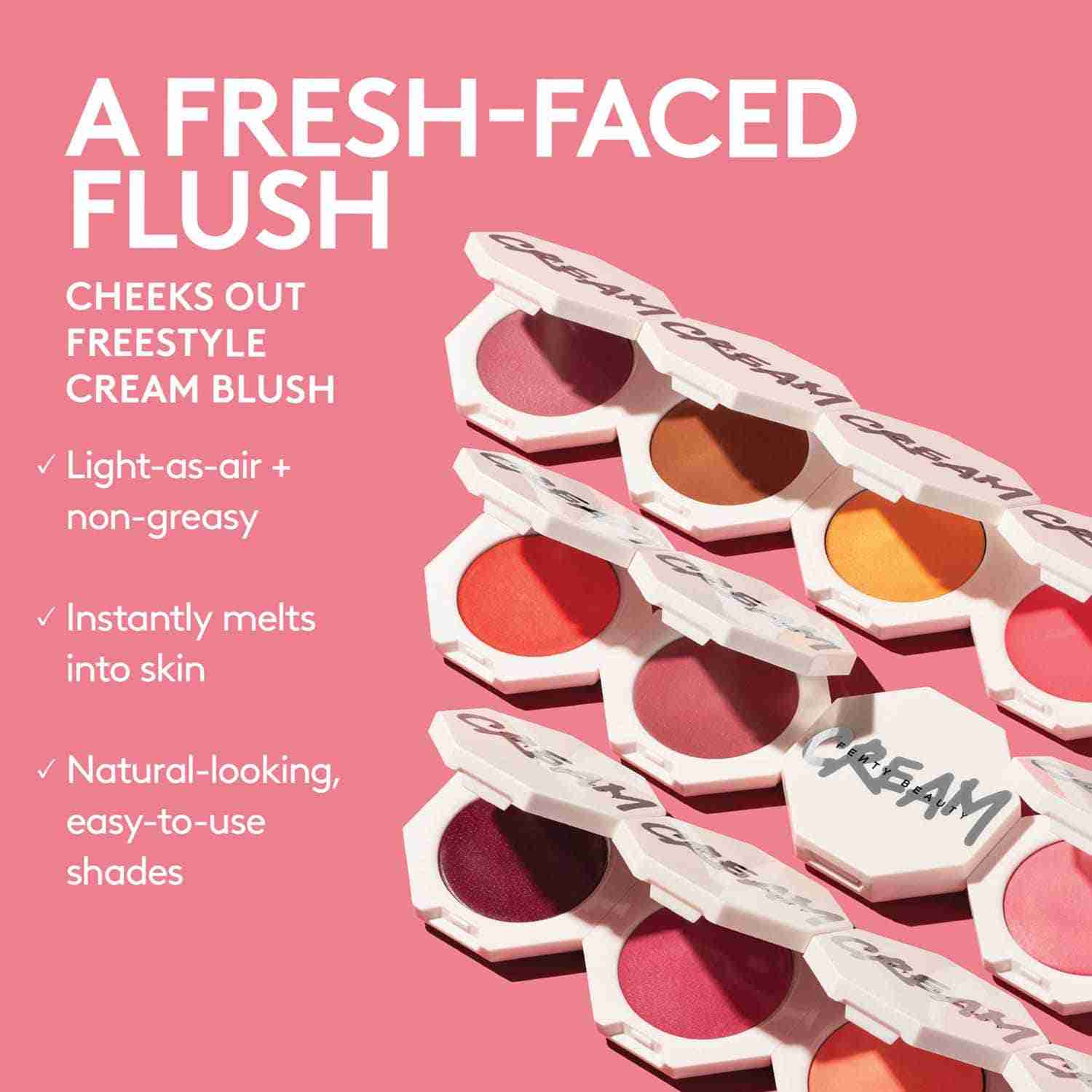 Sculpt and define your cheekbones with the FENTY BEAUTY Cheeks Out Freestyle Cream Blush - Rose Latte (3 g). This smooth blush has a cream-to-skin texture that melts in effortlessly for a soft, healthy glow. With a buildable and blendable formula, the FENTY BEAUTY blush ensures streak-free makeup. Also, this non-greasy blush delivers a fresh pop of color that refreshes your look.