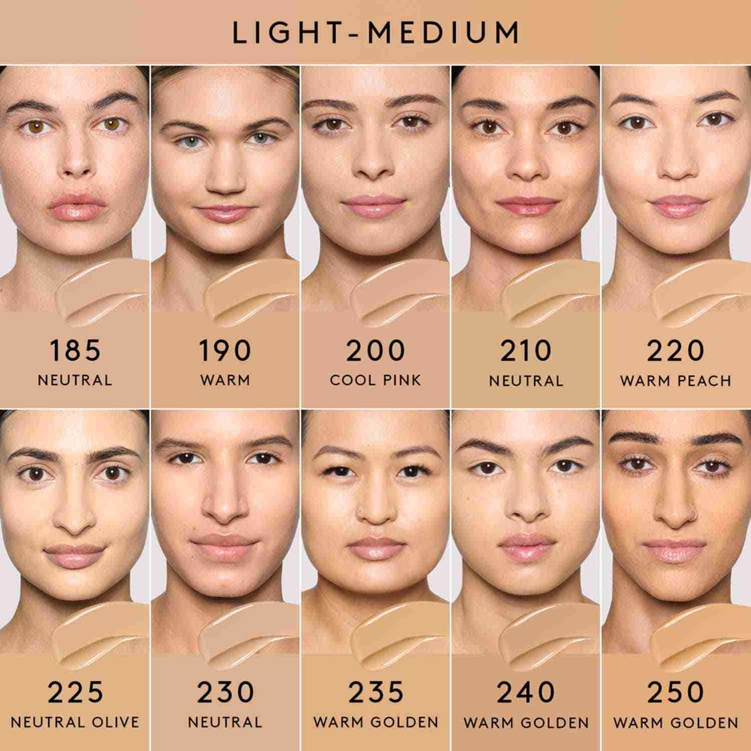 100, 110, 120, 125, 130, 140, 160, 170, 175, 190, 200, 210, 220, 225, 230, 235, 240, 250, 260, 265, 280, 290, 295: Aqua/Water/Eau, Dimethicone, Butylene Glycol Dicaprylate/Dicaprate, Diphenylsiloxy Phenyl Trimethicone, Glycerin, Synthetic Fluorphlogopite, Cetyl Peg/Ppg-10/1 Dimethicone, Trisiloxane, Butylene Glycol, 1,2-Hexanediol, Trimethylsiloxysilicate, Disteardimonium Hectorite, Peg-10 Dimethicone, Polyphenylsilsesquioxane, Magnesium Sulfate, Dimethicone Crosspolymer, Lauroyl Lysine, Triethoxycaprylylsilane, Aluminum Hydroxide, Polyhydroxystearic Acid, Ethylhexyl Palmitate, Isopropyl Myristate, Isostearic Acid, Lecithin, Terminalia Ferdinandiana Fruit Extract, Trisodium Ethylenediamine Disuccinate, Polyglyceryl-3 Polyricinoleate, Cyperus Rotundus Root Extract, Titanium Dioxide (Ci 77891), Iron Oxides (Ci 77491, Ci 77492, Ci 77499).150: Aqua/Water/Eau, Dimethicone, Butylene Glycol Dicaprylate/Dicaprate, Synthetic Fluorphlogopite, Diphenylsiloxy Phenyl Trimethicone, Glycerin, Cetyl Peg/Ppg-10/1 Dimethicone, Trisiloxane, Butylene Glycol, 1,2-Hexanediol, Trimethylsiloxysilicate, Disteardimonium Hectorite, Peg-10 Dimethicone, Polyphenylsilsesquioxane, Magnesium Sulfate, Dimethicone Crosspolymer, Lauroyl Lysine, Triethoxycaprylylsilane, Aluminum Hydroxide, Polyhydroxystearic Acid, Ethylhexyl Palmitate, Isopropyl Myristate, Isostearic Acid, Lecithin, Terminalia Ferdinandiana Fruit Extract, Trisodium Ethylenediamine Disuccinate, Polyglyceryl-3 Polyricinoleate, Cyperus Rotundus Root Extract, Titanium Dioxide (Ci 77891), Iron Oxides (Ci 77491, Ci 77492, Ci 77499).185, 300: Aqua/Water/Eau, Dimethicone, Butylene Glycol Dicaprylate/Dicaprate, Diphenylsiloxy Phenyl Trimethicone, Synthetic Fluorphlogopite, Glycerin, Cetyl Peg/Ppg-10/1 Dimethicone, Trisiloxane, Butylene Glycol, 1,2-Hexanediol, Trimethylsiloxysilicate, Disteardimonium Hectorite, Peg-10 Dimethicone, Polyphenylsilsesquioxane, Magnesium Sulfate, Dimethicone Crosspolymer, Lauroyl Lysine, Triethoxycaprylylsilane, Aluminum Hydroxide, Polyhydroxystearic Acid, Ethylhexyl Palmitate, Isopropyl Myristate, Isostearic Acid, Lecithin, Terminalia Ferdinandiana Fruit Extract, Trisodium Ethylenediamine Disuccinate, Polyglyceryl-3 Polyricinoleate, Cyperus Rotundus Root Extract, Titanium Dioxide (Ci 77891), Iron Oxides (Ci 77491, Ci 77492, Ci 77499).310, 330, 335, 345, 350, 360, 370, 385, 390, 400, 410: Aqua/Water/Eau, Dimethicone, Butylene Glycol Dicaprylate/Dicaprate, Diphenylsiloxy Phenyl Trimethicone, Glycerin, Synthetic Fluorphlogopite, Cetyl Peg/Ppg-10/1 Dimethicone, Trisiloxane, Butylene Glycol, 1,2-Hexanediol, Trimethylsiloxysilicate, Disteardimonium Hectorite, Peg-10 Dimethicone, Polyphenylsilsesquioxane, Magnesium Sulfate, Dimethicone Crosspolymer, Caprylyl Methicone, Lauroyl Lysine, Triethoxycaprylylsilane, Aluminum Hydroxide, Polyhydroxystearic Acid, Ethylhexyl Palmitate, Isopropyl Myristate, Isostearic Acid, Lecithin, Terminalia Ferdinandiana Fruit Extract, Trisodium Ethylenediamine Disuccinate, Polyglyceryl-3 Polyricinoleate, Cyperus Rotundus Root Extract, Titanium Dioxide (Ci 77891), Iron Oxides (Ci 77491, Ci 77492, Ci 77499).315: Aqua/Water/Eau, Dimethicone, Butylene Glycol Dicaprylate/Dicaprate, Diphenylsiloxy Phenyl Trimethicone, Glycerin, Cetyl Peg/Ppg-10/1 Dimethicone, Synthetic Fluorphlogopite, Trisiloxane, Butylene Glycol, 1,2-Hexanediol, Trimethylsiloxysilicate, Disteardimonium Hectorite, Peg-10 Dimethicone, Polyphenylsilsesquioxane, Magnesium Sulfate, Dimethicone Crosspolymer, Caprylyl Methicone, Lauroyl Lysine, Triethoxycaprylylsilane, Aluminum Hydroxide, Polyhydroxystearic Acid, Ethylhexyl Palmitate, Isopropyl Myristate, Isostearic Acid, Lecithin, Terminalia Ferdinandiana Fruit Extract, Trisodium Ethylenediamine Disuccinate, Polyglyceryl-3 Polyricinoleate, Cyperus Rotundus Root Extract, Titanium Dioxide (Ci 77891), Iron Oxides (Ci 77491, Ci 77492, Ci 77499).420: Aqua/Water/Eau, Dimethicone, Butylene Glycol Dicaprylate/Dicaprate, Diphenylsiloxy Phenyl Trimethicone, Glycerin, Cetyl Peg/Ppg-10/1 Dimethicone, Trisiloxane, Butylene Glycol, 1,2-Hexanediol, Trimethylsiloxysilicate, Caprylyl Methicone, Disteardimonium Hectorite, Peg-10 Dimethicone, Synthetic Fluorphlogopite, Polyphenylsilsesquioxane, Magnesium Sulfate, Dimethicone Crosspolymer, Lauroyl Lysine, Triethoxycaprylylsilane, Polyhydroxystearic Acid, Ethylhexyl Palmitate, Isopropyl Myristate, Isostearic Acid, Lecithin, Terminalia Ferdinandiana Fruit Extract, Aluminum Hydroxide, Trisodium Ethylenediamine Disuccinate, Polyglyceryl-3 Polyricinoleate, Cyperus Rotundus Root Extract, Titanium Dioxide (Ci 77891), Iron Oxides (Ci 77491, Ci 77492, Ci 77499).430: Aqua/Water/Eau, Dimethicone, Butylene Glycol Dicaprylate/Dicaprate, Diphenylsiloxy Phenyl Trimethicone, Glycerin, Cetyl Peg/Ppg-10/1 Dimethicone, Trisiloxane, Butylene Glycol, 1,2-Hexanediol, Synthetic Fluorphlogopite, Trimethylsiloxysilicate, Caprylyl Methicone, Disteardimonium Hectorite, Peg-10 Dimethicone, Polyphenylsilsesquioxane, Magnesium Sulfate, Dimethicone Crosspolymer, Lauroyl Lysine, Triethoxycaprylylsilane, Polyhydroxystearic Acid, Ethylhexyl Palmitate, Isopropyl Myristate, Isostearic Acid, Lecithin, Terminalia Ferdinandiana Fruit Extract, Trisodium Ethylenediamine Disuccinate, Polyglyceryl-3 Polyricinoleate, Cyperus Rotundus Root Extract, Iron Oxides (Ci 77491, Ci 77492, Ci 77499).425, 440, 450, 485, 490, 495: Aqua/Water/Eau, Dimethicone, Butylene Glycol Dicaprylate/Dicaprate, Diphenylsiloxy Phenyl Trimethicone, Glycerin, Cetyl Peg/Ppg-10/1 Dimethicone, Trisiloxane, Butylene Glycol, Synthetic Fluorphlogopite, 1,2-Hexanediol, Trimethylsiloxysilicate, Caprylyl Methicone, Disteardimonium Hectorite, Peg-10 Dimethicone, Polyphenylsilsesquioxane, Magnesium Sulfate, Dimethicone Crosspolymer, Lauroyl Lysine, Triethoxycaprylylsilane, Polyhydroxystearic Acid, Ethylhexyl Palmitate, Isopropyl Myristate, Isostearic Acid, Lecithin, Terminalia Ferdinandiana Fruit Extract, Trisodium Ethylenediamine Disuccinate, Polyglyceryl-3 Pol