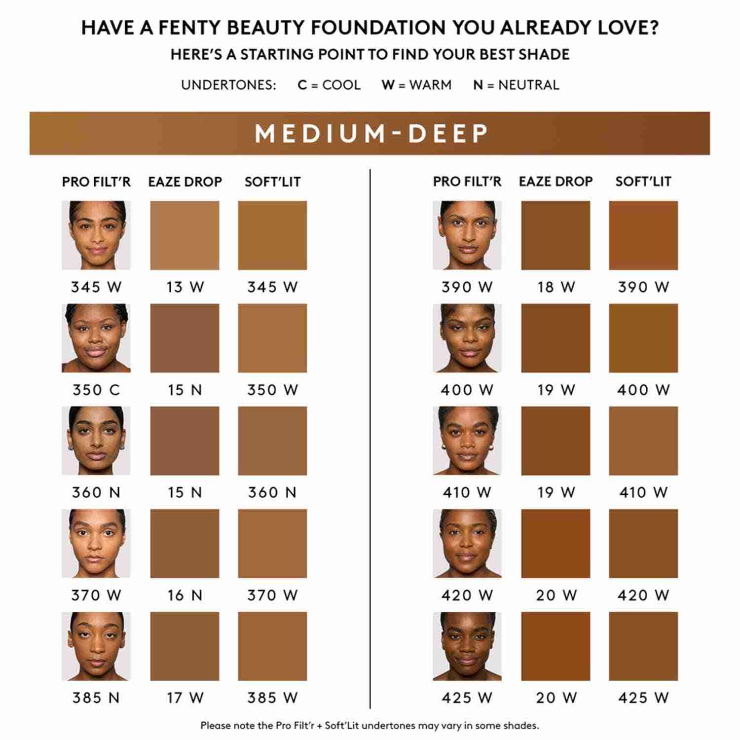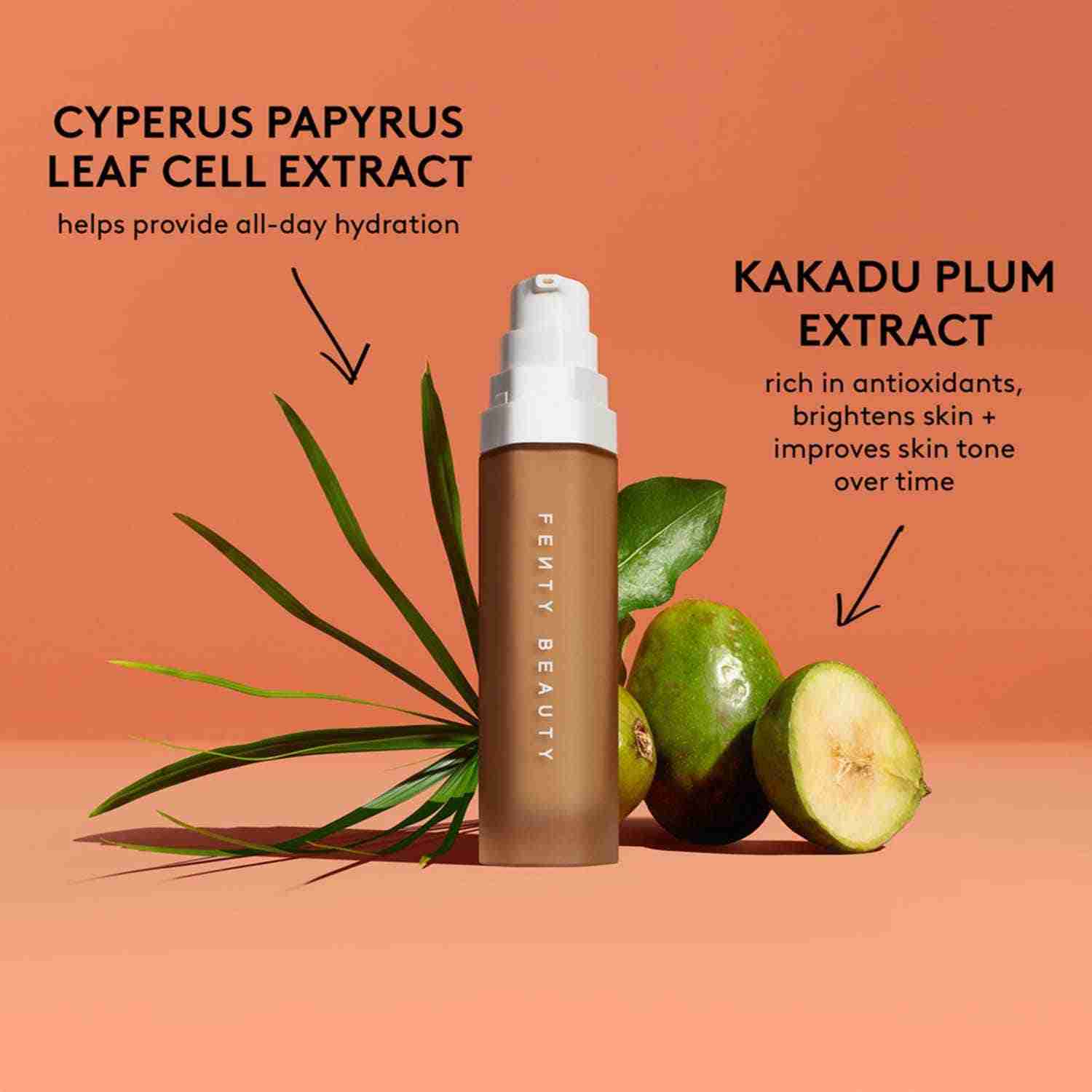 Level up your base routine with the FENTY BEAUTY Soft'Lit Naturally Luminous Foundation - 390 (32 ml). This medium-coverage foundation evens out tone while hydrating and brightening the skin from within. Infused with kakadu plum and papyrus leaf extract, this nourishing foundation works to improve skin over time. Also, this FENTY BEAUTY lightweight foundation resists sweat, humidity, and transfer, ensuring a complexion that stays fresh all day.