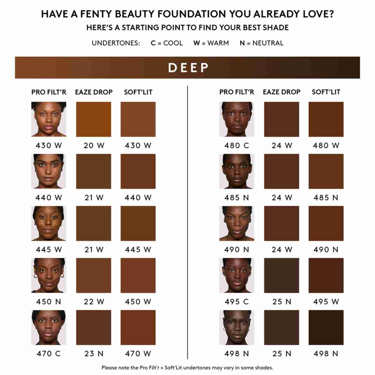 Build your perfect glow with the FENTY BEAUTY Soft'Lit Naturally Luminous Foundation - 490 (32 ml). This medium-coverage foundation evens out tone while hydrating and brightening the skin from within. Infused with kakadu plum and papyrus leaf extract, this nourishing foundation works to improve skin over time. Also, this FENTY BEAUTY lightweight foundation resists sweat, humidity, and transfer, ensuring a complexion that stays fresh all day.