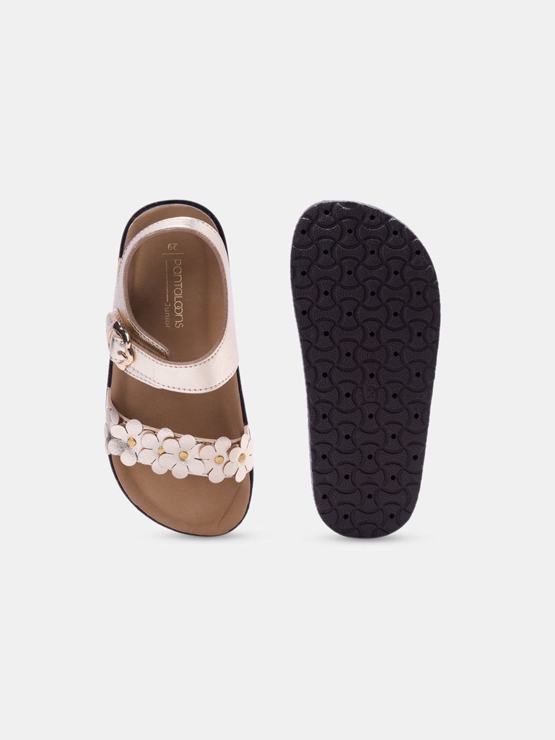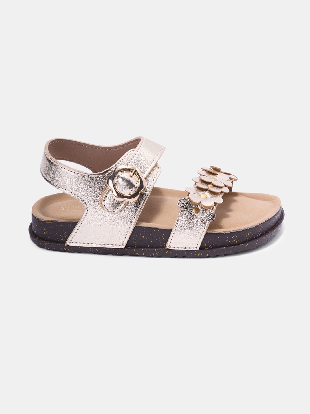 Let em sparkle with every step in these gold sandals topped with playful daisy details. Featuring double straps, a metallic ankle buckle, and a cushioned footbed, they combine charm with comfort. Light, secure, and festive-ready, they’re perfect for dressing up young angels.