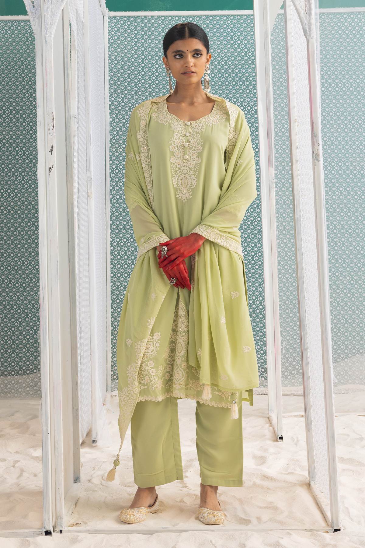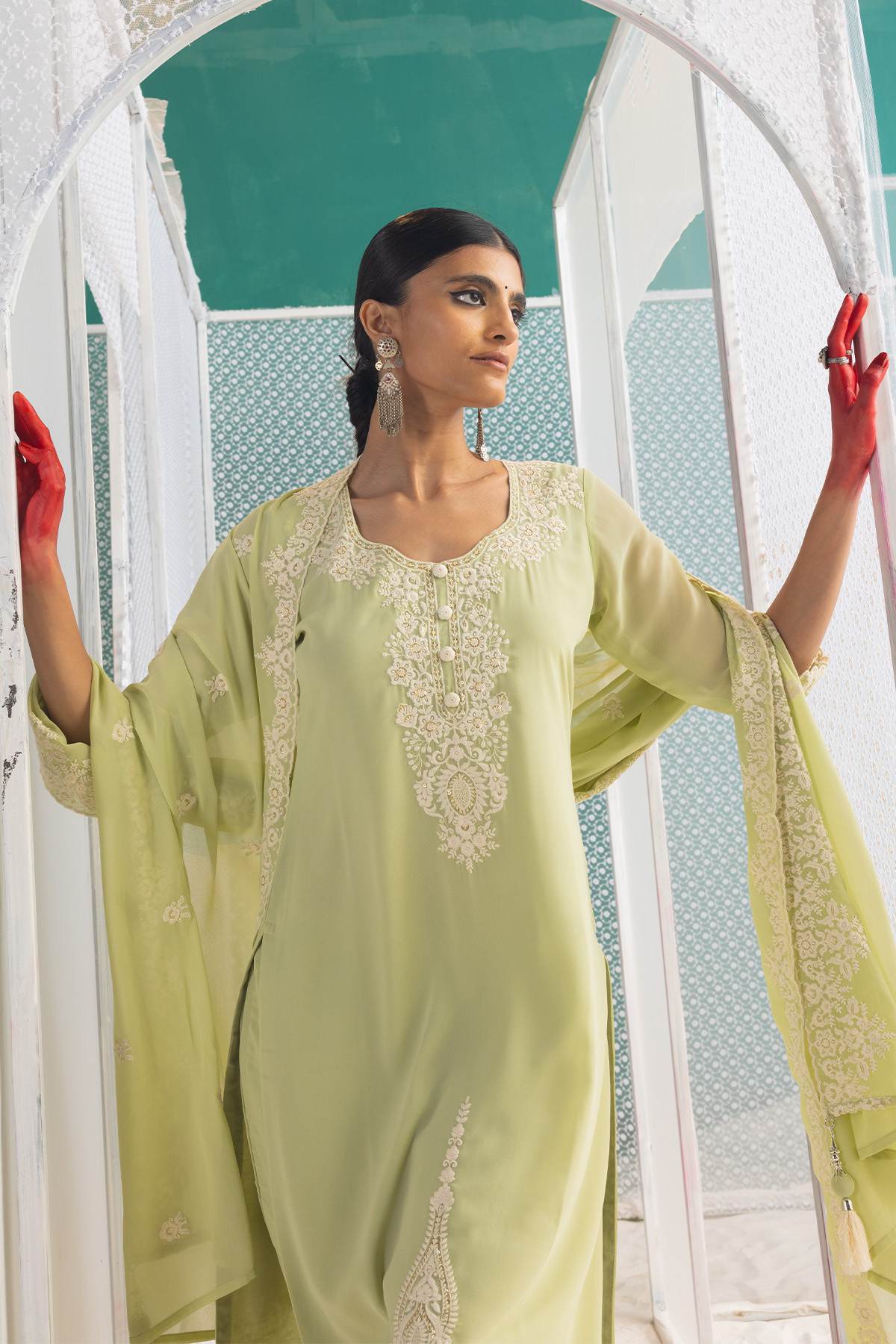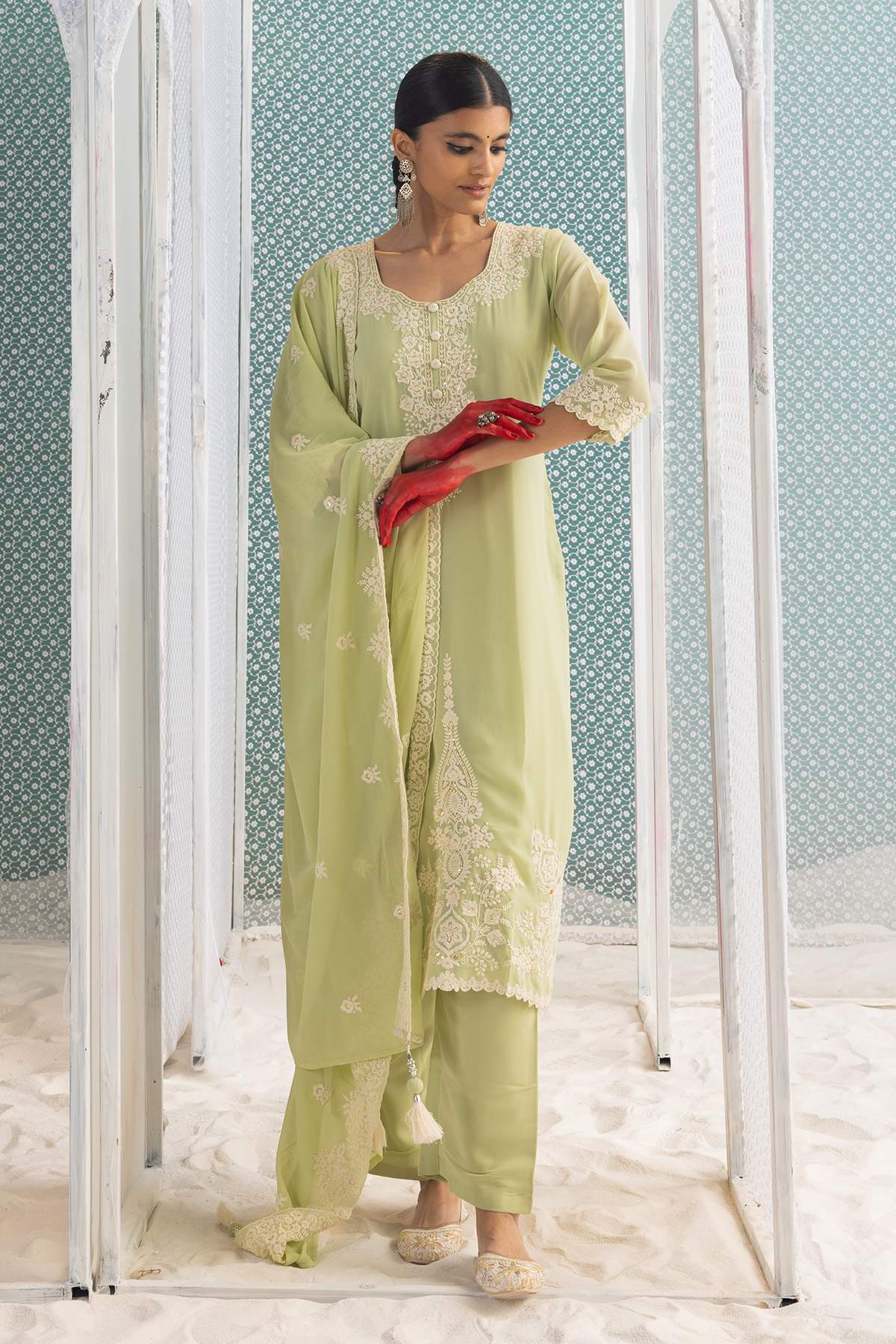 This outfit features a Green chikankari Straight Embroidered kurta with a Round neck, three-quarter sleeves, and a Straight hemline, with pant and a dupatta. The ensemble is a stylish and comfortable choice for various occasions, showcasing a coordinated and fashionable look.