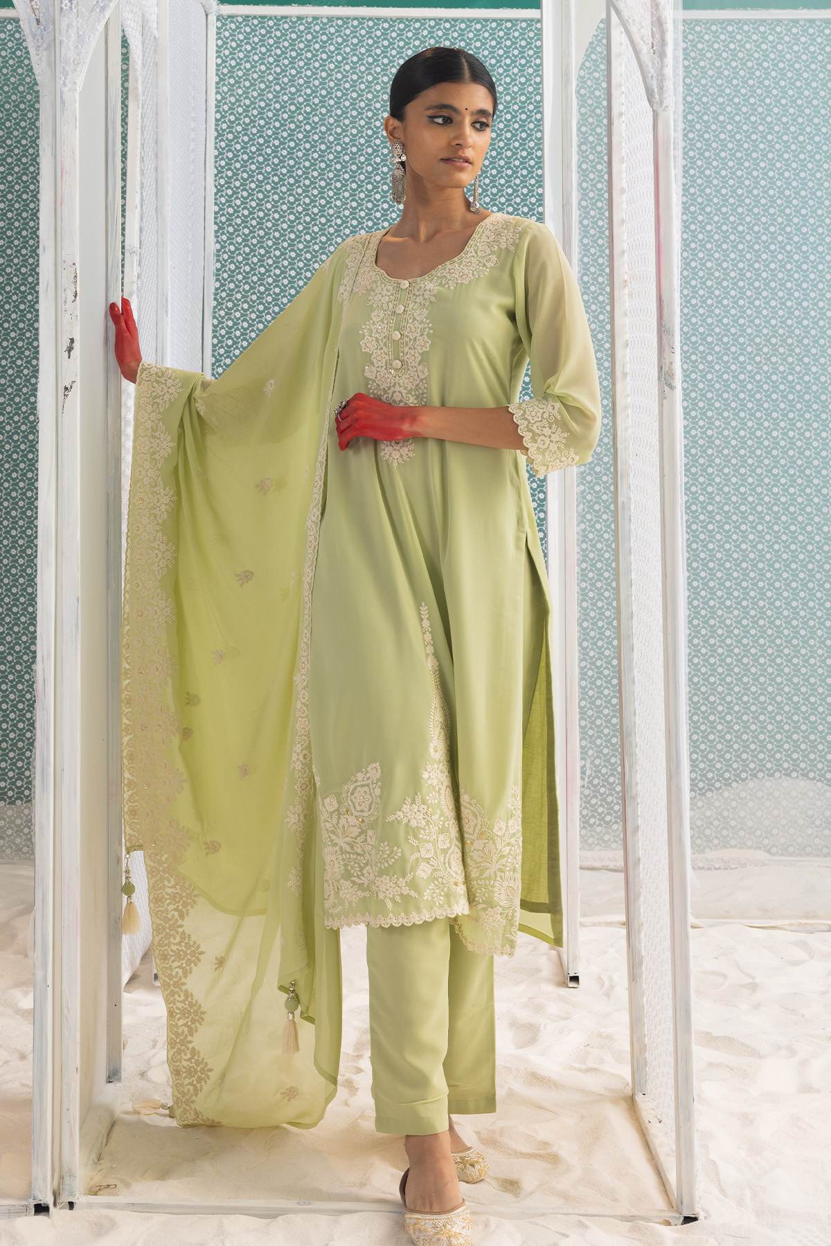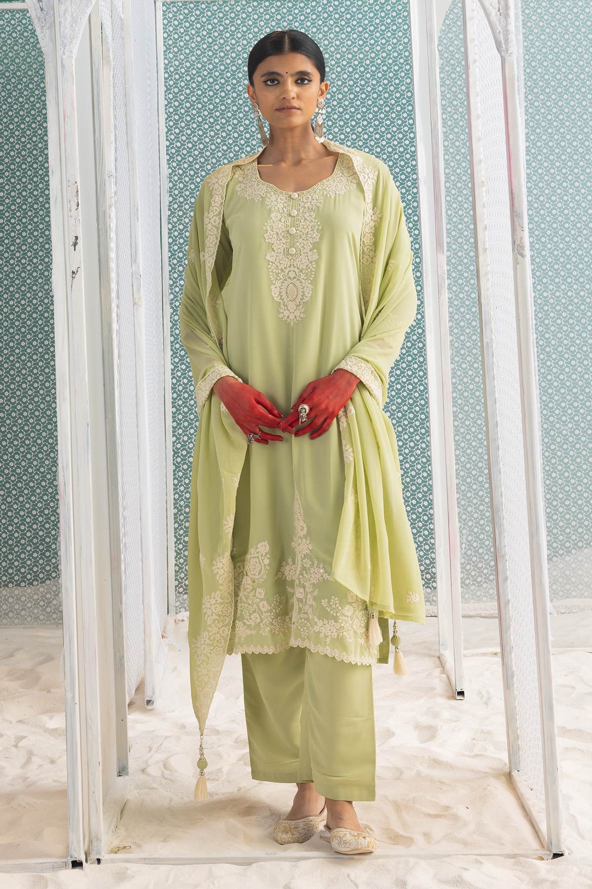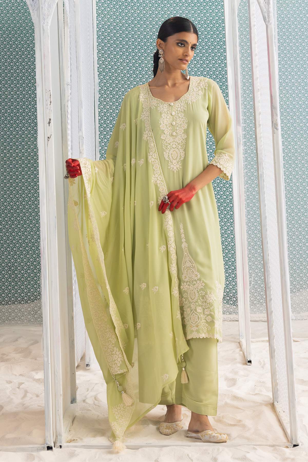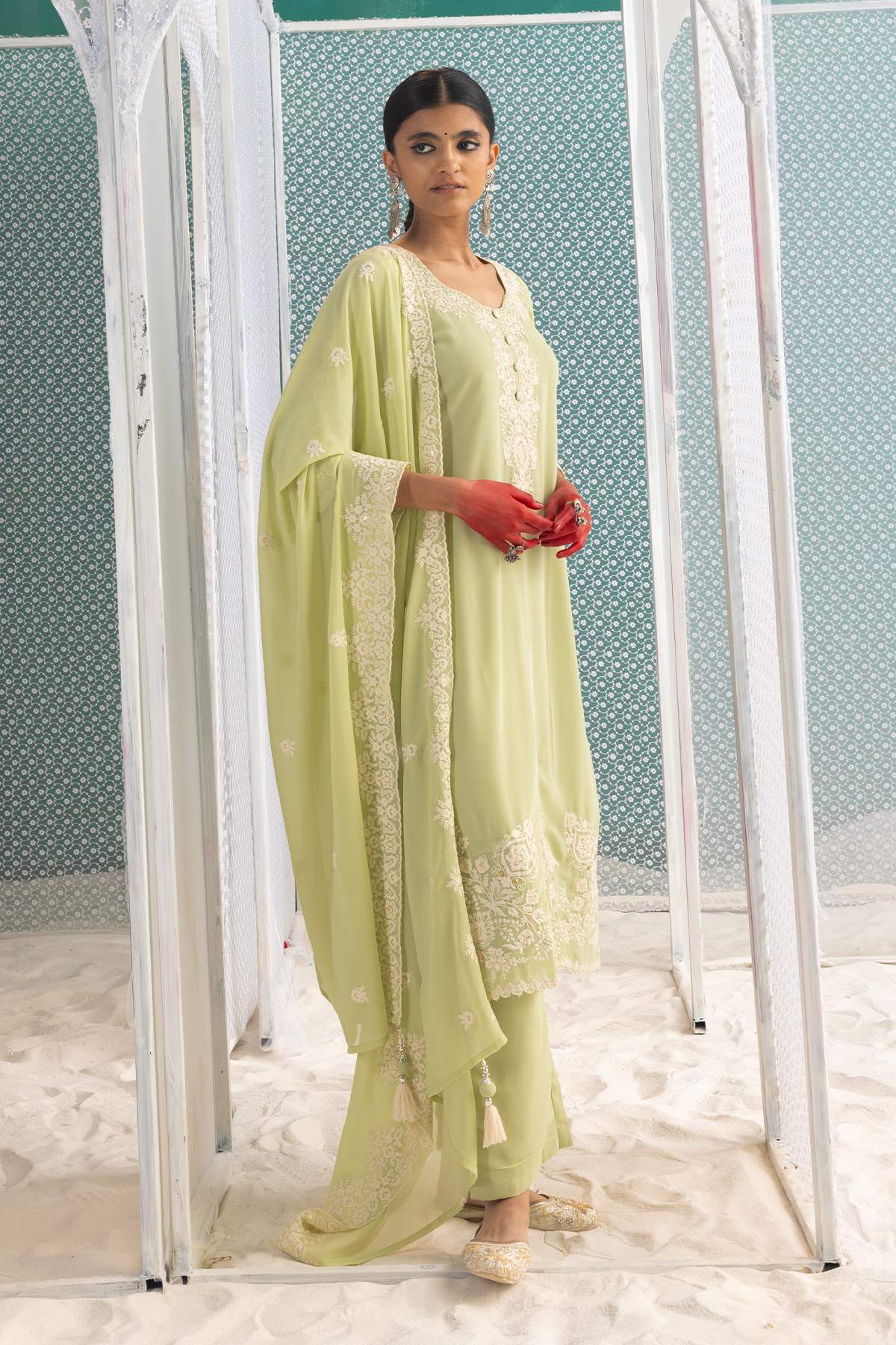 This outfit features a Green chikankari Straight Embroidered kurta with a Round neck, three-quarter sleeves, and a Straight hemline, with pant and a dupatta. The ensemble is a stylish and comfortable choice for various occasions, showcasing a coordinated and fashionable look.