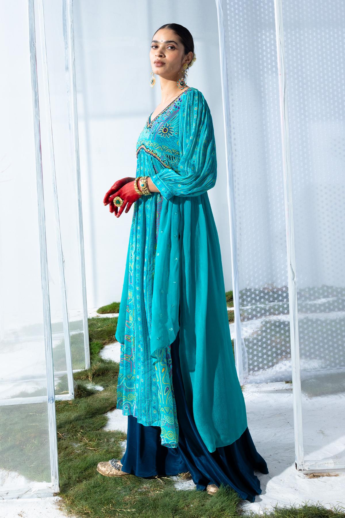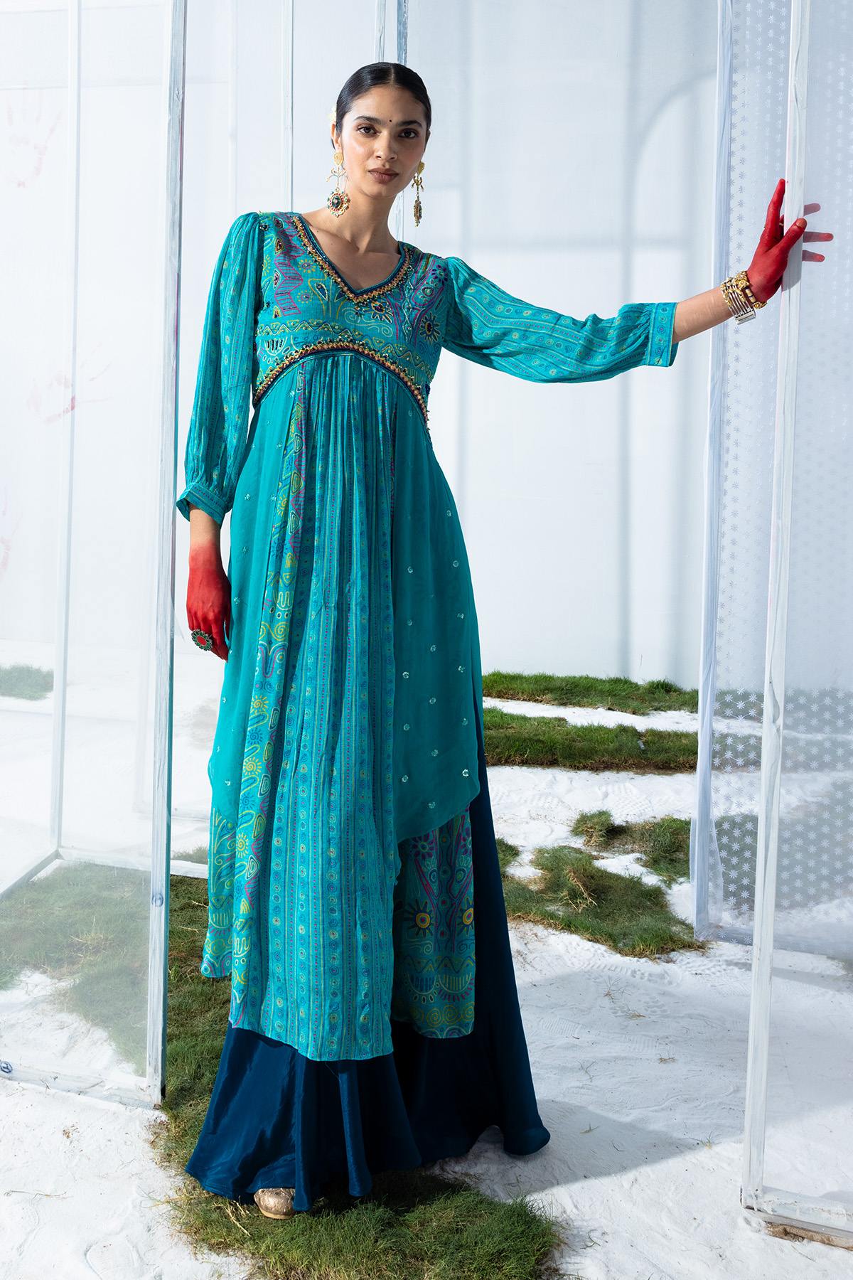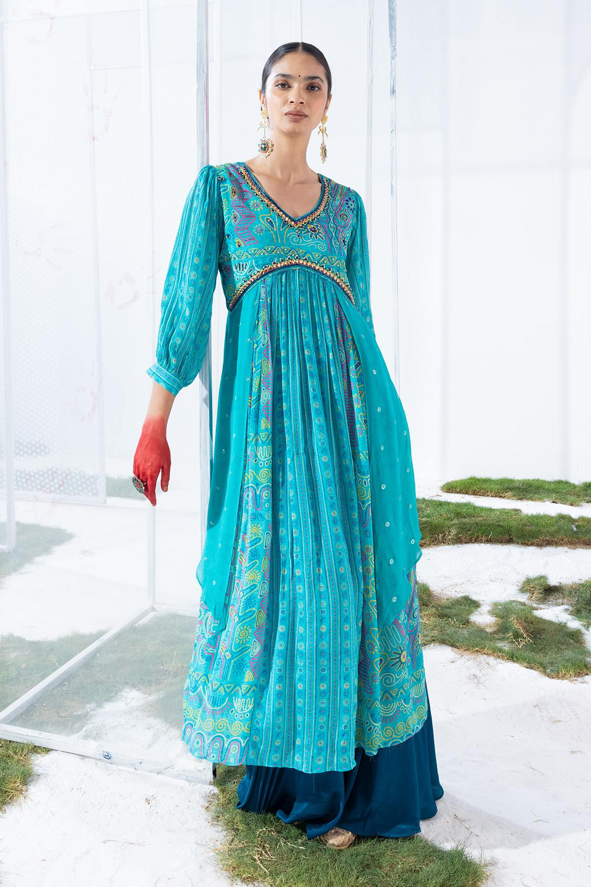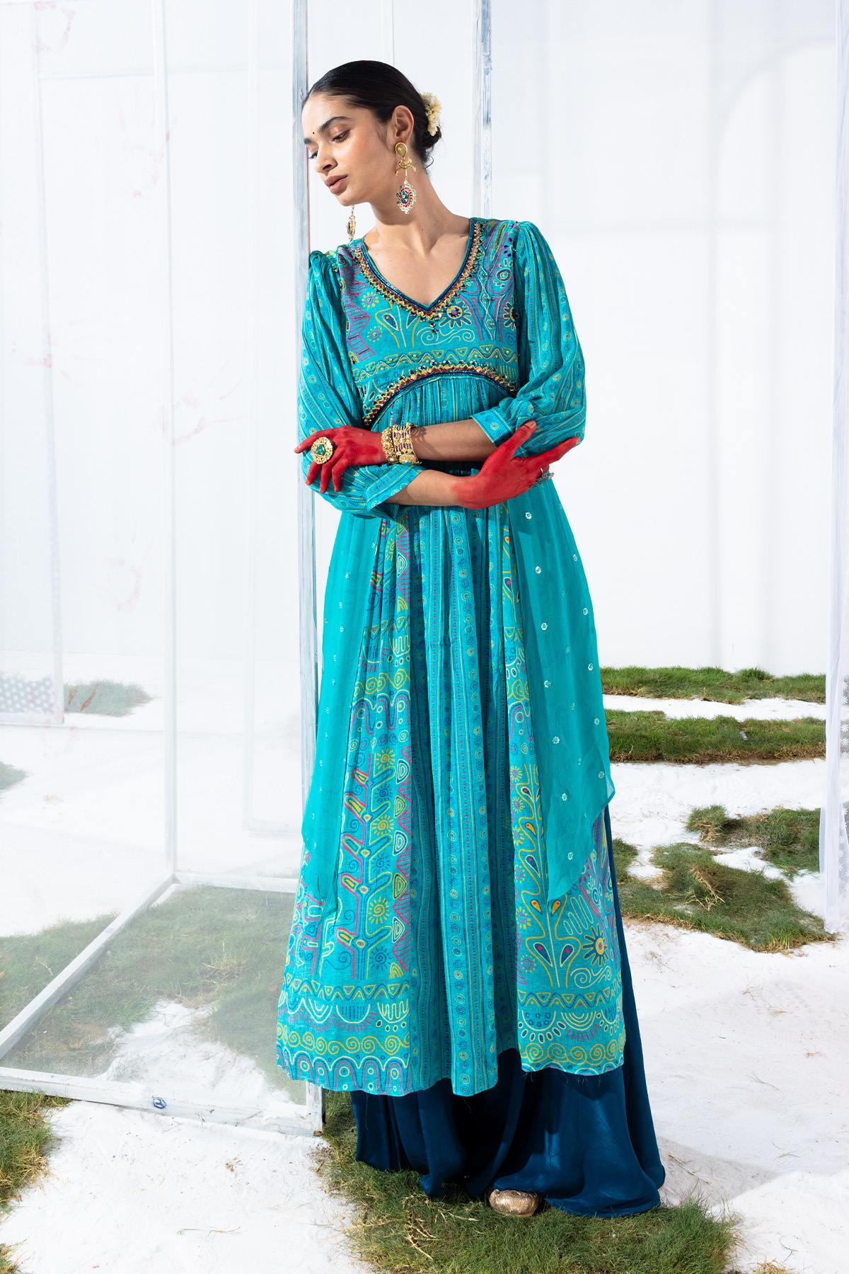 This vibrant green kurta set features a v-neck and flared hemline. the yoke is beautifully embroidered, complementing the three-quarter sleeves. paired with matching pants, this stylish ensemble offers both comfort and elegance for any occasion.