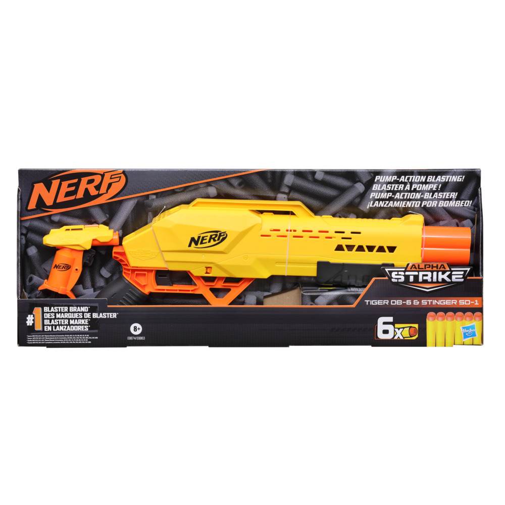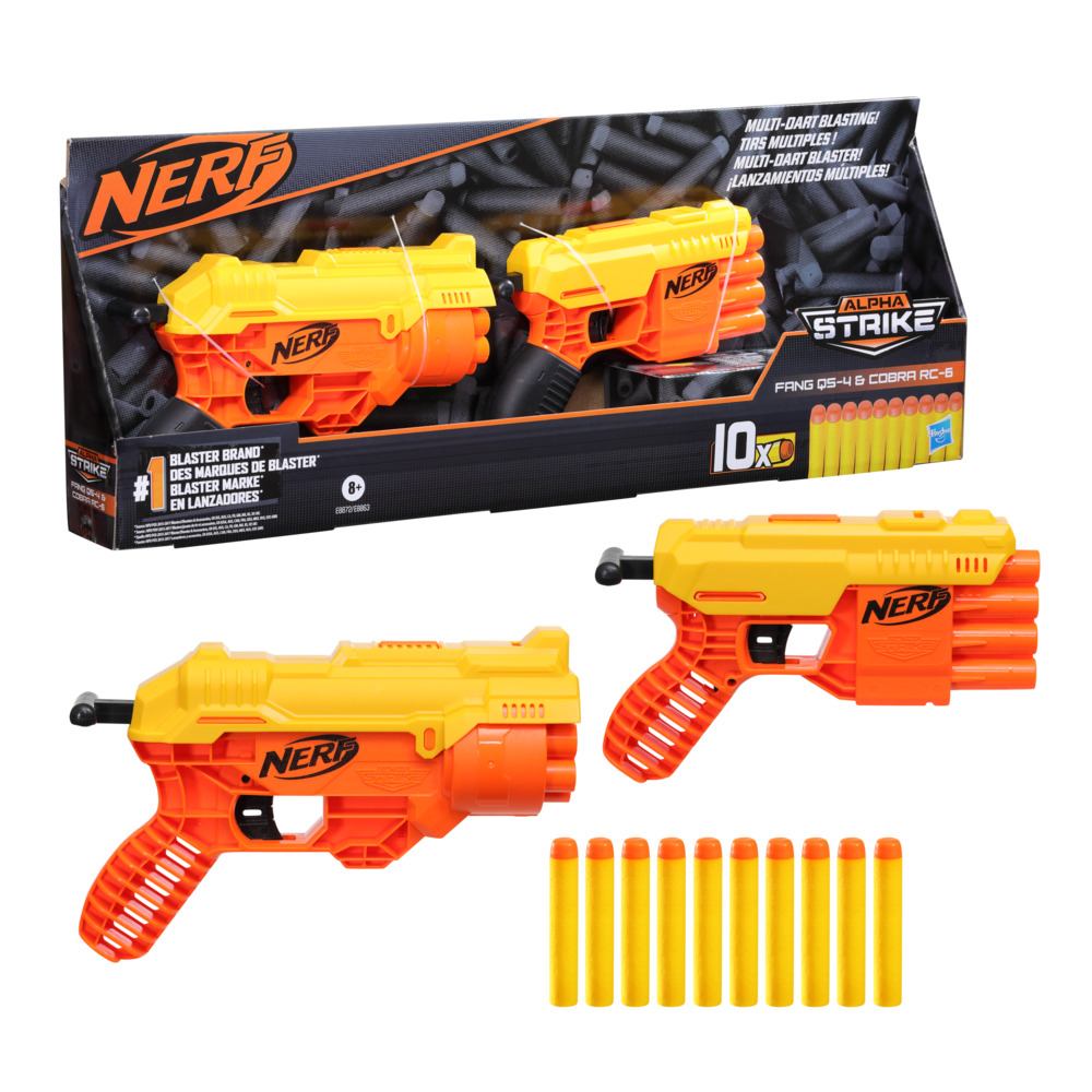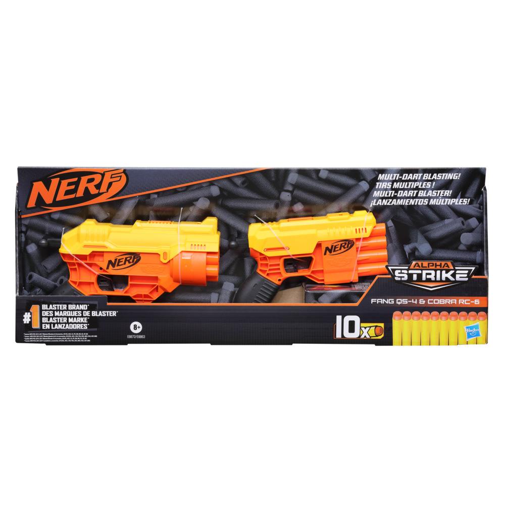 Start blasting with Alpha Strike blasters from Nerf, the number one blaster brand*! These 3 sets are a great way to build your Nerf blaster collection. The Lynx SD-1 blaster includes 12 Official Nerf Elite darts, the Fang QS-6 and Cobra RC-6 blaster set includes 10 Official Nerf Elite darts, and the Tiger DB-1 and Stinger SD-1 set includes 6 Official Nerf Elite darts. All are easy to load, prime, and fire. Alpha Strike blasters are an awesome way to get into adrenaline-pumping Nerf battles and experience the power and performance of the Nerf brand. They’re easy to use so first-time battlers can begin blasting fast. If you’re already a Nerf fan, they are great additions for your Nerf collection! No batteries required. Eyewear recommended (not included). Each sold separately (subject to availability). *Source: NPD POS Full Year 2019 Blasters/Shooters & Accessories, G11 (US, AUS, CA, FR, GM, MX, BR RS, SP, UK, IT). Nerf and all related properties are trademarks of Hasbro.