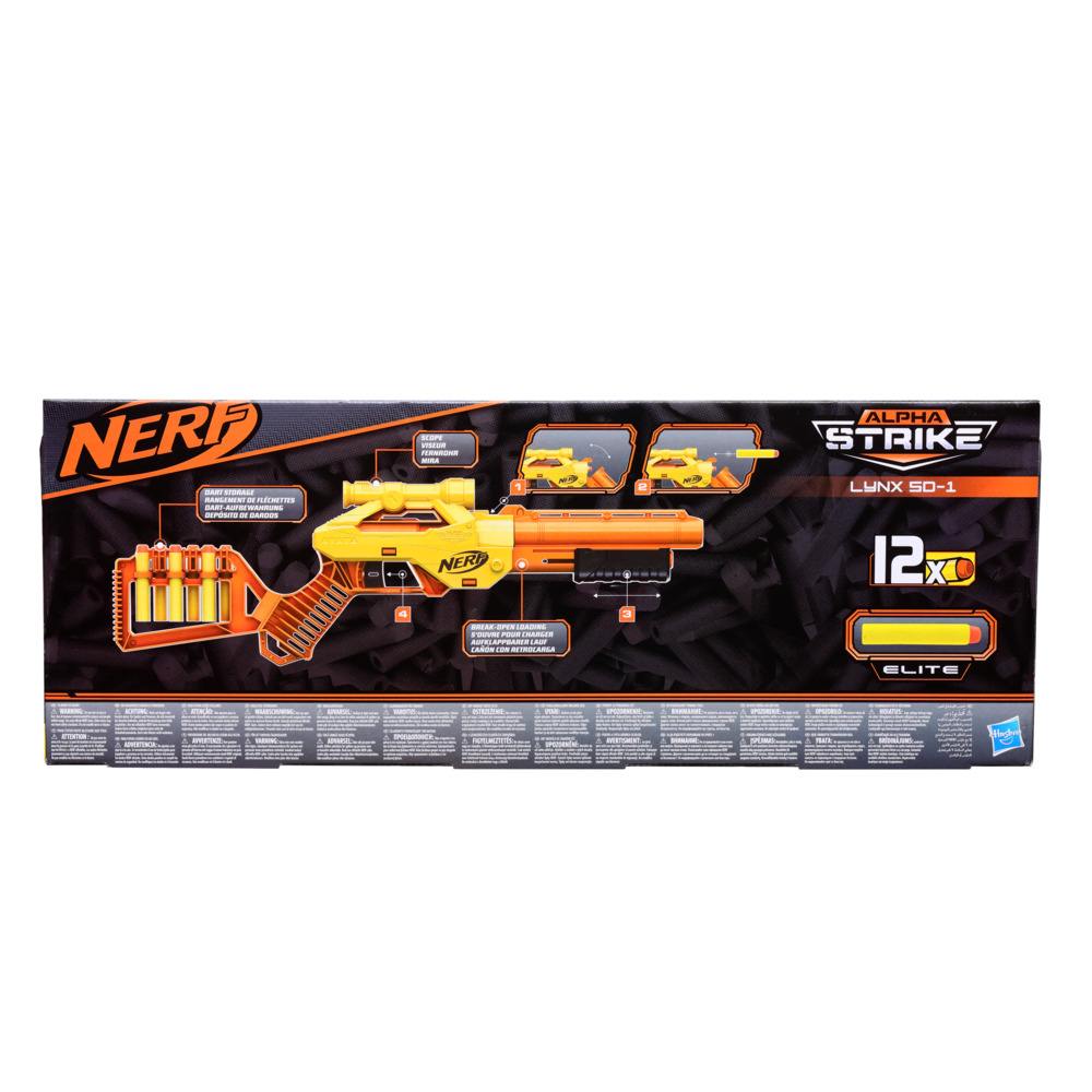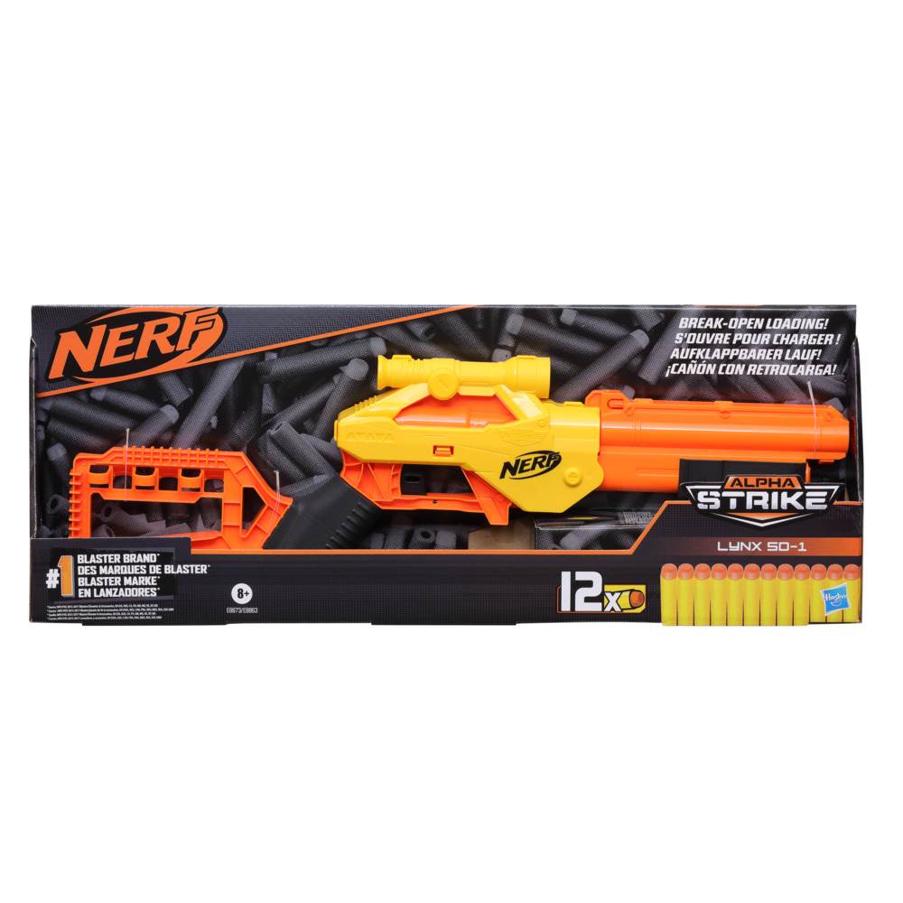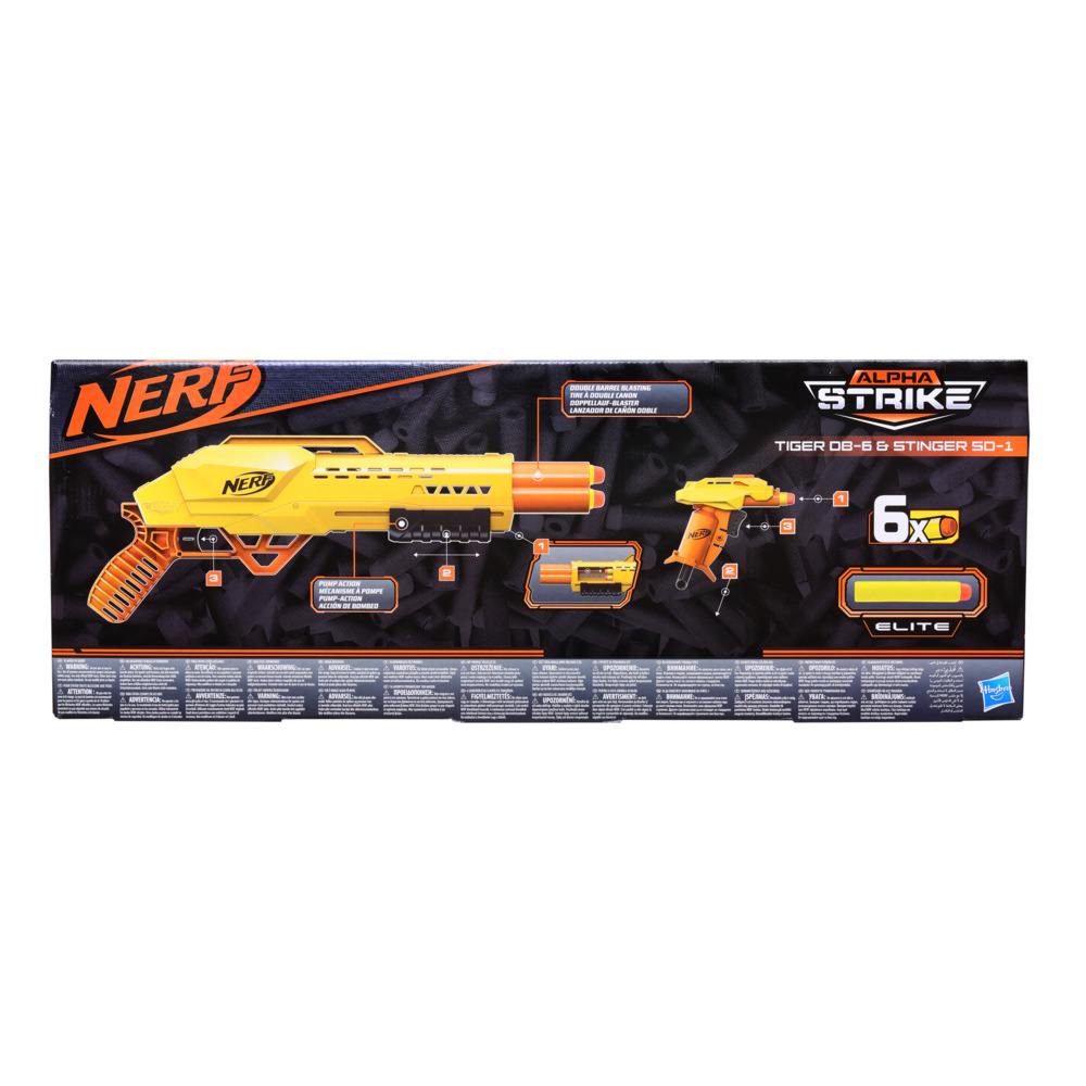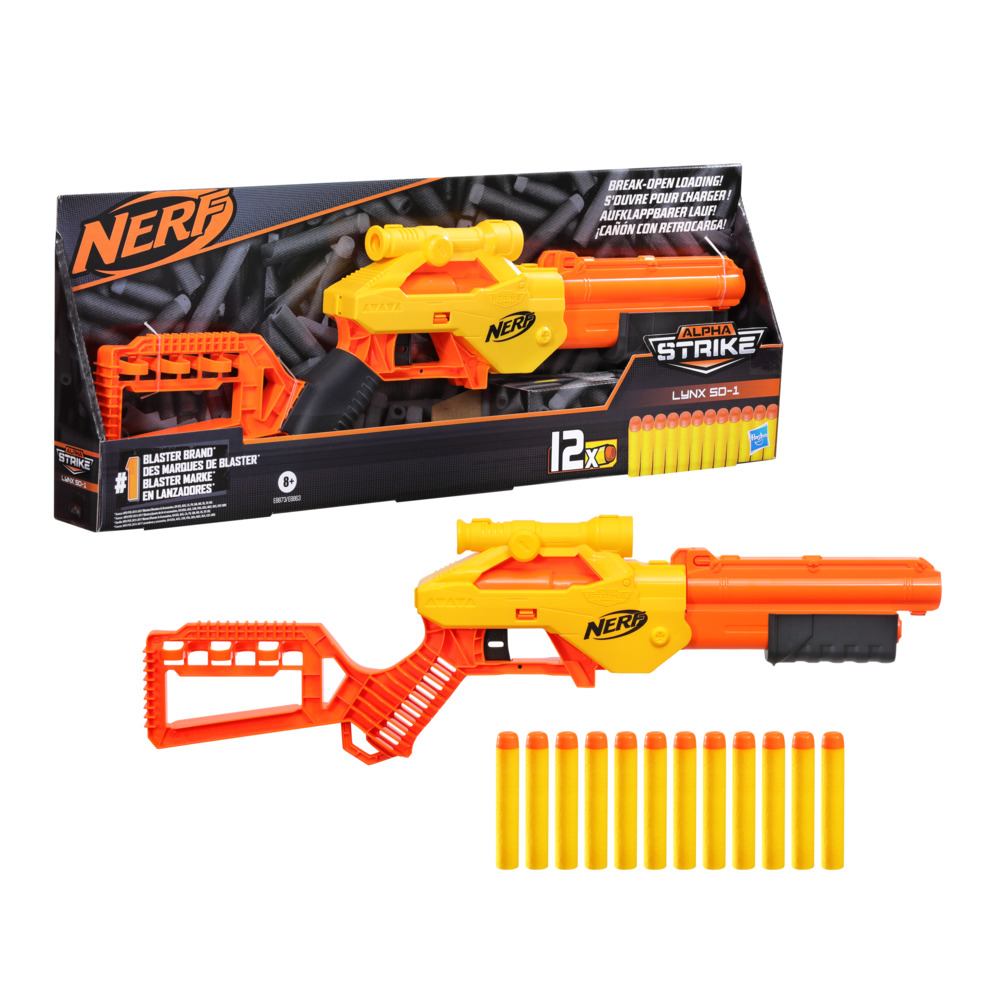 Start blasting with Alpha Strike blasters from Nerf, the number one blaster brand*! These 3 sets are a great way to build your Nerf blaster collection. The Lynx SD-1 blaster includes 12 Official Nerf Elite darts, the Fang QS-6 and Cobra RC-6 blaster set includes 10 Official Nerf Elite darts, and the Tiger DB-1 and Stinger SD-1 set includes 6 Official Nerf Elite darts. All are easy to load, prime, and fire. Alpha Strike blasters are an awesome way to get into adrenaline-pumping Nerf battles and experience the power and performance of the Nerf brand. They’re easy to use so first-time battlers can begin blasting fast. If you’re already a Nerf fan, they are great additions for your Nerf collection! No batteries required. Eyewear recommended (not included). Each sold separately (subject to availability). *Source: NPD POS Full Year 2019 Blasters/Shooters & Accessories, G11 (US, AUS, CA, FR, GM, MX, BR RS, SP, UK, IT). Nerf and all related properties are trademarks of Hasbro.