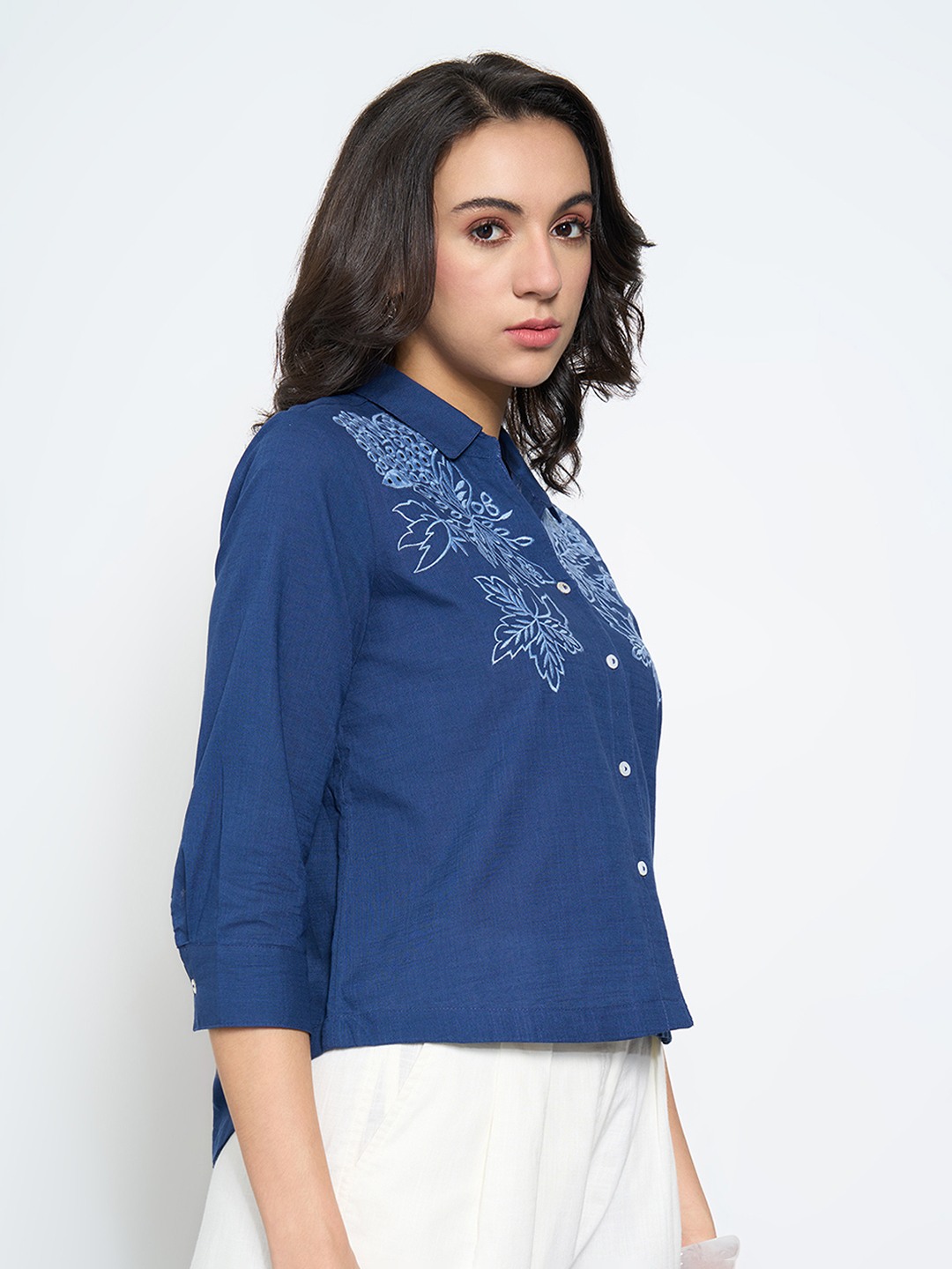 A fresh take on timeless embroidery, this shirt exudes effortless sophistication. It features delicate floral thread work across the front, a smart collared neckline, and a high-low hem for a relaxed drape. The 3/4 sleeves with buttoned cuffs complete its easy, versatile silhouette.