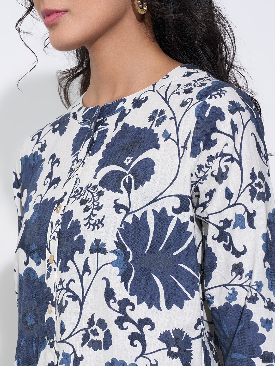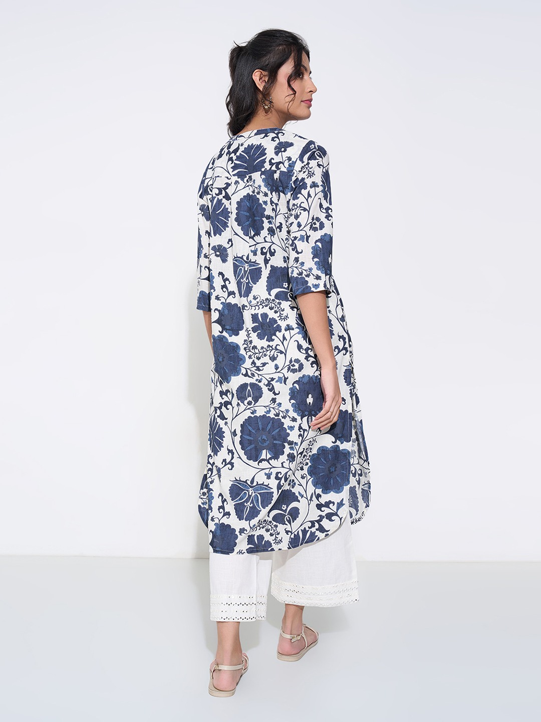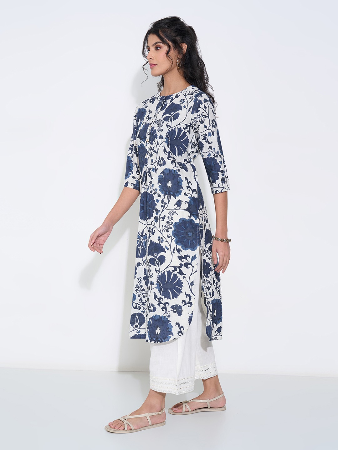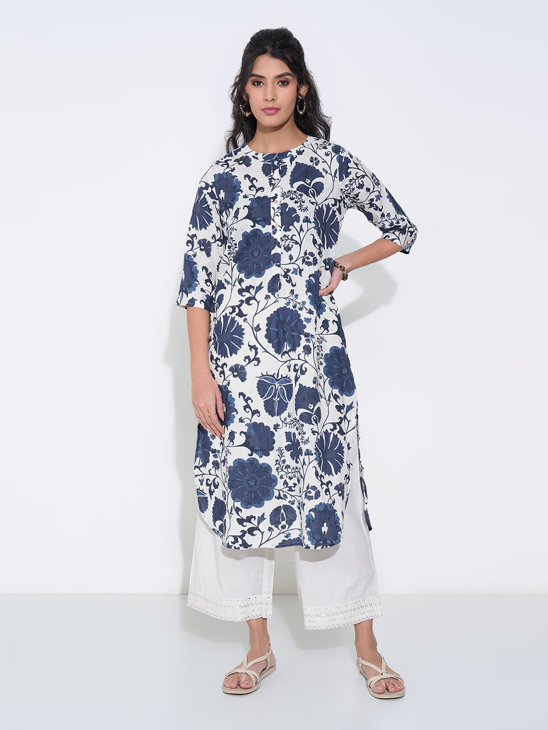 An effortless piece that makes a statement. This kurta has a round neckline with a front button placket, 3/4 sleeves and side slits for ease. The soft woven fabric ensures comfort with a clean fall.