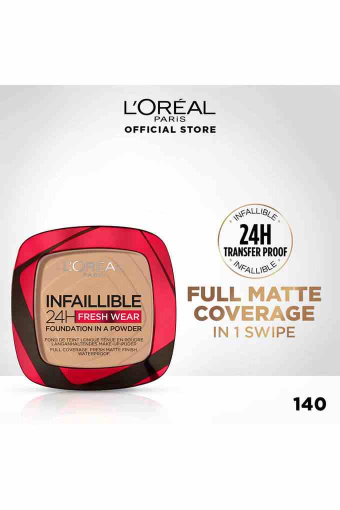 LOral Paris Infallible 24H Fresh Wear Powder Foundation is a lightweight powder foundation that covers like a liquid and mattifies with no cakey look. The long-wear formula is oil-free, waterproof, heatproof, sweatproof, non-comedogenic and suitable for all skin types yes, even acne-prone skin!?