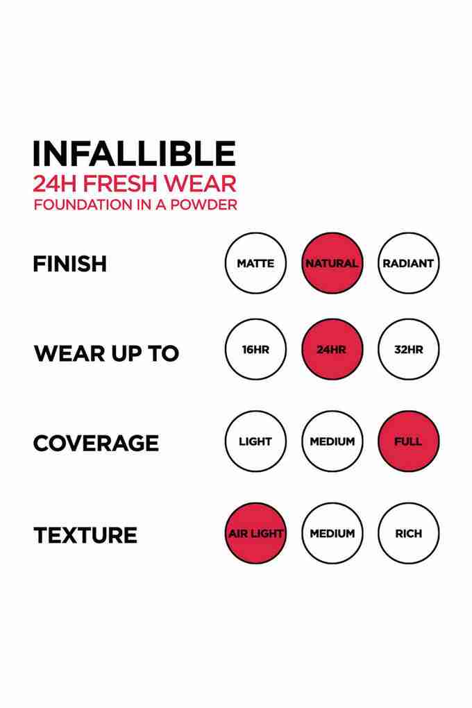 Infallible Up to 24H Fresh Wear Foundation in a Powders weightless texture gives full coverage and a natural, matte finish that looks fresh hour after hour. The formula feels breathable and light, leaving skin feeling comfortable for up to 24 hours. Its also: