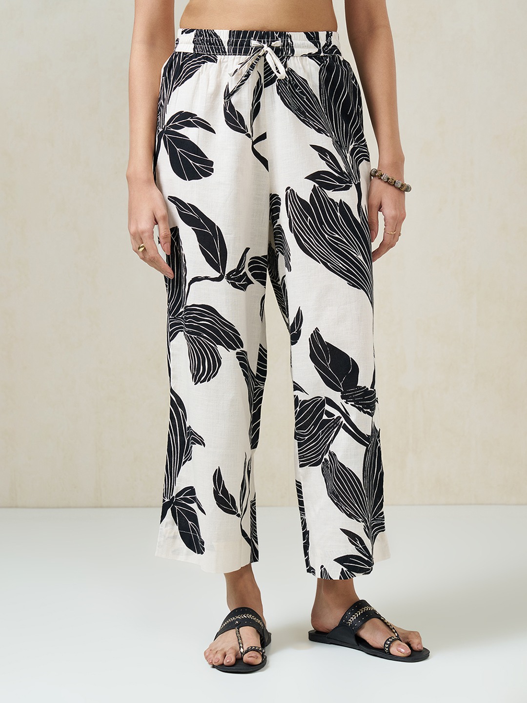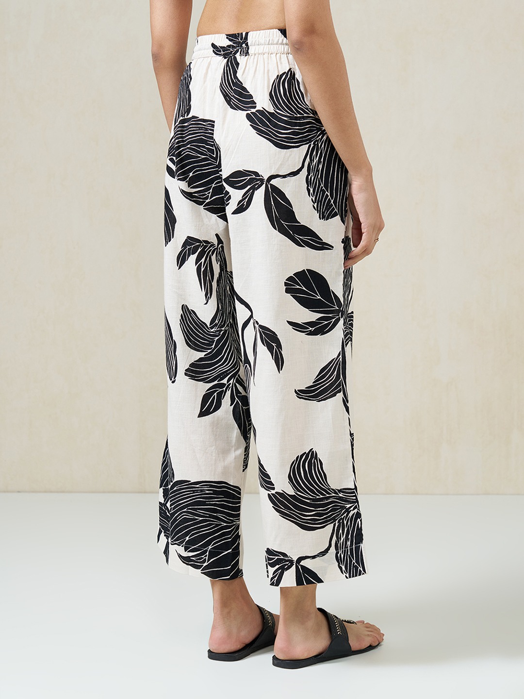 Designed for relaxed ethnic silhouettes, these wide leg pants feature a striking botanical print that adds visual depth to the fluid shape. The elasticated waistband with a drawstring ensures comfort, while the airy wide-leg cut allows effortless movement through the day. Finished with a soft, breathable feel, they balance ease with statement appeal.
