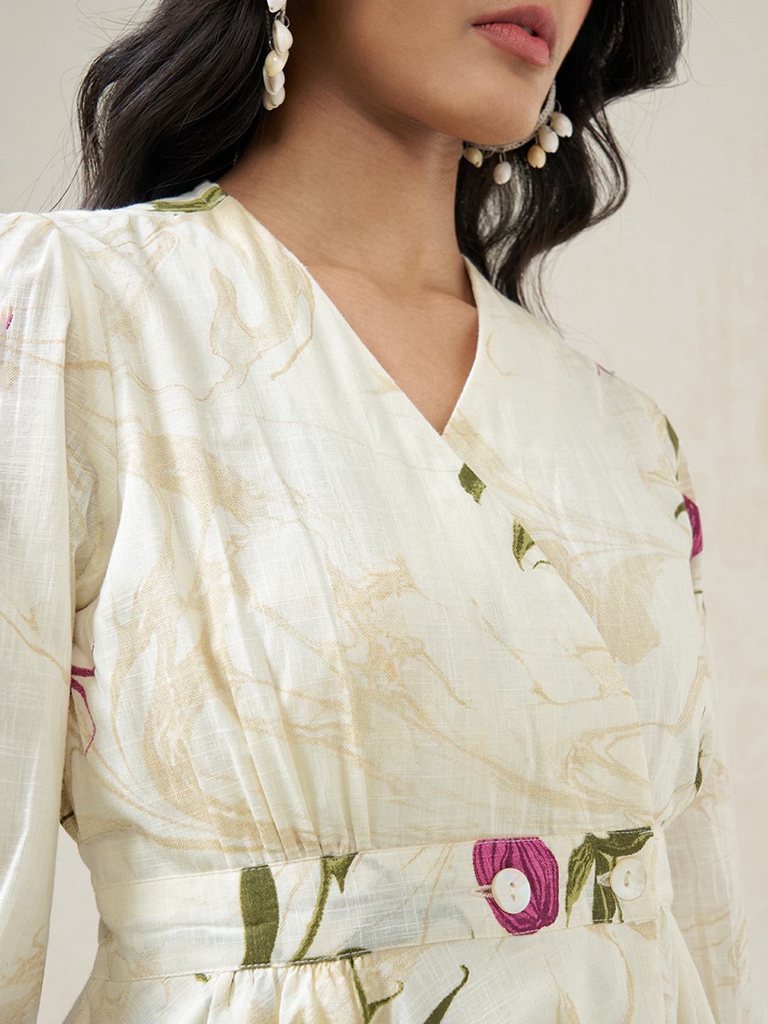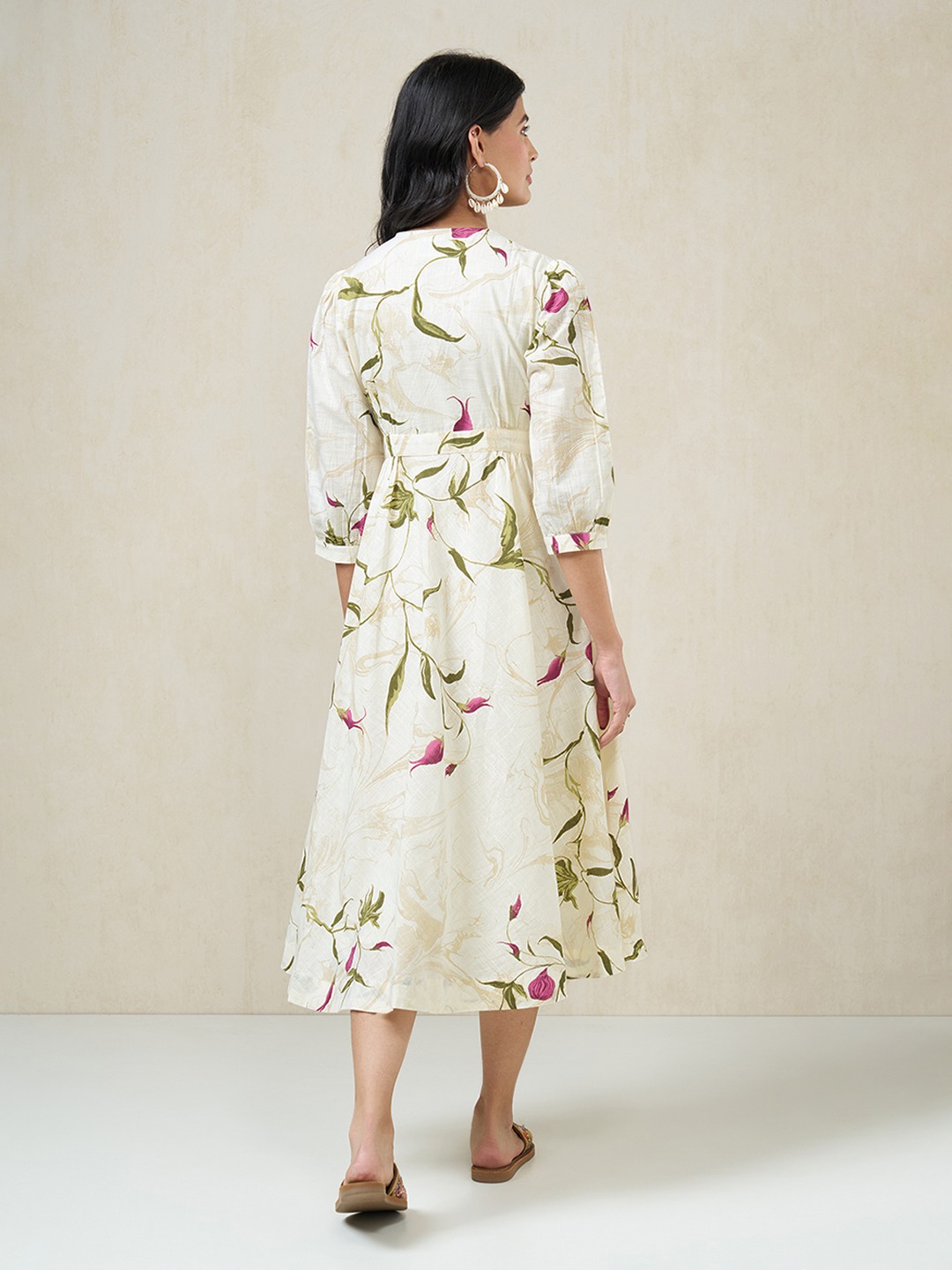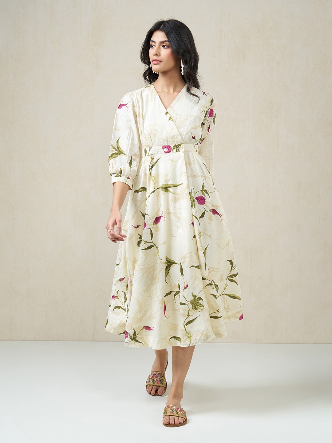 Soft, feminine and fluid in movement. Designed with a V-neck wrap-style bodice, a gently defined waist and 3/4 sleeves, this dress features an all-over floral print with a softly flared midi-length silhouette. The lightweight woven fabric drapes easily and stays comfortable through warm days.