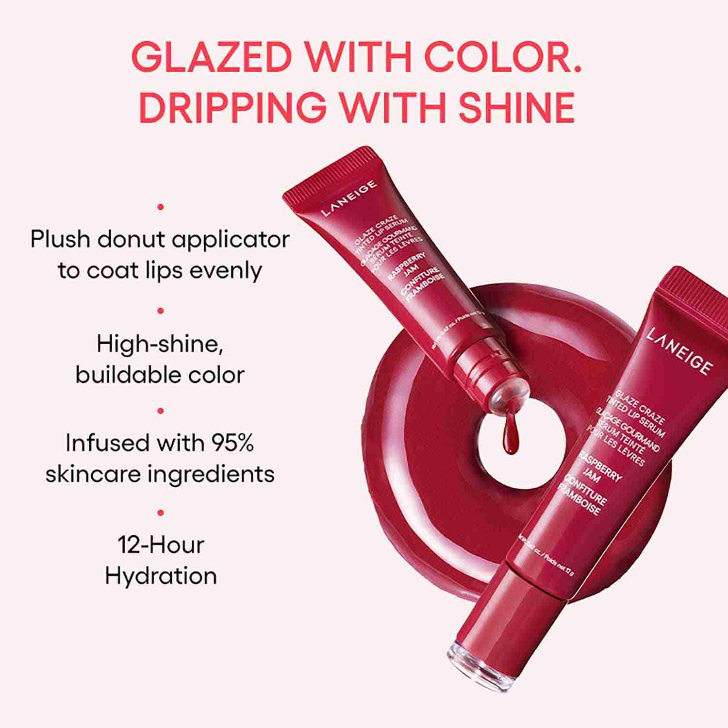 Say hello to plump and pampered lips with the Laneige Glaze Craze Tinted Lip Serum - Rasberry Jam (12 g). This 95% skincare-based lip serum hydrates, smooths, and visibly plumps lips for up to 12 hours. Infused with light-reflecting ingredients, the Laneige lip glaze delivers a sheer-to-buildable tint with a radiant, glazed finish. Also, the playful donut-inspired applicator of this scented lip serum makes every swipe fun and effortless.