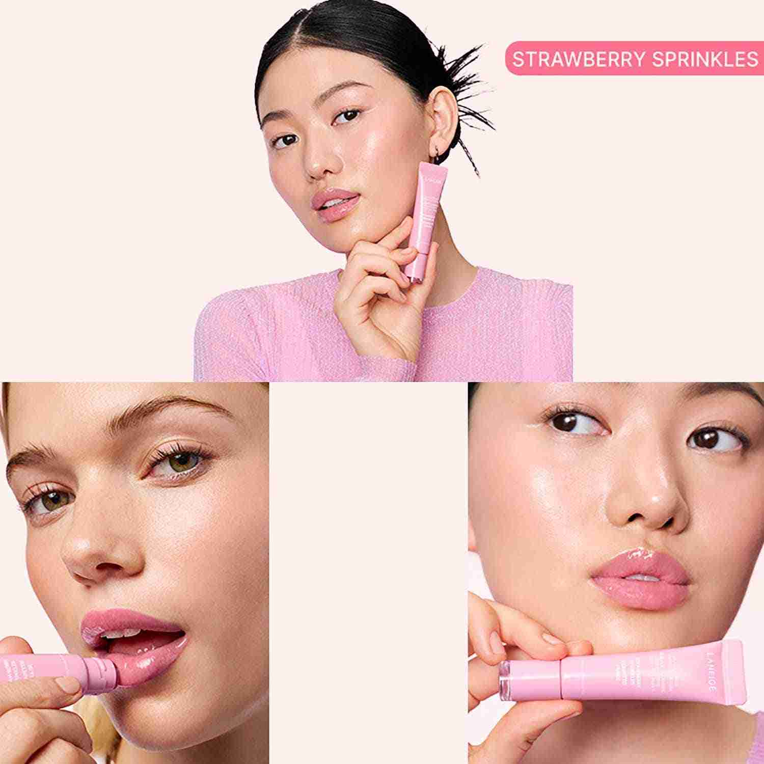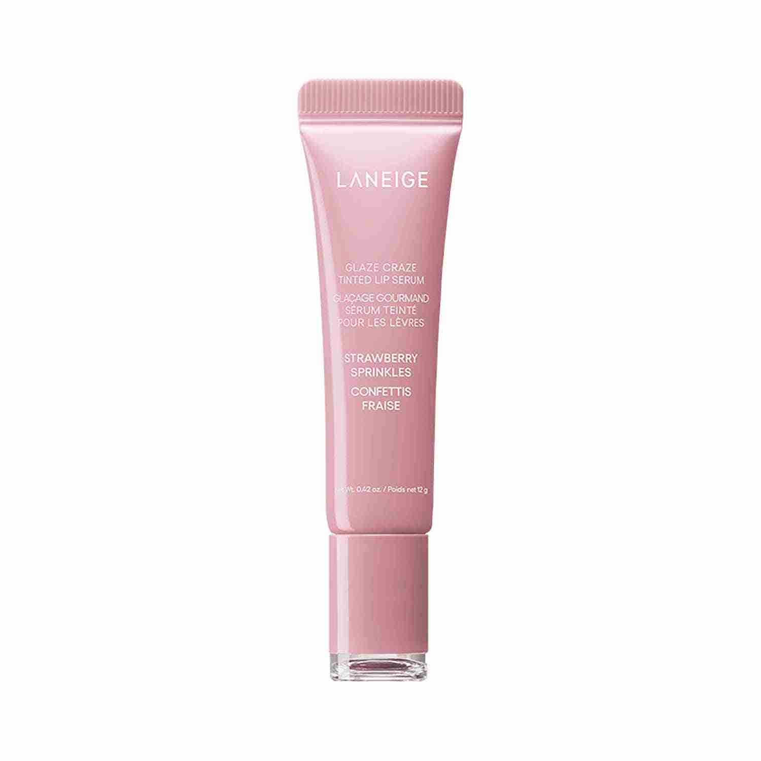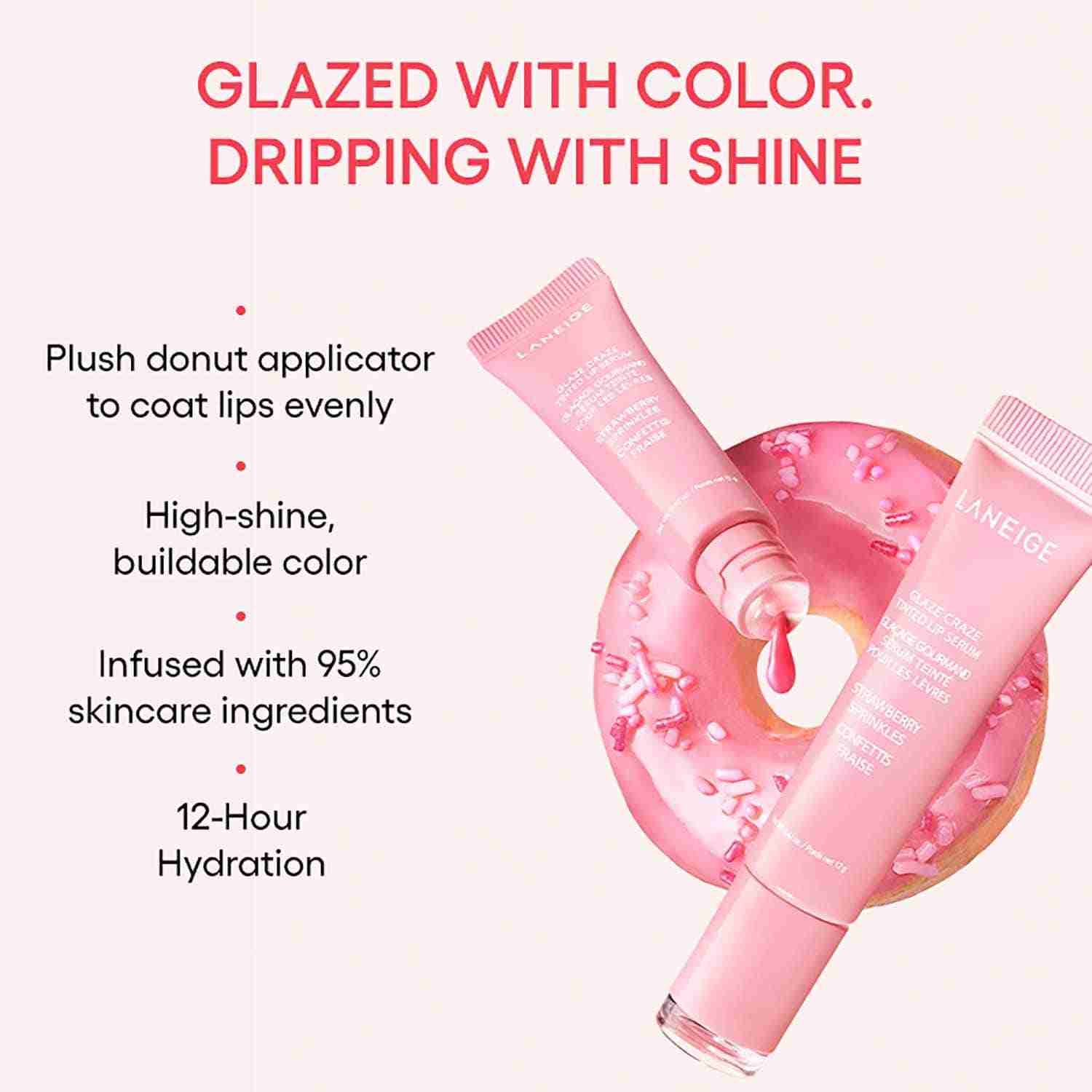 The Laneige Glaze Craze Tinted Lip Serum - Strawberry Sprinkles (12 g) is where radiant shine meets serious hydration. This 95% skincare-based lip serum hydrates, smooths, and visibly plumps lips for up to 12 hours. Infused with light-reflecting ingredients, the Laneige lip glaze delivers a sheer-to-buildable tint with a radiant, glazed finish. Also, the playful donut-inspired applicator of this scented lip serum makes every swipe fun and effortless.