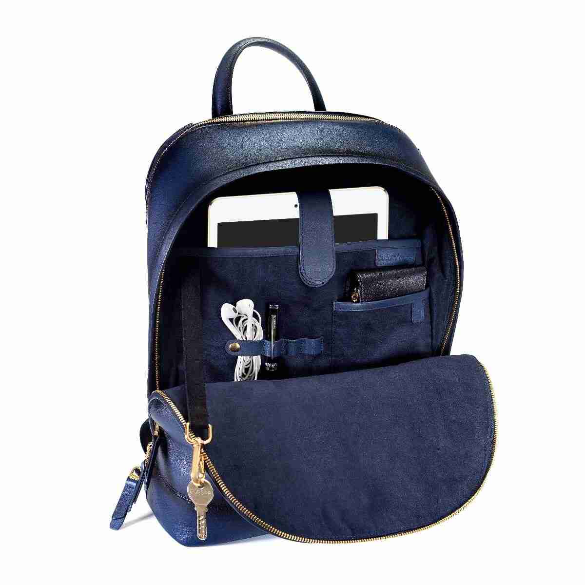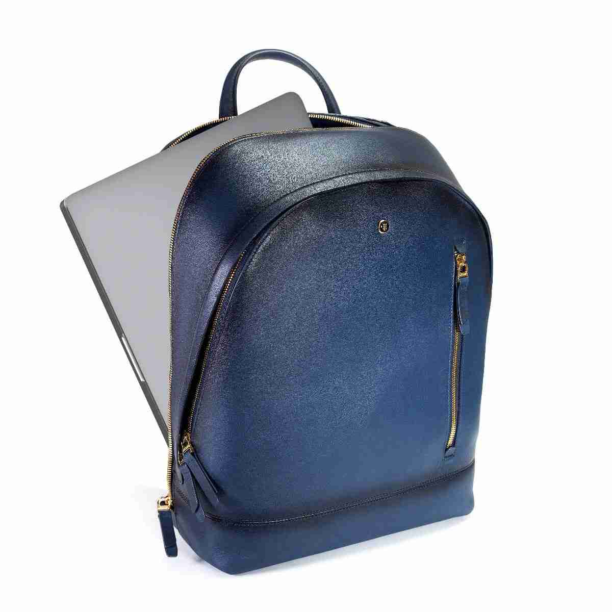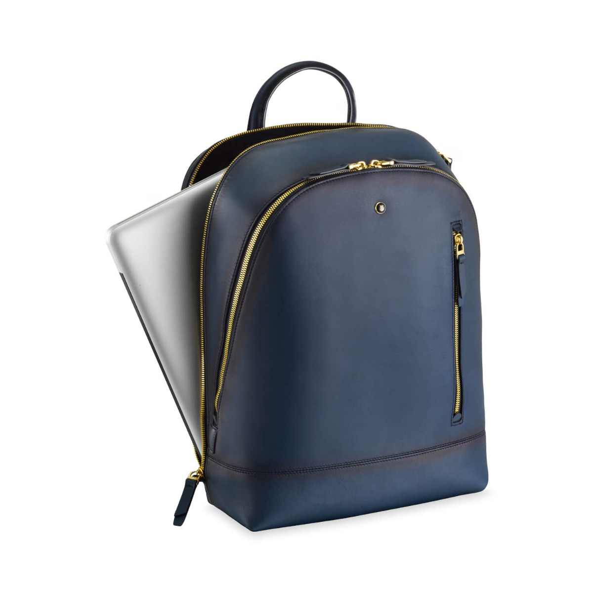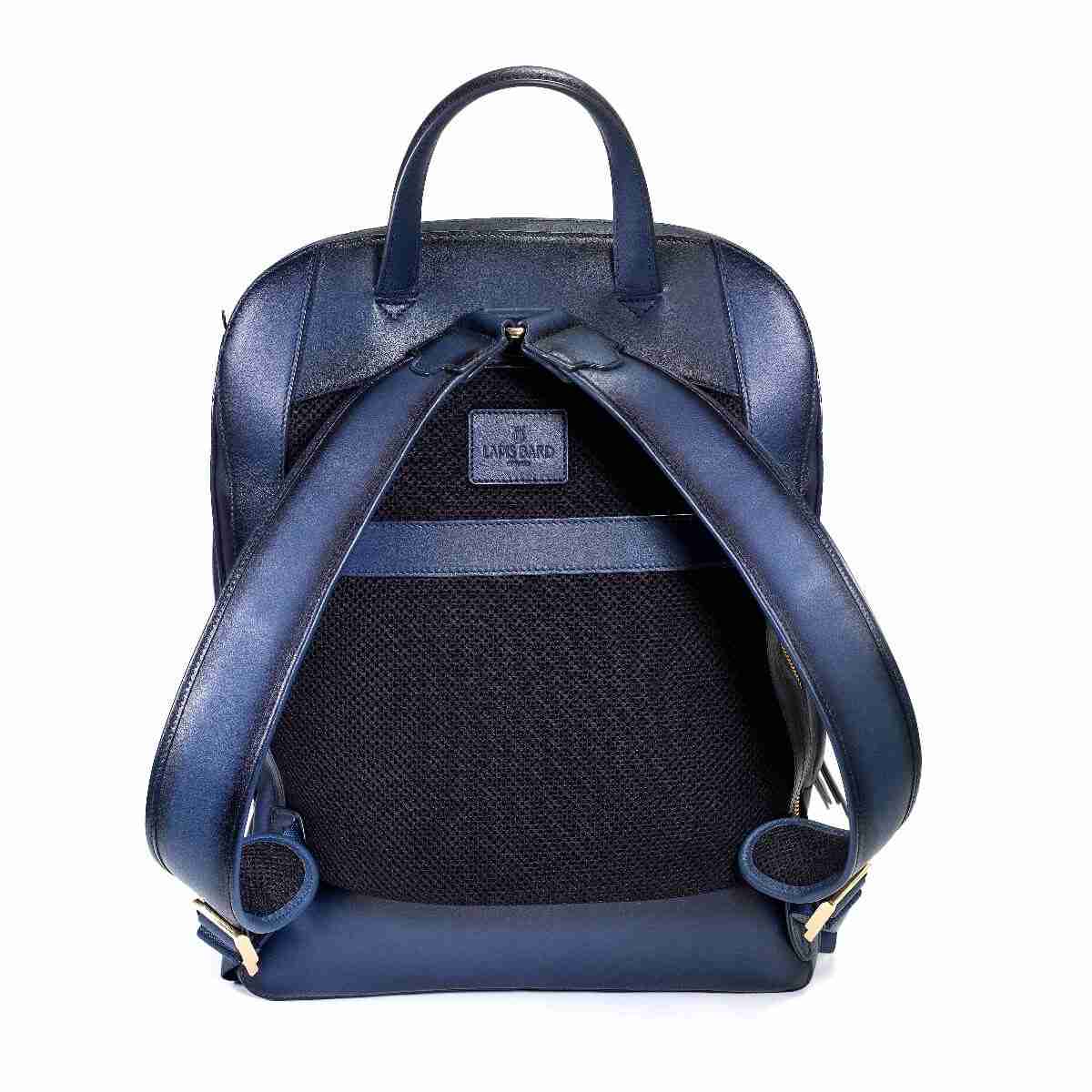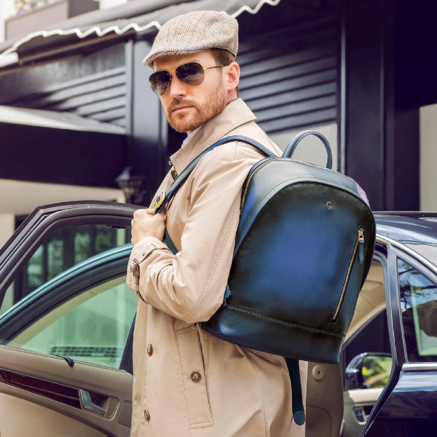 Steeped in lyrical emotion and sultry melodies, it's easy to understand why blues music has had such a deep and lasting impact on the Western world. It evokes a range of emotions from joy to triumph and at times, soulful melancholy. Lapis Bard Blue pays homage to the legendary genre with its newest arrival, the Hampton. If you have been looking for a backpack that is professional, smart, sophisticated and ultra-stylish, the Hampton fits the bill. The glamour of gold, the audacious elegance of blue and the richness of the finest leather is a trilogy made in heaven. The two-toned look of this semi vegetable dyed leather is created by skilled craftsmen who meticulously hand-paint the edges, the colour of which gradually darkens as it imperceptibly passes from one shade to another, taking inspiration from Leonardo da Vinci's ‘sfumato’ technique. This highly coveted bag is for commuters who bounce between home, work and travel. The bag securely holds a 14" laptop in its padded compartment while the cleverly designed L zippered pocket system allows you to access your essentials with ease. Ensuring maximum comfort at all times is the plump leather handles and backstrap made of the same fine leather.