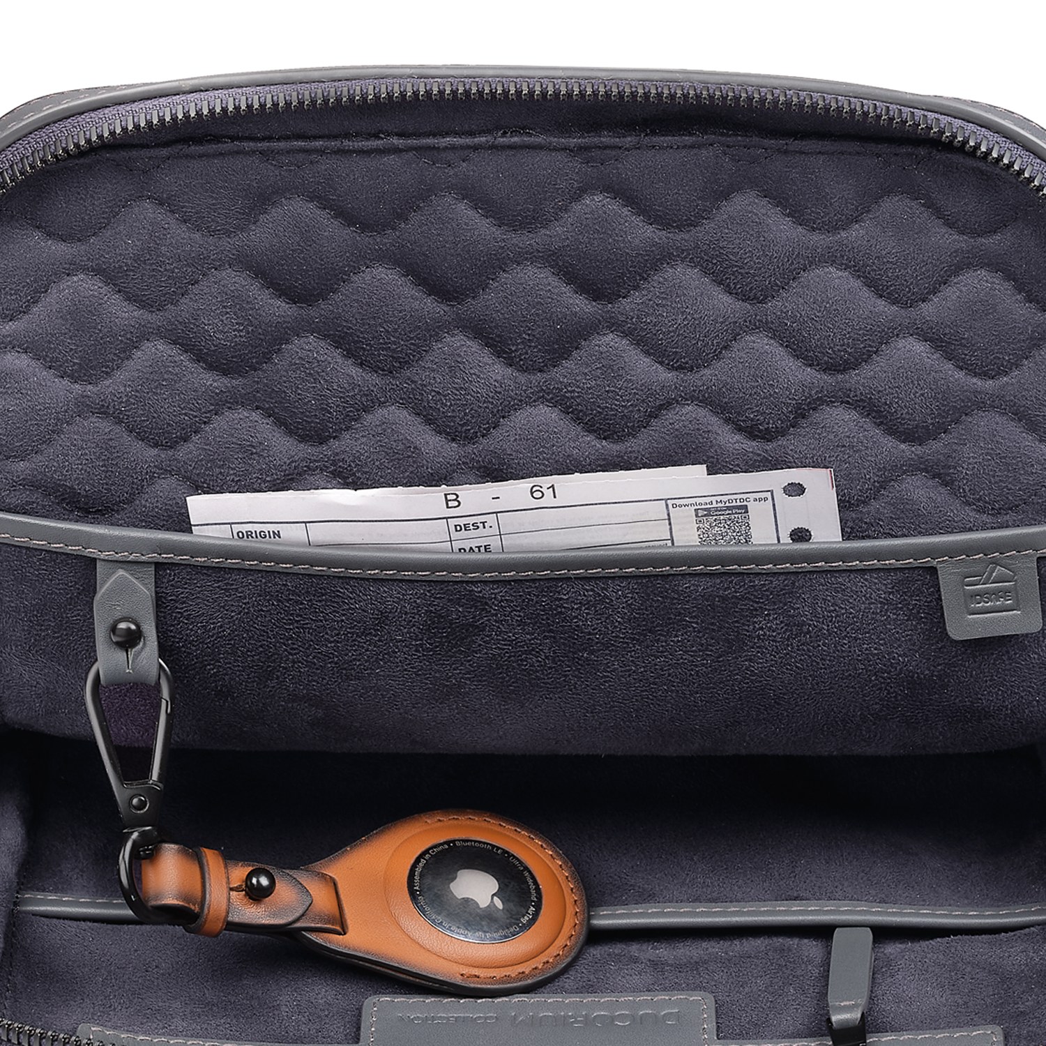 Embark on your travels with style, courtesy of Lapis Bard's latest addition. The Kent exudes sophistication with its sleek graphite grey hue. Offering ample space for your essentials such as iPad, phone, wallet, chargers, passport, and documents, this bag ensures you're well-equipped on the go. Its interior, lined with plush microfiber, includes a padded compartment specially designed for your tablet. Additionally, a dedicated AirTag holder enables easy tracking of your bag when necessary.