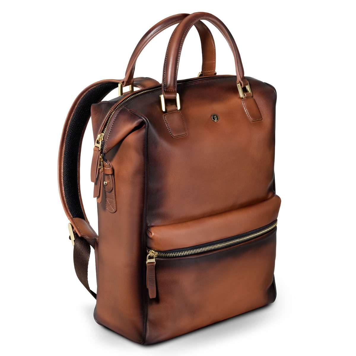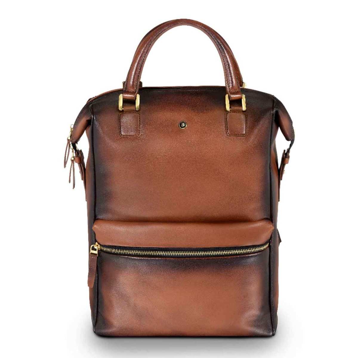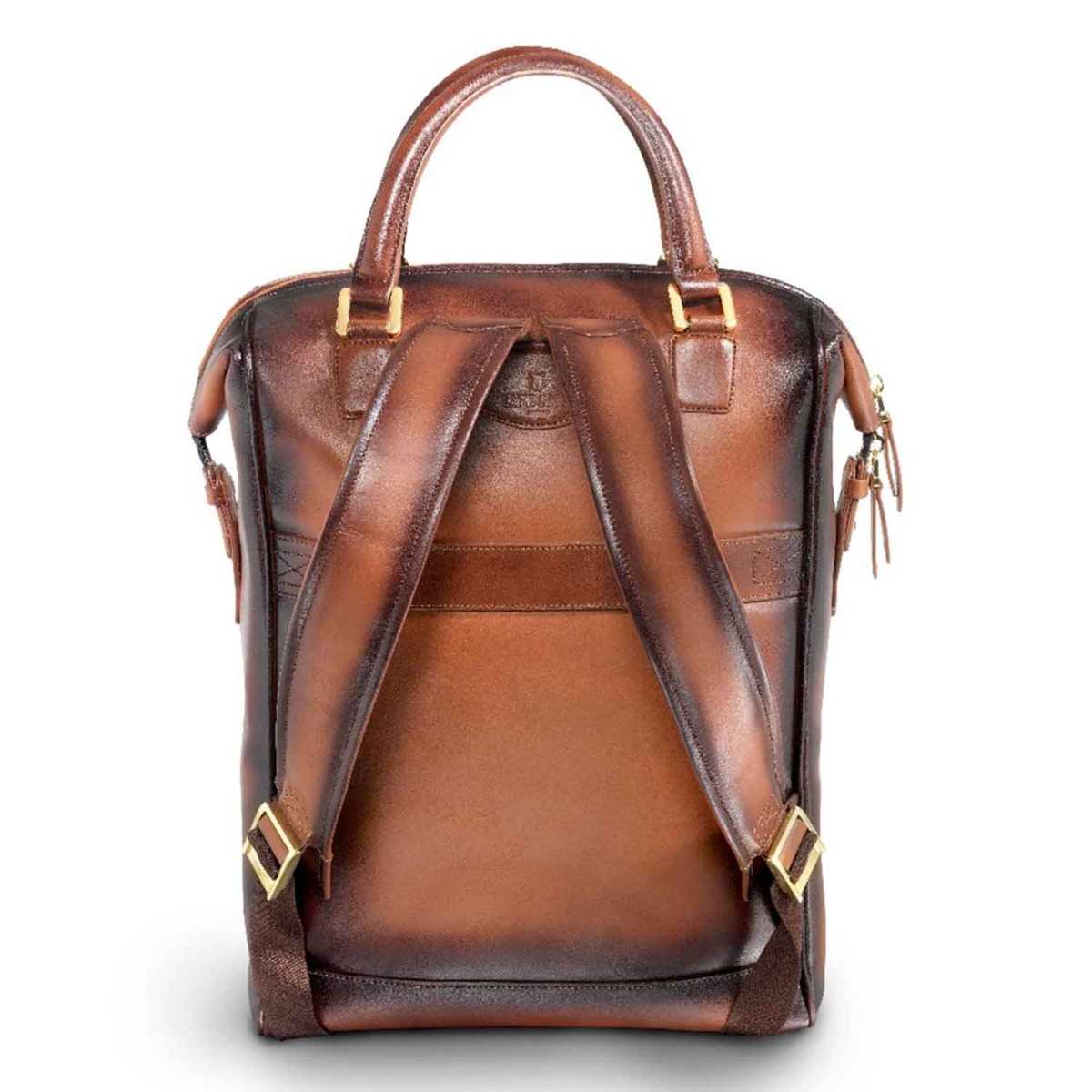 The glamour of gold, the unmissable elegance of cognac and the richness of the finest leather come together to create a bag that is absolutely lovely to look at, to own and to carry. Whether you are a conservative suit kind of a gentleman, a Friday dresser or a frequent traveler; to have the Roxton Tote backpack as your companion guarantees admiration and compliments. This compact tote is feature packed with easy access pockets, a laptop compartment that opens wide to easily slide in your laptop, and leather plumped up handles that offer maximum comfort. You have the option of either carrying it as a tote or as a backpack. The two-toned look of the semi vegetable dyed leather is created by skilled craftsmen who meticulously hand painted the edges that gradually darkens the colour as it imperceptibly passes from one shade to another, taking inspiration from Leonardo da Vinci's ‘sfumato’ technique.
