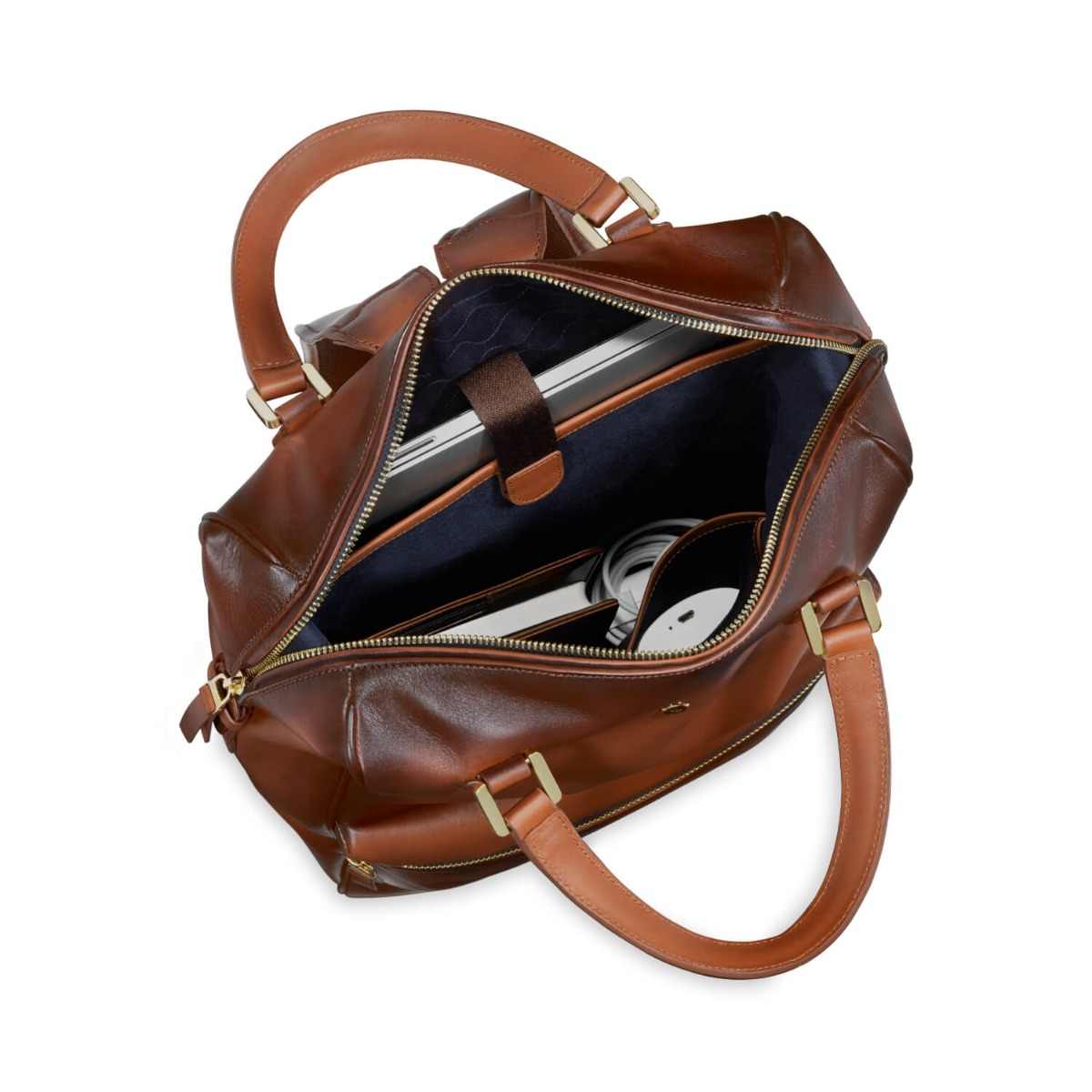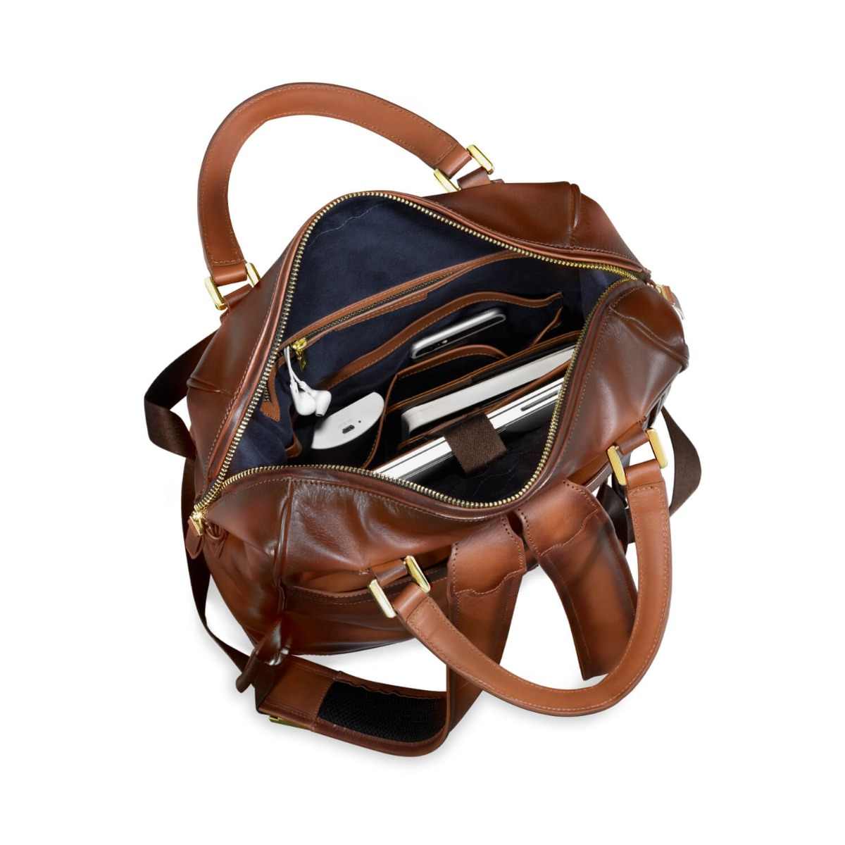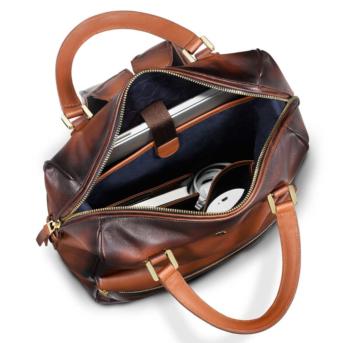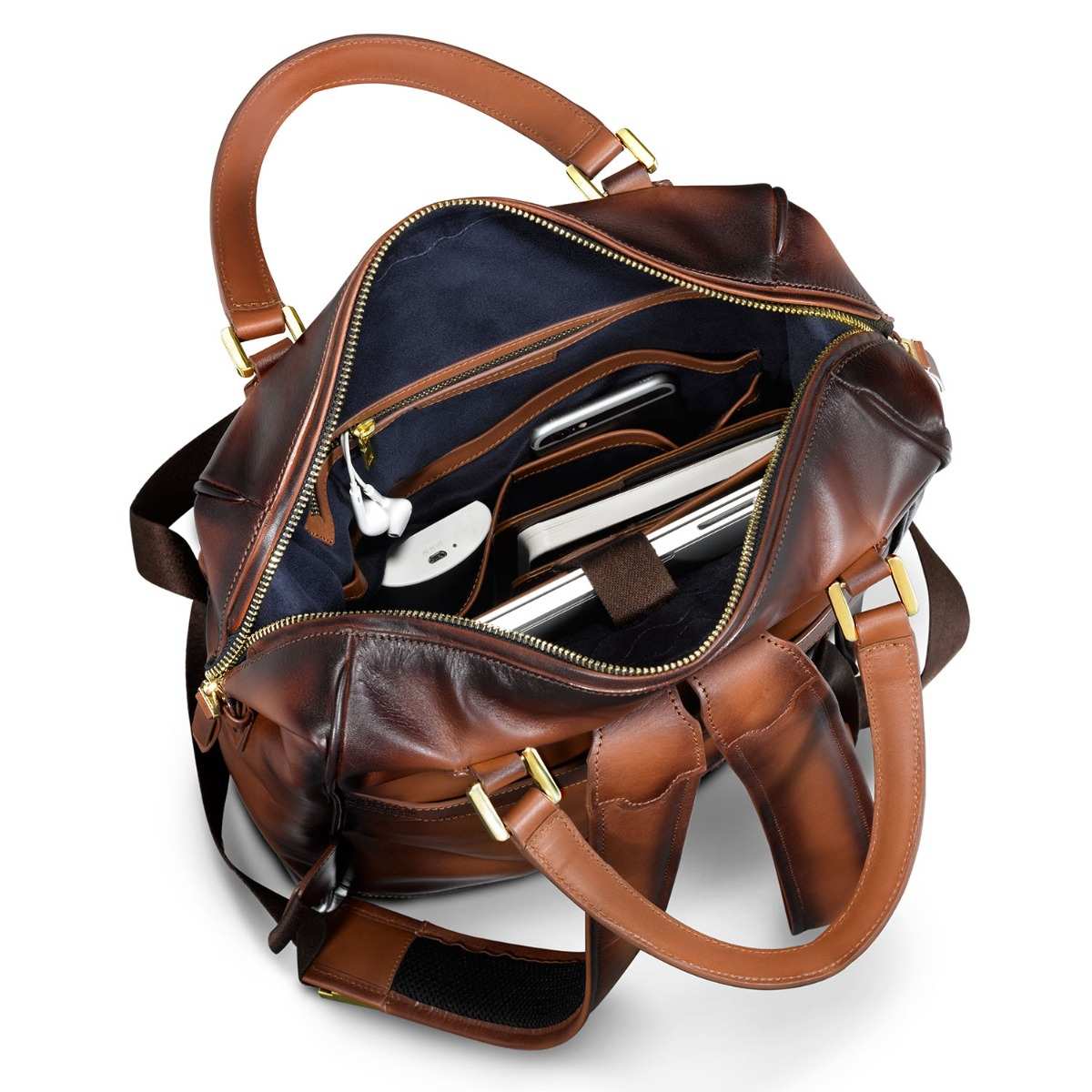 The glamour of gold, the unmissable elegance of cognac and the richness of the finest leather come together to create a bag that is absolutely lovely to look at, to own and to carry. Whether you are a conservative suit kind of a gentleman, a Friday dresser or a frequent traveler; to have the Roxton Tote backpack as your companion guarantees admiration and compliments. This compact tote is feature packed with easy access pockets, a laptop compartment that opens wide to easily slide in your laptop, and leather plumped up handles that offer maximum comfort. You have the option of either carrying it as a tote or as a backpack. The two-toned look of the semi vegetable dyed leather is created by skilled craftsmen who meticulously hand painted the edges that gradually darkens the colour as it imperceptibly passes from one shade to another, taking inspiration from Leonardo da Vinci's ‘sfumato’ technique.