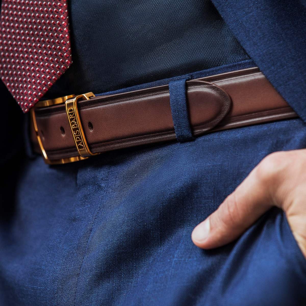 The Ducorium belt is the perfect accompaniment to your Ducorium Cognac wallet and laptop bag. Made of the finest leather, that is semi vegetable dyed, the two-tone look in cognac is created by skilled craftsmen who meticulously hand painted the edges that gradually darken the colour as it imperceptibly passes from one shade to another, taking inspiration from Leonardo da Vinci's ‘sfumato’ technique. The buckle made of superior stainless steel is plated with refined 22 carat gold, adding appeal and sophistication. Lapis Bard emblem and name is subtly embossed on the strap and engraved on the metal bridge. A Lapis Bard dust bag is provided to store the belt when traveling. The belt is presented in a Lapis Bard signature gift box.