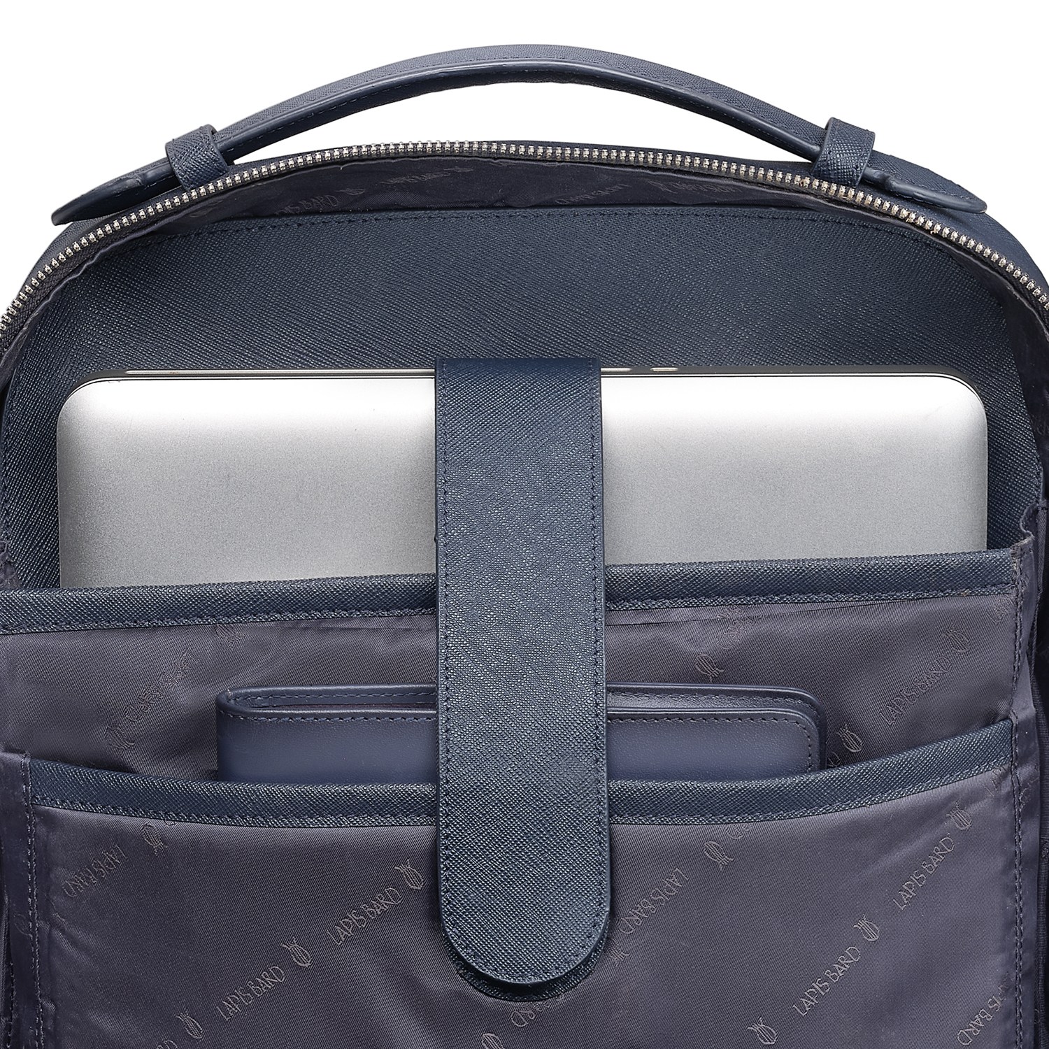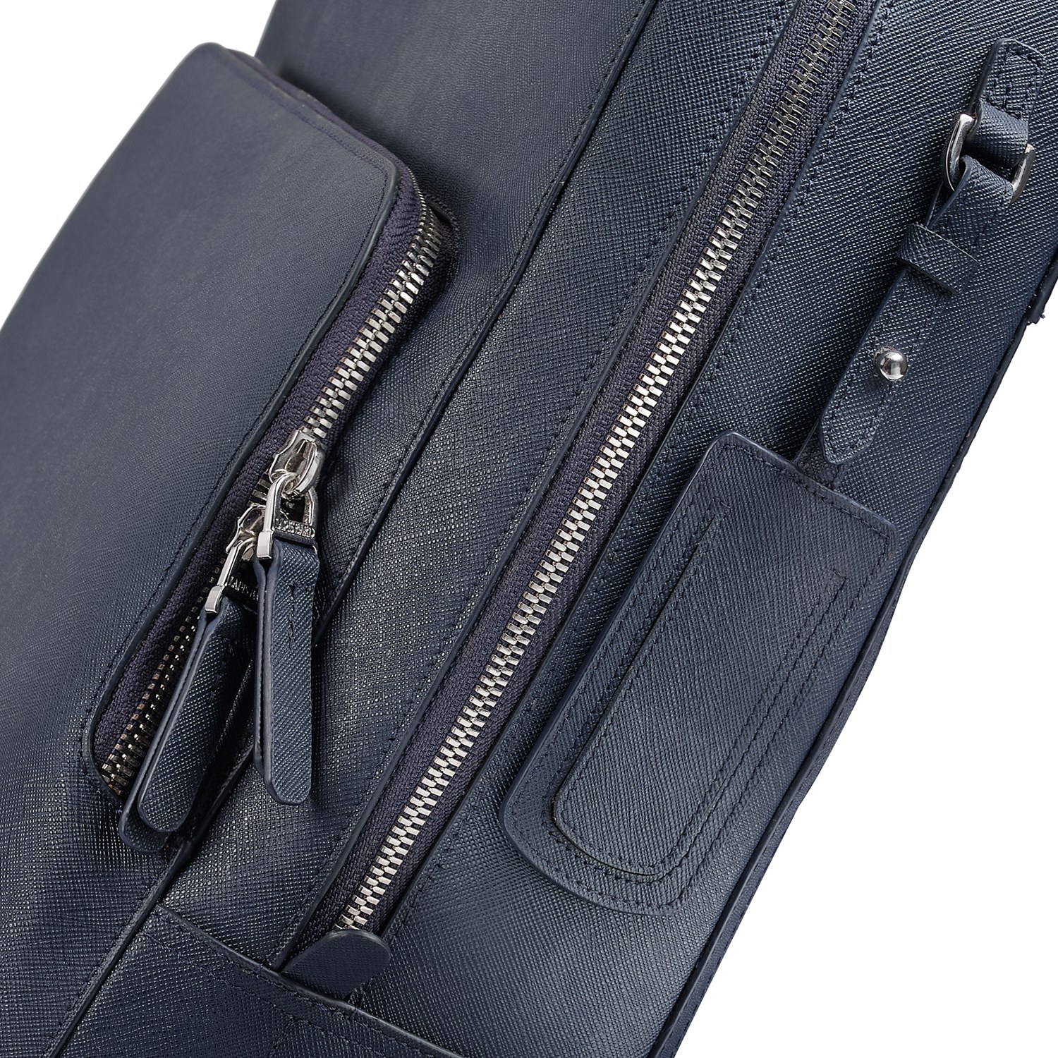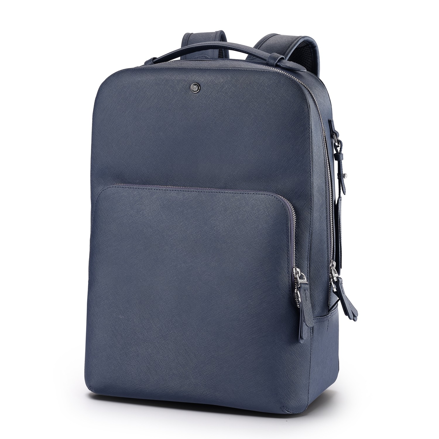 The Stanford Miami navy blue backpack bag embodies simplicity and practicality in its design. Crafted from premium Italian grain leather, its unique cross-hatch pattern ensures durability and protects against scratches. This backpack-style laptop carrier features a sleek silhouette and ample space to hold all your workday essentials. The wide zippered opening provides easy access to the main compartments, Additionally, there's an external zipper pocket on the front for added convenience. Inside, you'll find a padded laptop compartment for a 14-inch laptop, as well as a sleeve pocket for a smaller device like a tablet with extra cushioning. The soft lining ensures your devices stay protected. The backpack also features the brand emblem in black and chrome, accented by chrome trims. Whether paired with a tailored suit or business casual attire, this backpack is the perfect companion for your daily ventures.