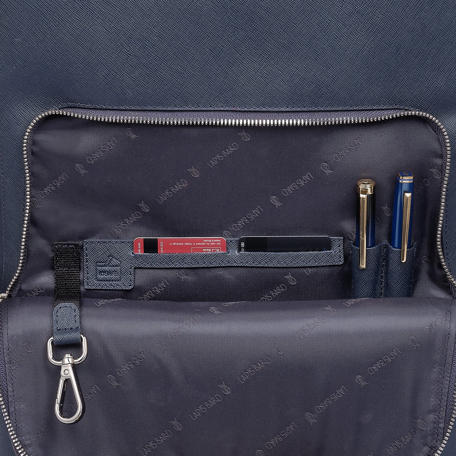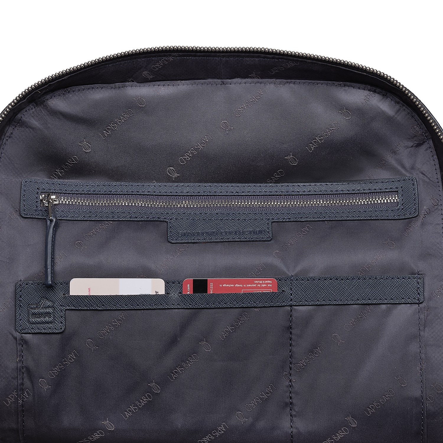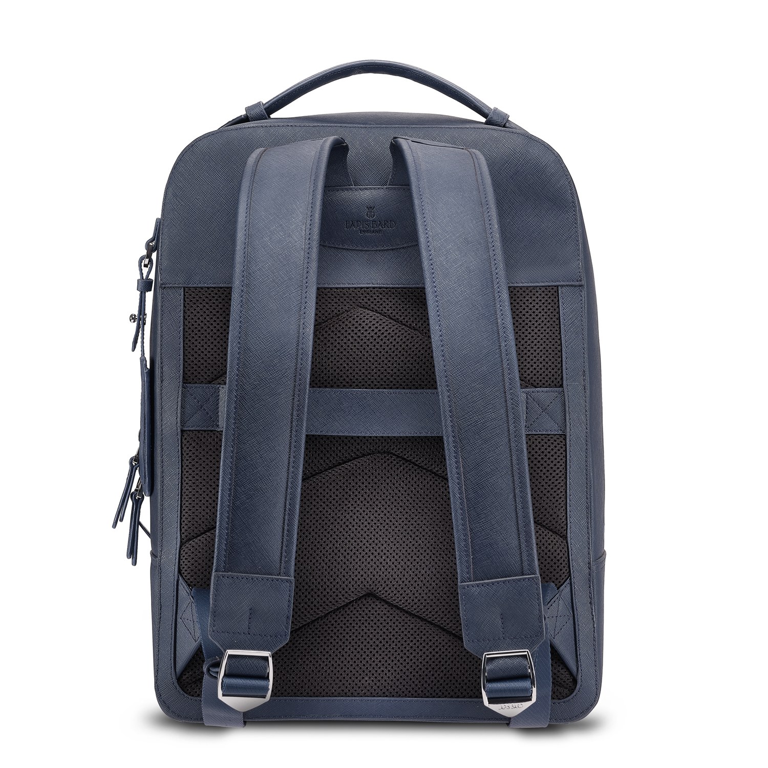 The Stanford Miami navy blue backpack bag embodies simplicity and practicality in its design. Crafted from premium Italian grain leather, its unique cross-hatch pattern ensures durability and protects against scratches. This backpack-style laptop carrier features a sleek silhouette and ample space to hold all your workday essentials. The wide zippered opening provides easy access to the main compartments, Additionally, there's an external zipper pocket on the front for added convenience. Inside, you'll find a padded laptop compartment for a 14-inch laptop, as well as a sleeve pocket for a smaller device like a tablet with extra cushioning. The soft lining ensures your devices stay protected. The backpack also features the brand emblem in black and chrome, accented by chrome trims. Whether paired with a tailored suit or business casual attire, this backpack is the perfect companion for your daily ventures.