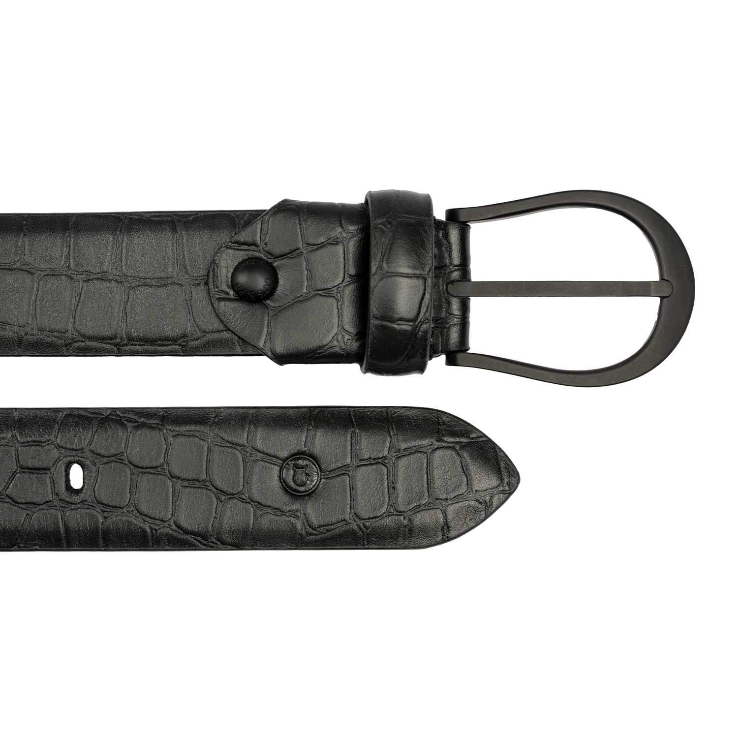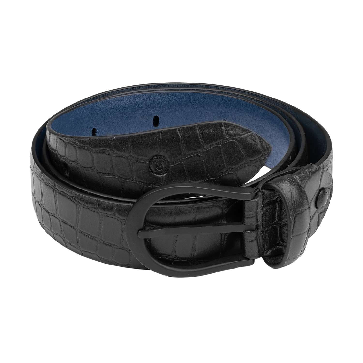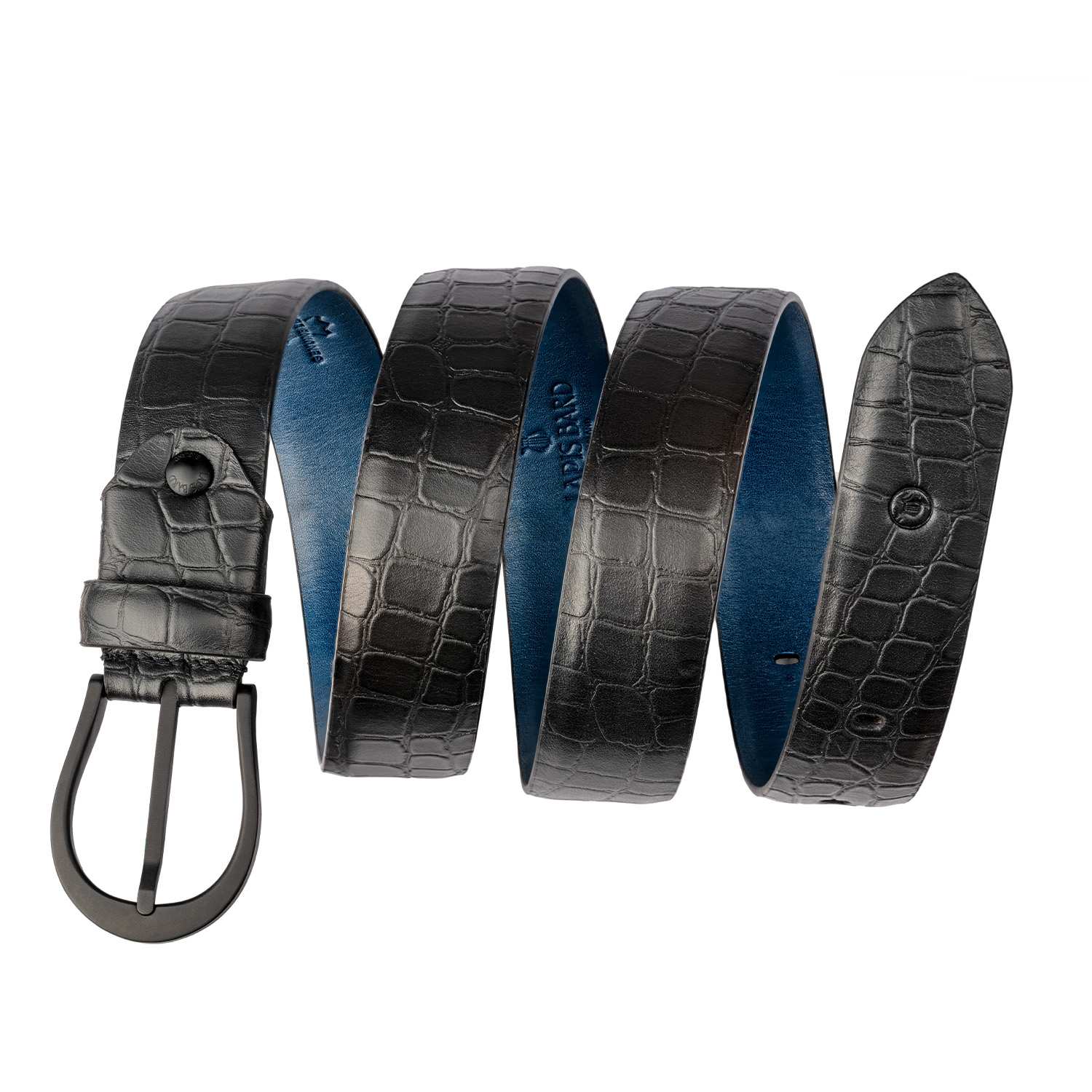 Add a hint of texture to your attire and level up from the monotony of formal wear. Handcrafted from full grain crocodile pattern Italian leather characterized by embossed crocodile skin effect the belt has a reverse underside of deep navy in semi veg genuine leather.Simple yet sophisticated with strong masculine accents,featuring the Lapis Bard signature lyre inspired buckle in PVD black stainless-steel with the brand name engraved behind the buckle.