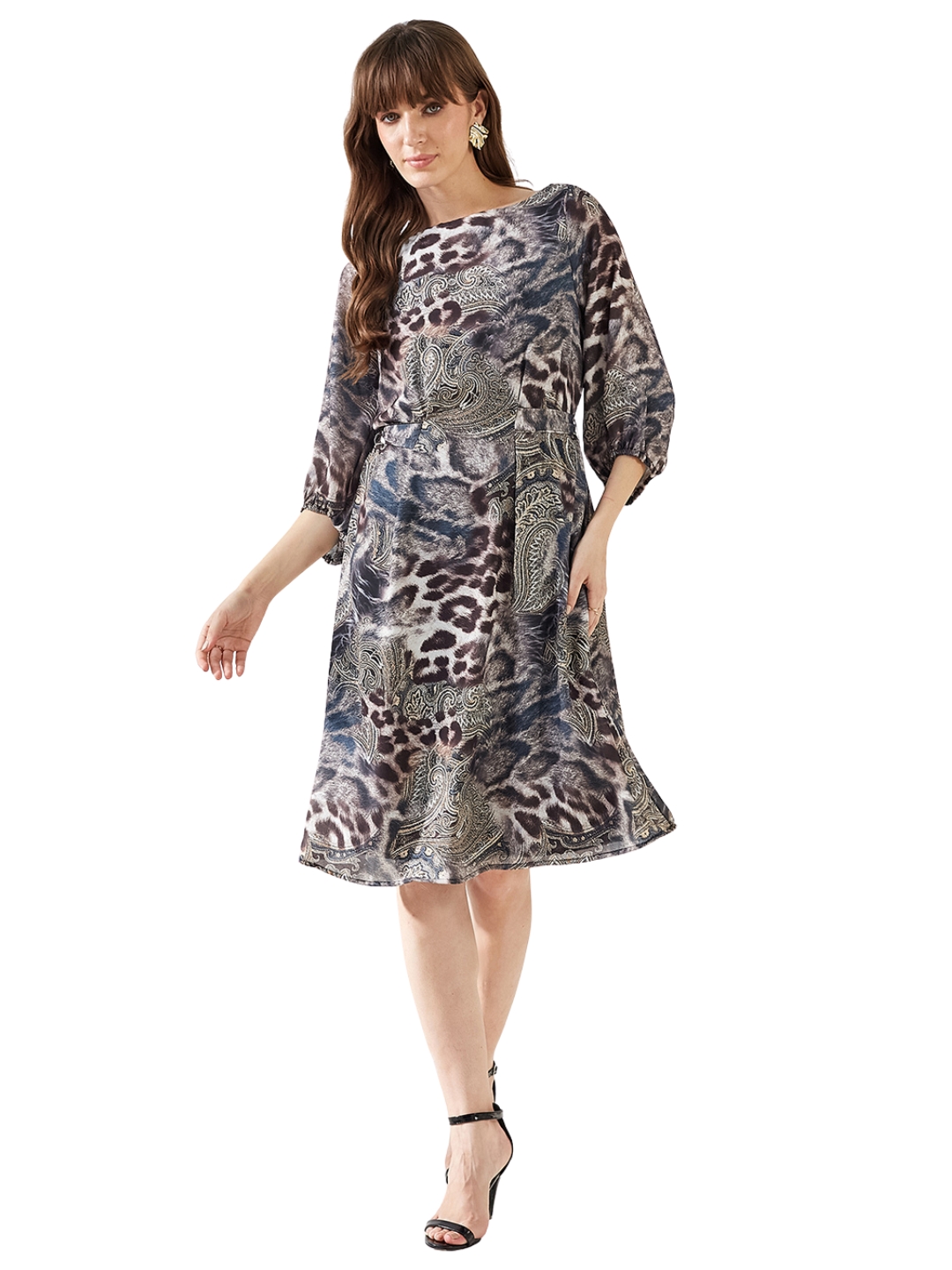 Latin Quarters Women Black Printed 3/4th Sleeves Boat Neck A-line Casual Dress