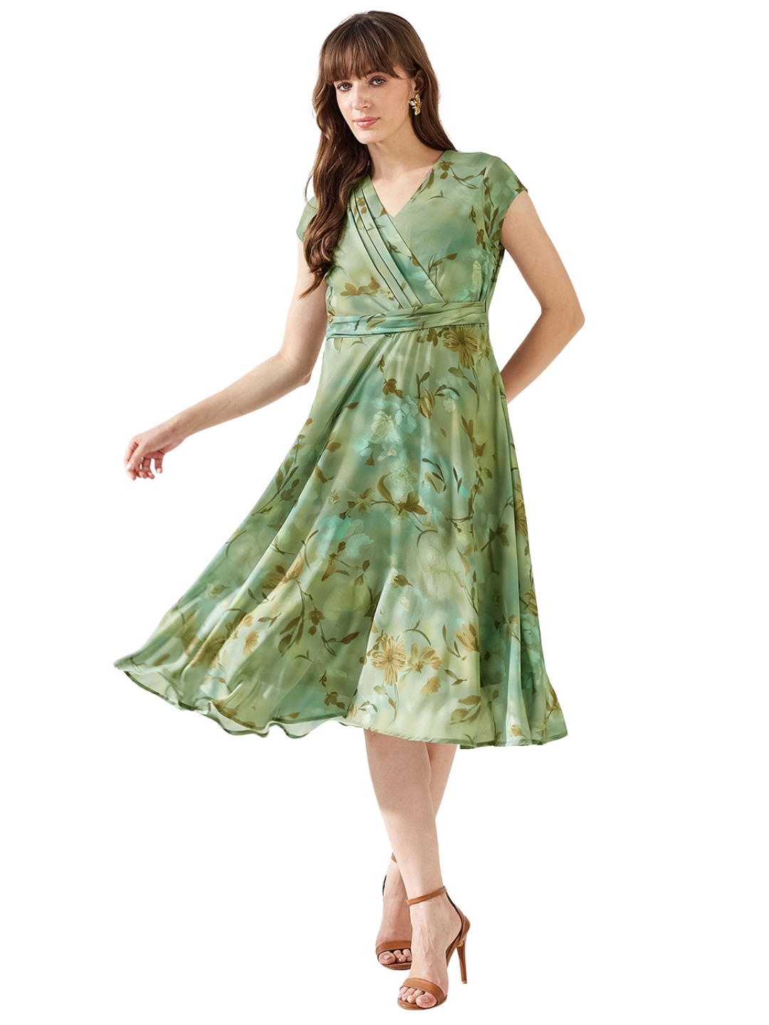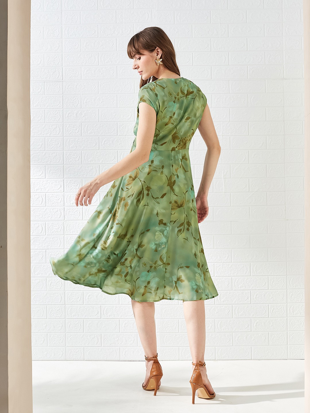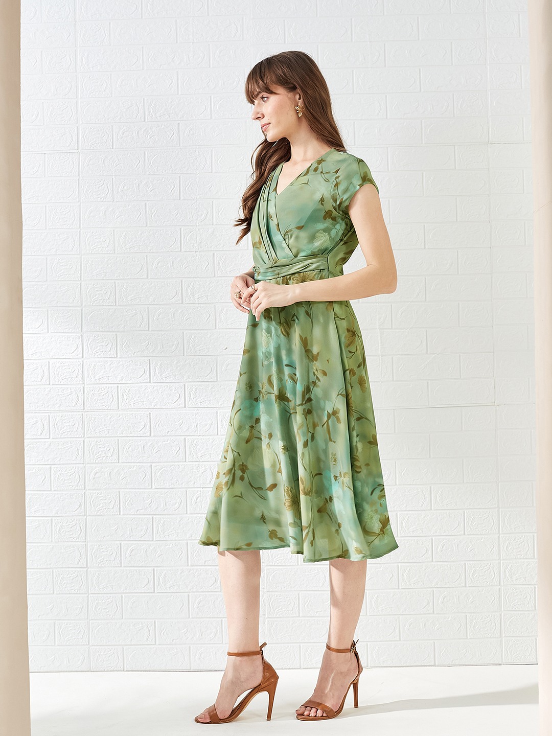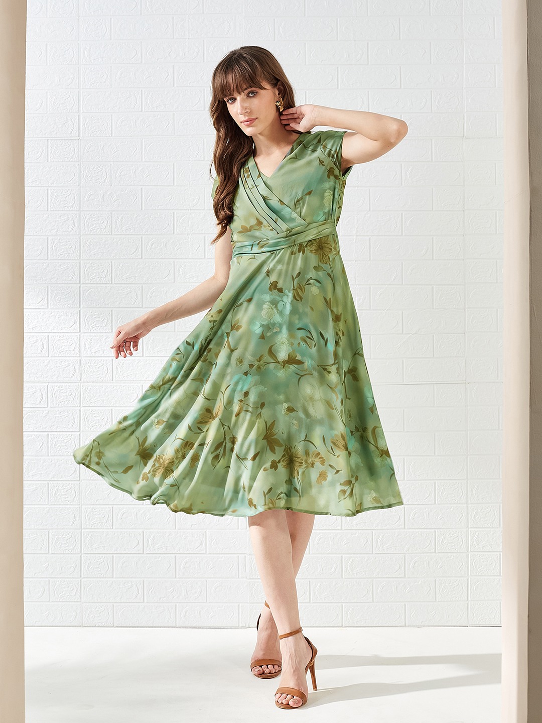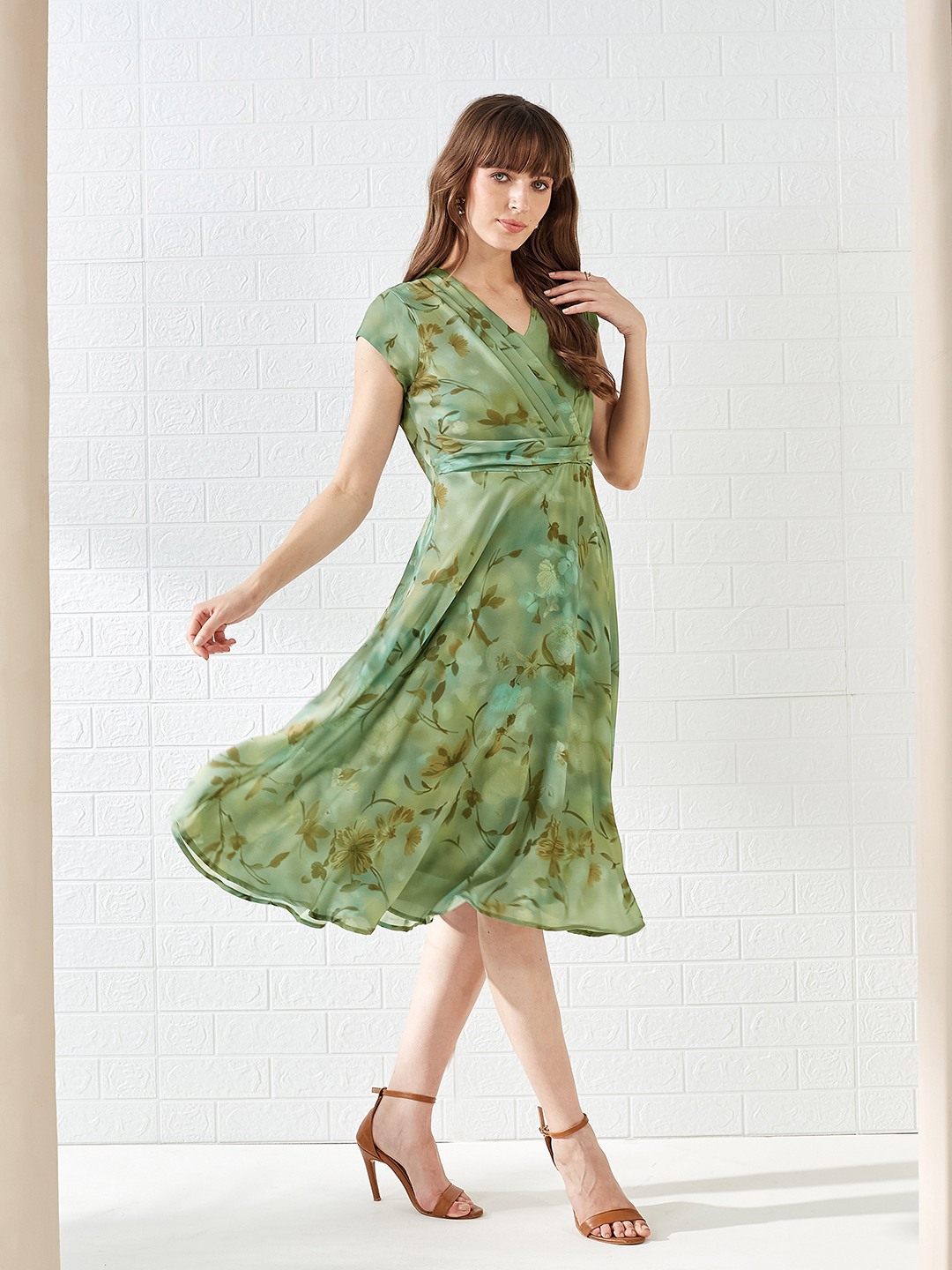 Latin Quarters Women Green Printed Cap Sleeves V-neck A-line Casual Dress