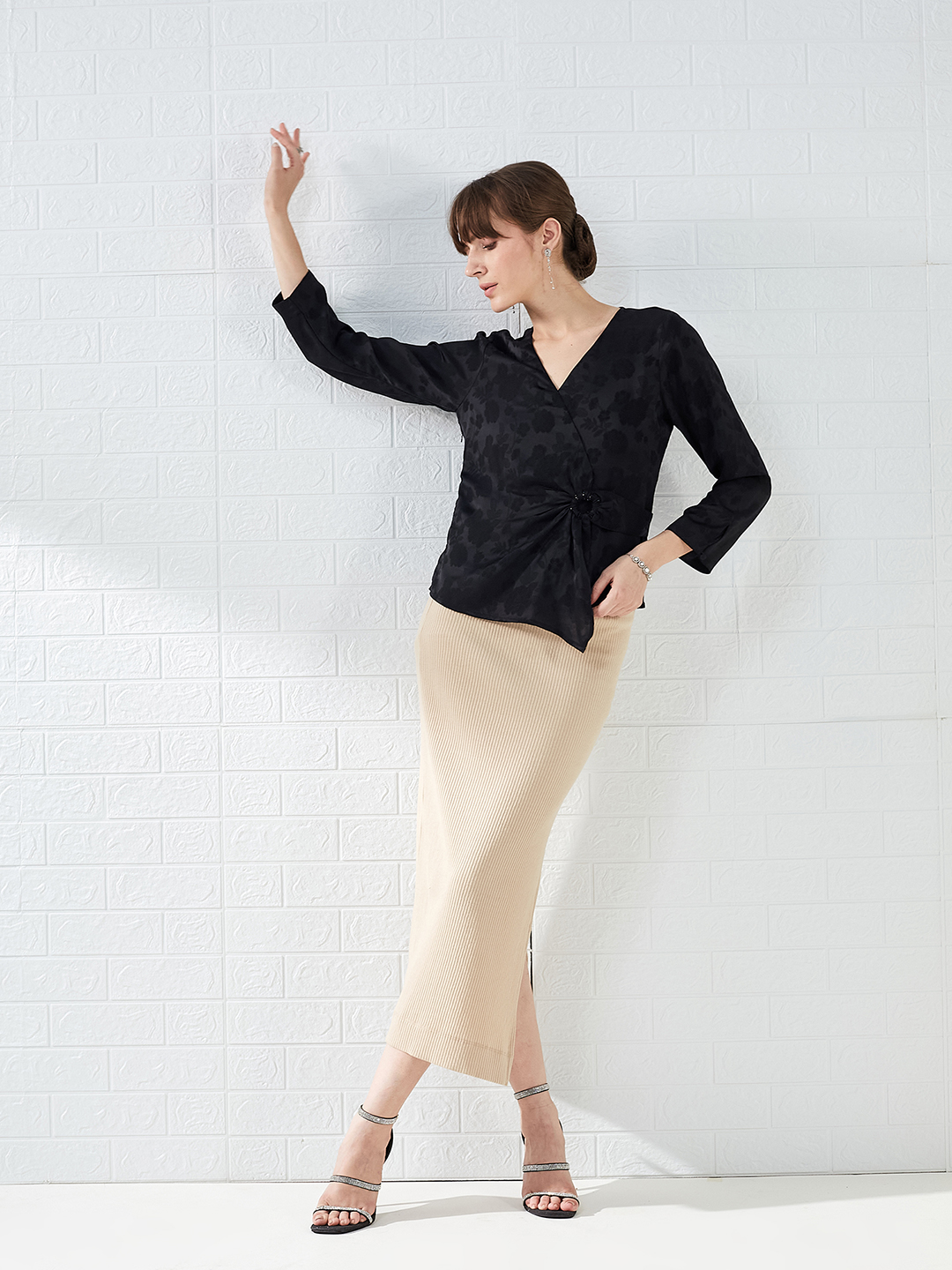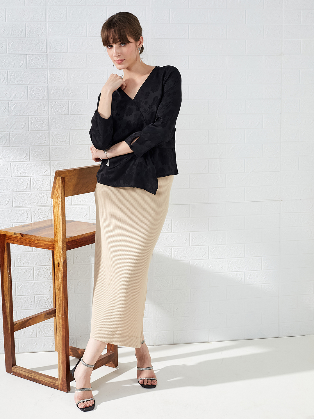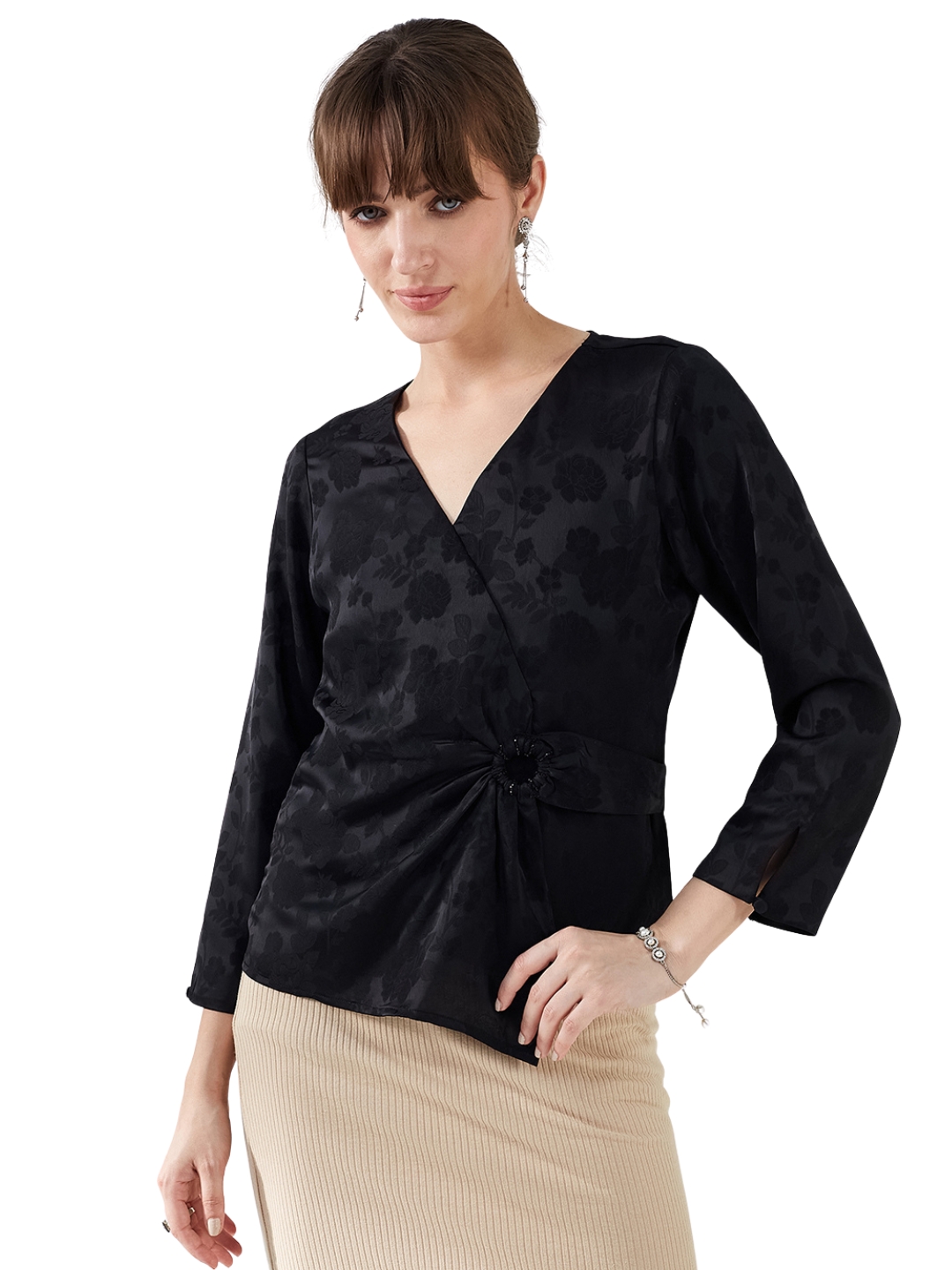 Latin Quarters Women's Black 3/4Th Sleeves V-Neck Self Design Party Regular Top