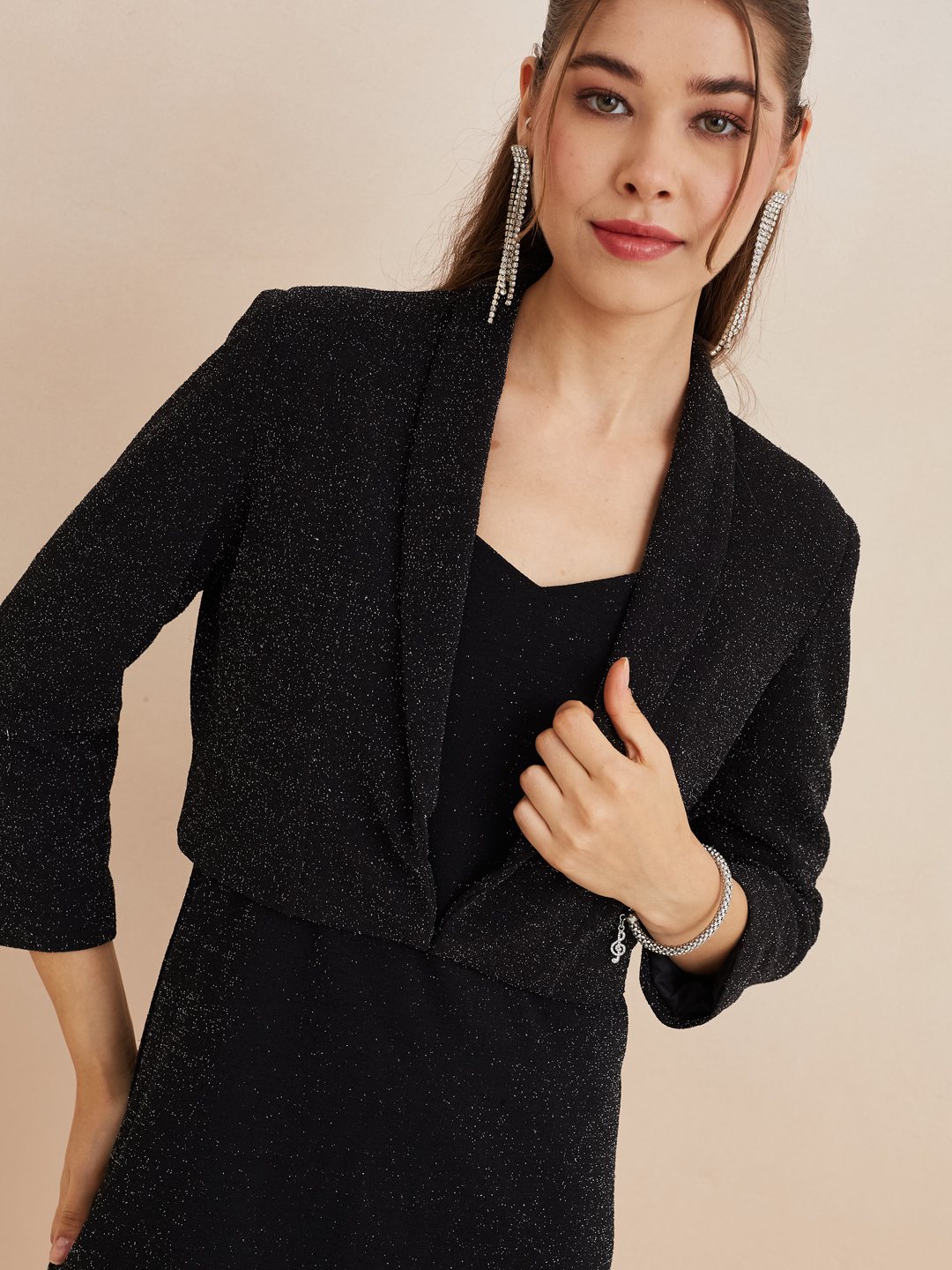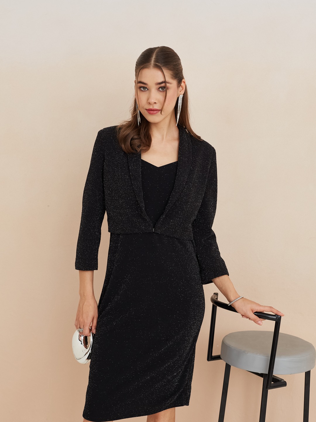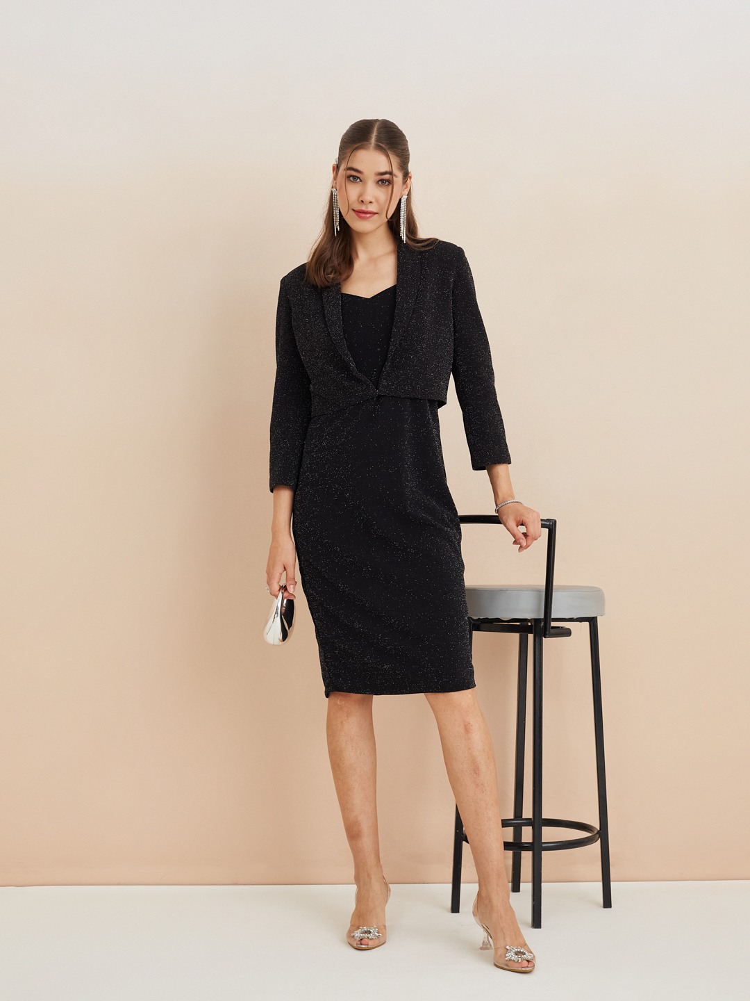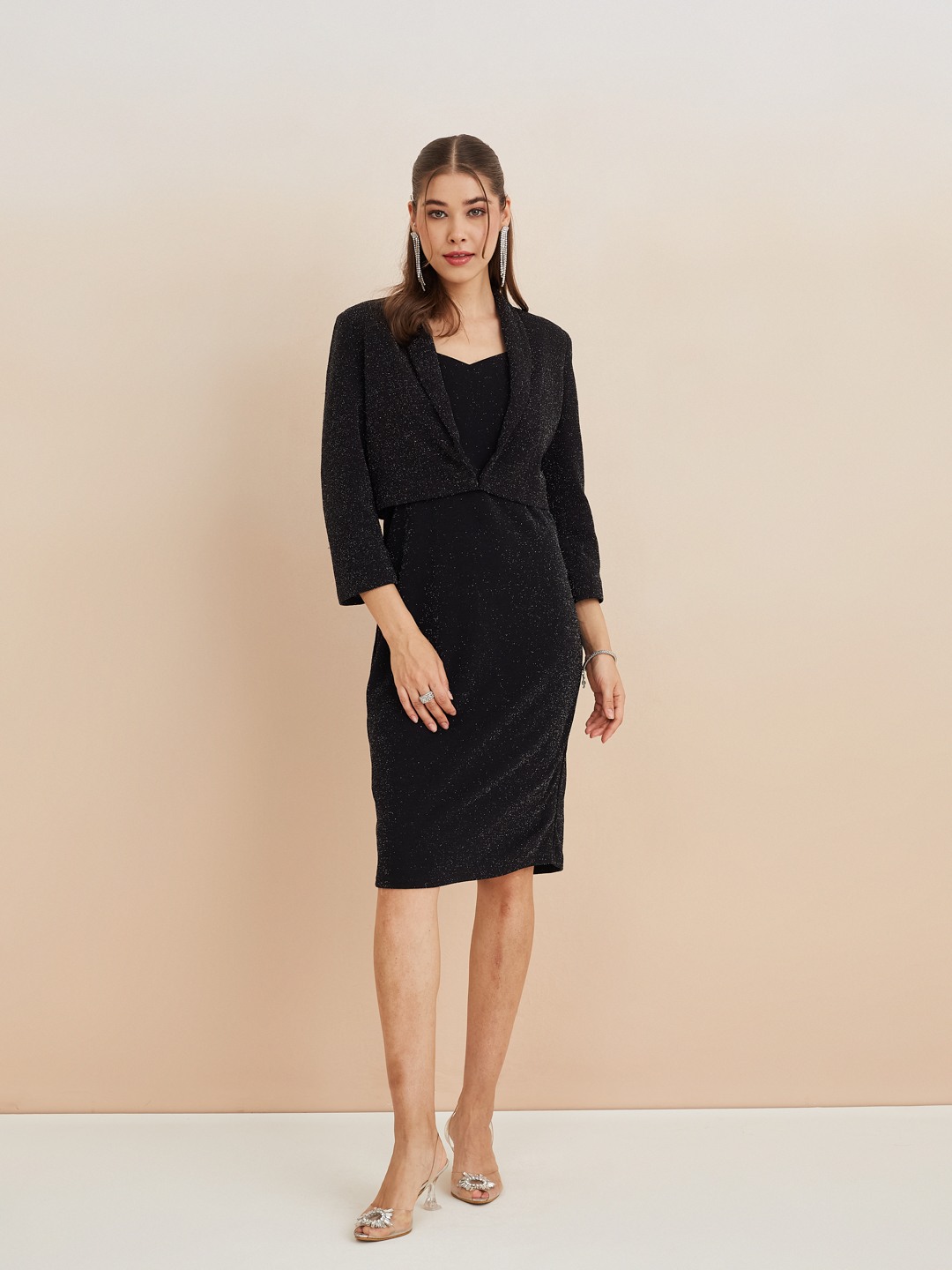 Latin Quarters Women'S Black Sweatheart Neck Sleeveless Solid Party Bodycon Dress Shrug Set