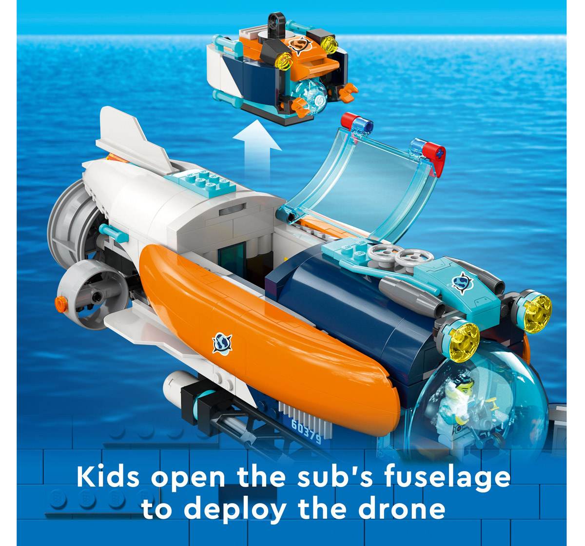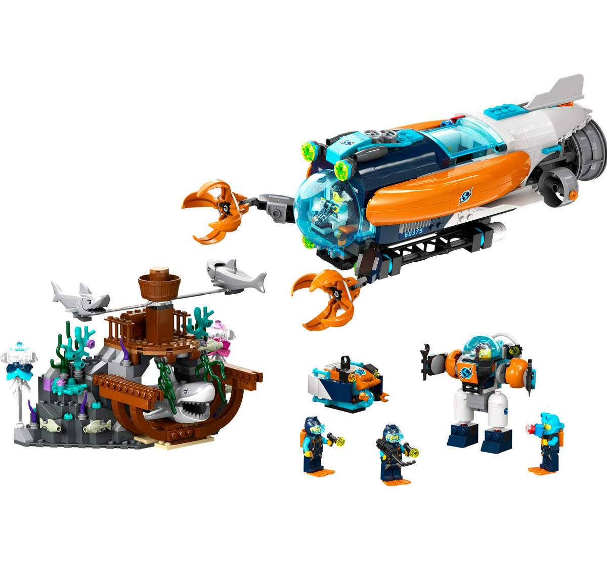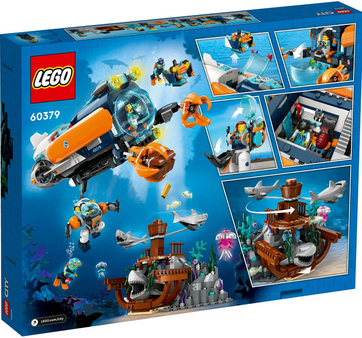 The LEGO City Deep-Sea Explorer Submarine (60379) is loaded with features and realistic details. The toy sub comes with a cool bubble cockpit, onboard science lab, underwater drone and a mech-style diving suit for seabed exploration. A shipwreck setting is home to a shark den, giant jellyfish and sunken treasure. Just add the 6 minifigures for hours of imaginative role play.