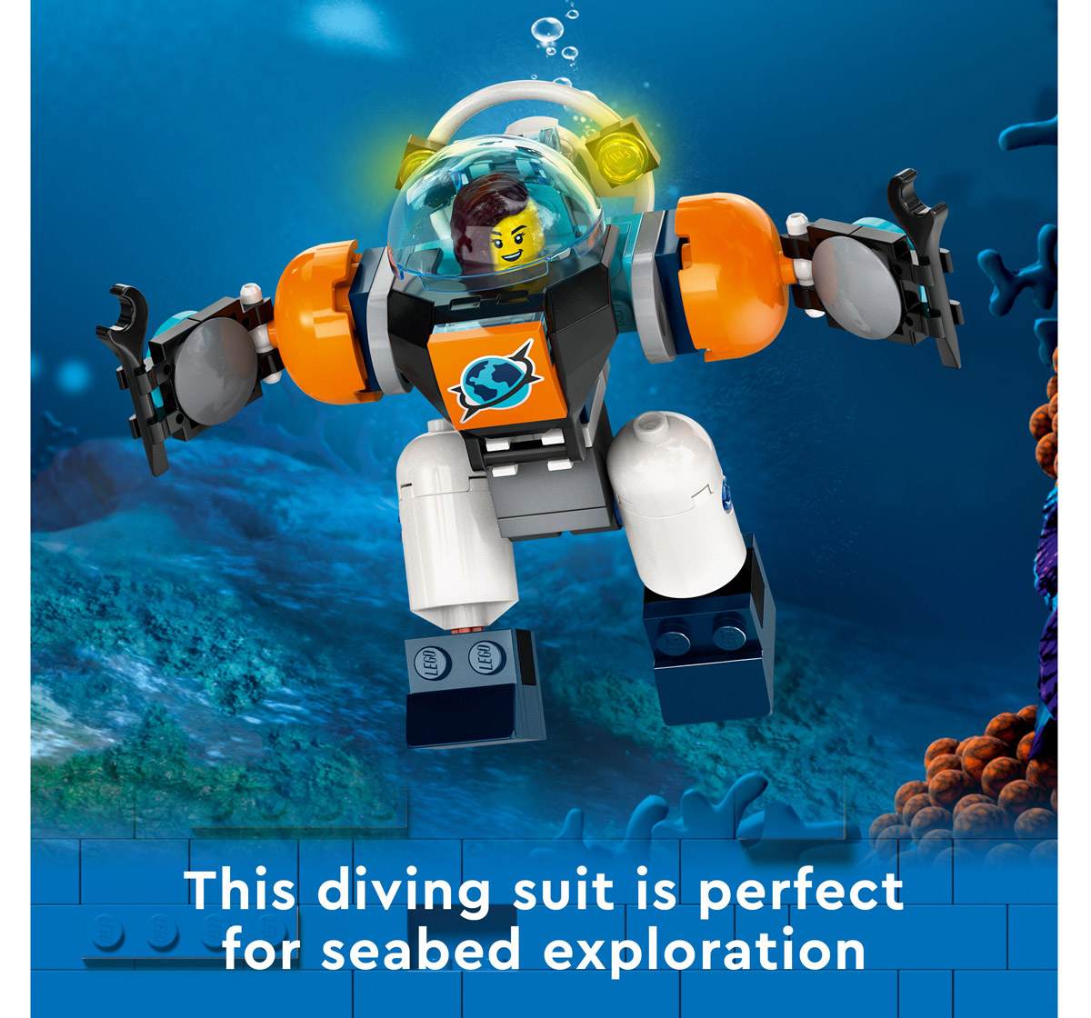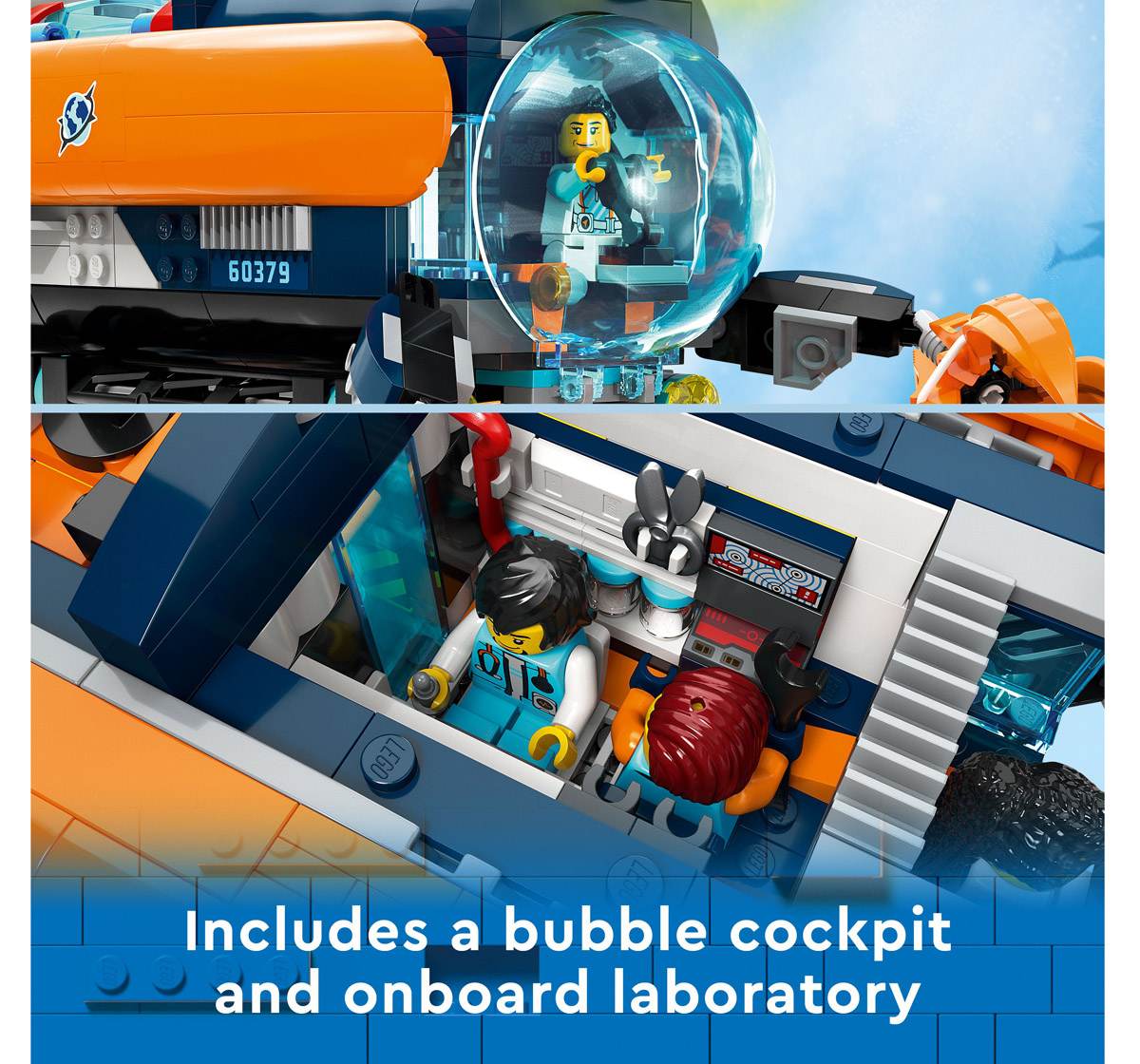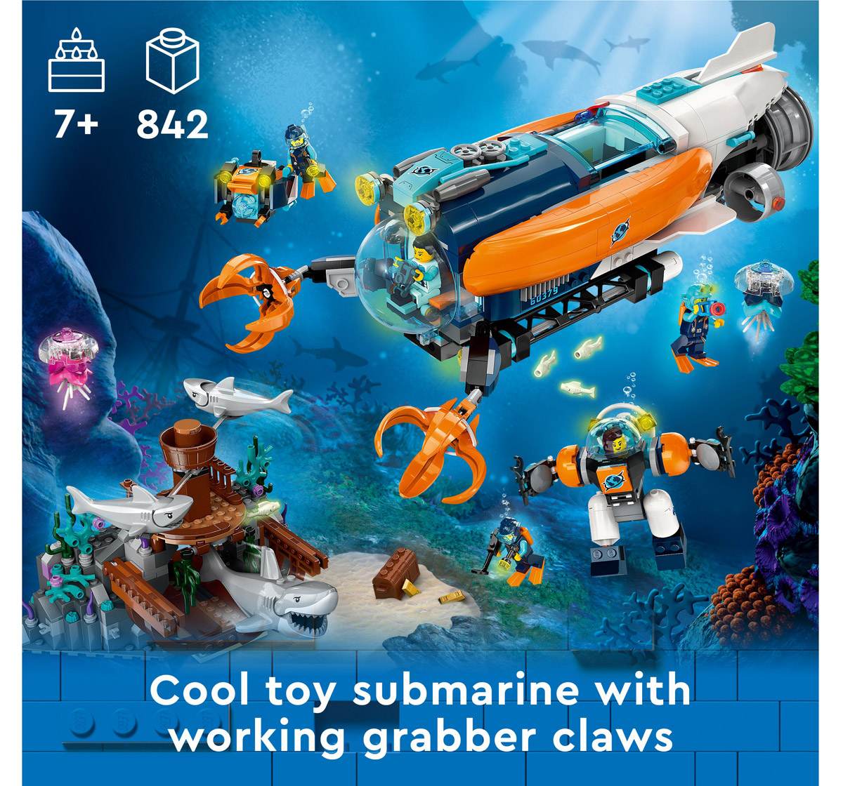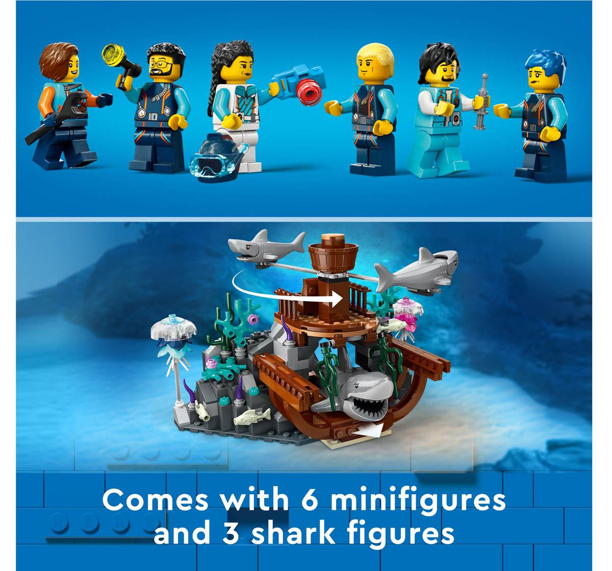 The LEGO City Deep-Sea Explorer Submarine (60379) is loaded with features and realistic details. The toy sub comes with a cool bubble cockpit, onboard science lab, underwater drone and a mech-style diving suit for seabed exploration. A shipwreck setting is home to a shark den, giant jellyfish and sunken treasure. Just add the 6 minifigures for hours of imaginative role play.