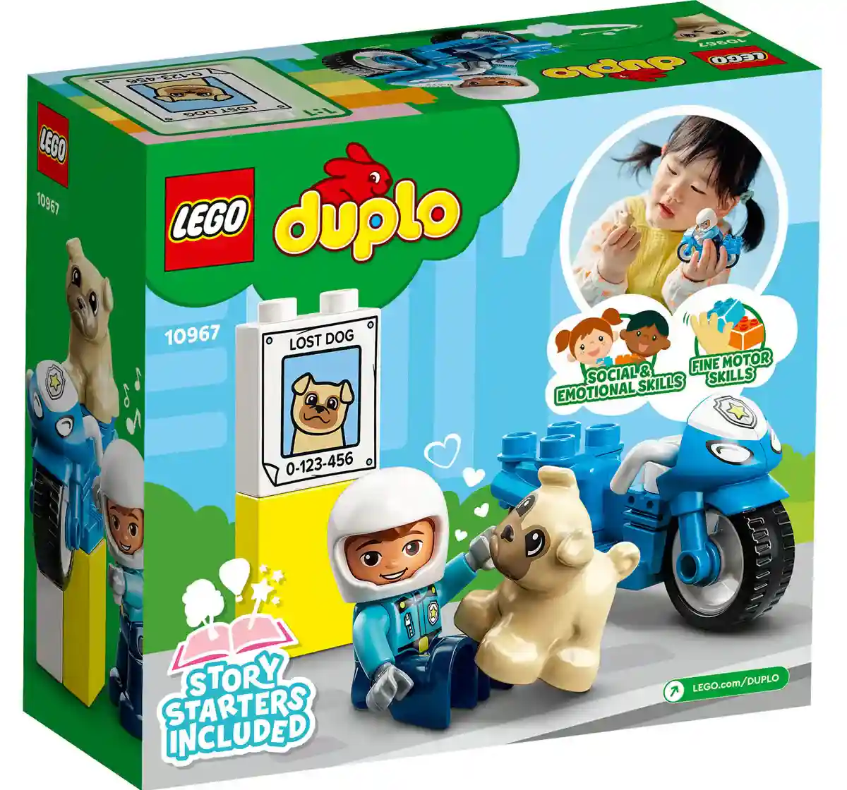 LEGO DUPLO Rescue Police Motorcycle (10967) provides hands-on developmental play that will delight any preschooler aged 2+ with an interest in police work, cool motorcycles and caring for animals. A police rescue with endless play possibilities.