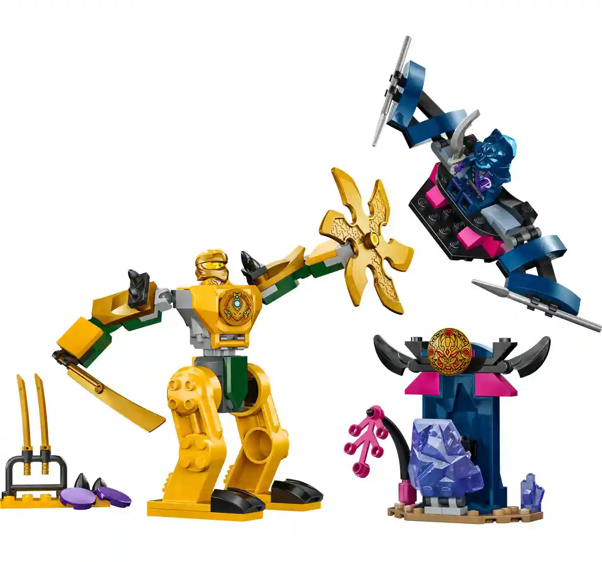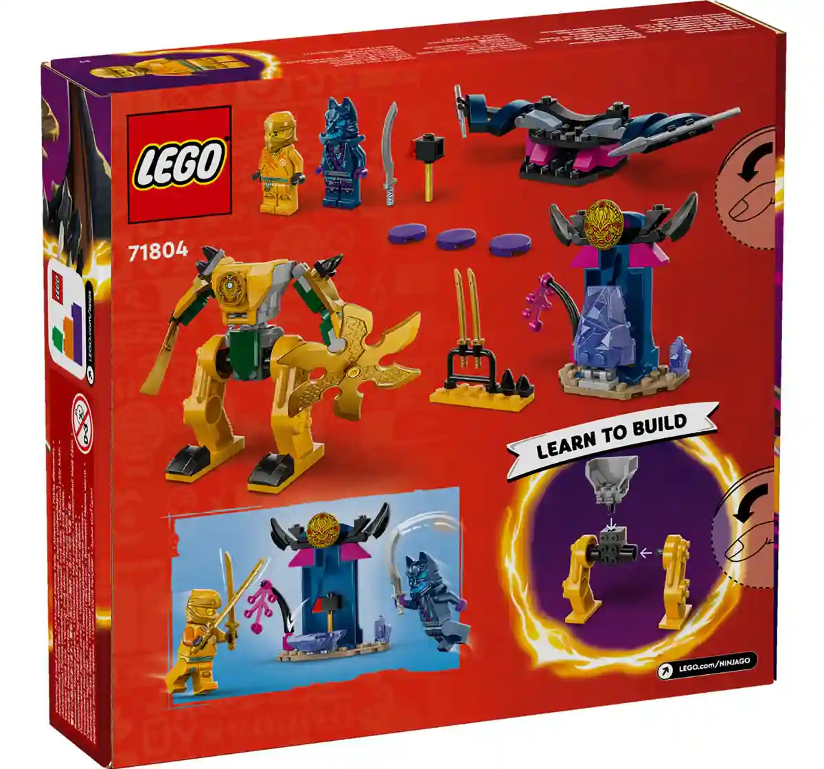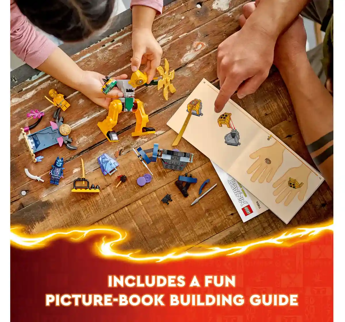 Arin’s Battle Mech (71804) ninja toy lets kids aged 4+ learn to build as they join in with their ninja heroes’ attempt to save their dragon friends. This role-play action toy includes an impressive mech figure to inspire kids to recreate exciting adventures from season 2 of the NINJAGO Dragons Rising TV show. This LEGO set comes with 2 minifigures: Arin with a katana accessory and a Wolf Mask Warrior with a sword accessory. Arin fits in the posable mech figure, which wields a large sword and rotating blade, while the Wolf Mask Warrior can fly in a glider that has posable wings, a disc shooter and 2 spears. There’s also a brick-built crystal cave with a mallet of shattering inside and a weapons rack with 2 golden katana sword accessories.