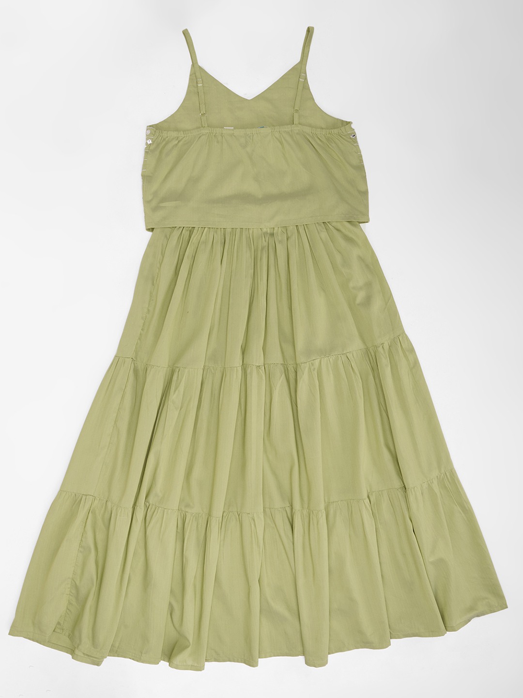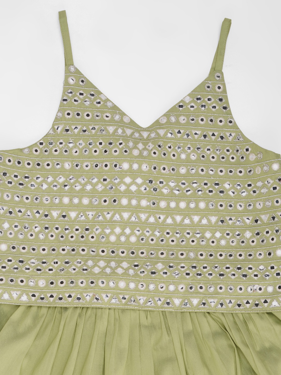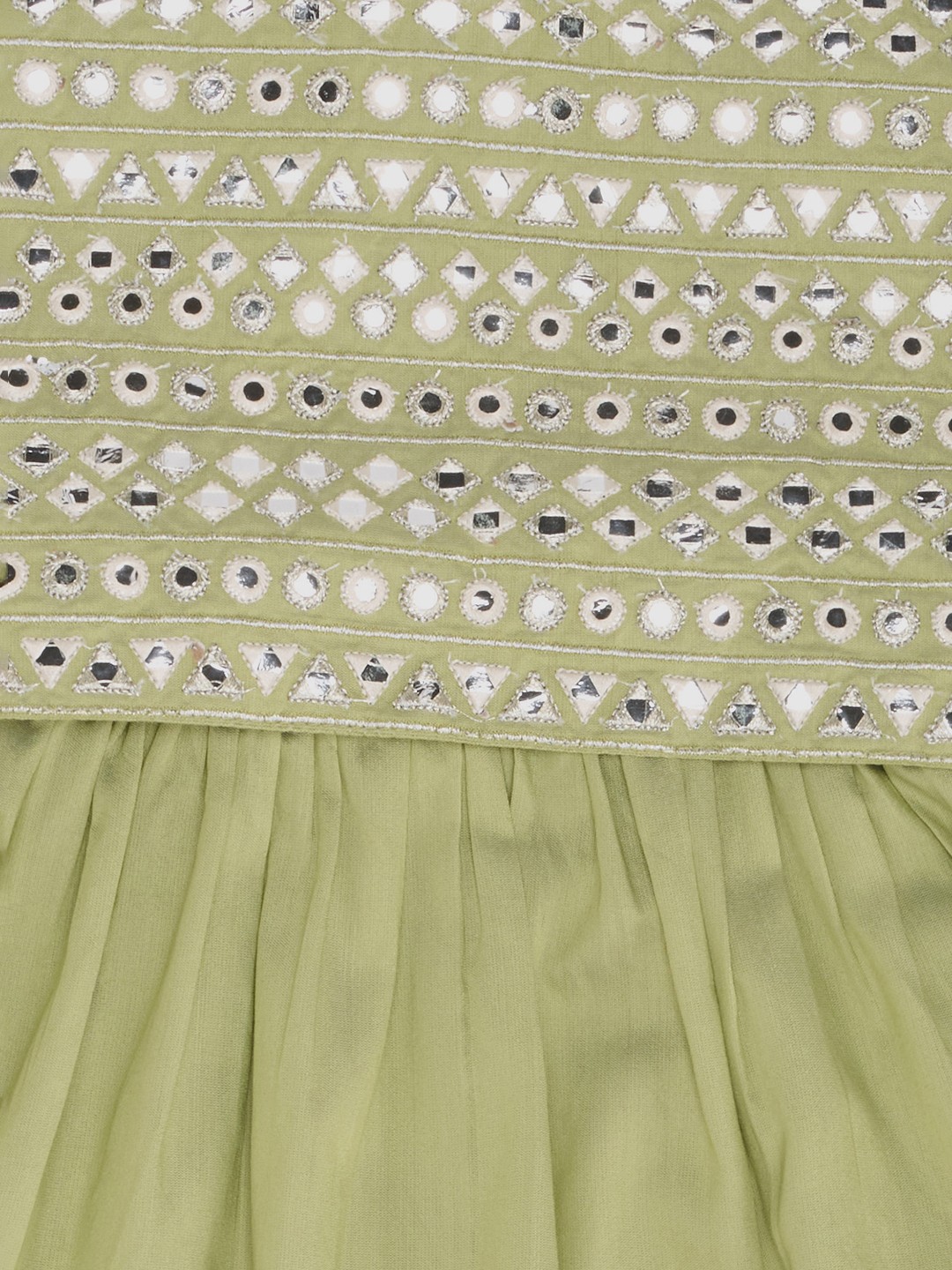 A sweet festive ensemble crafted in a soft light green hue, this set pairs a mirror-embellished strappy choli with a flowy tiered ghargra. The elasticated waist ensures comfort while the lightweight fabric adds graceful twirl. A cheerful pick for celebrations and festive moments.