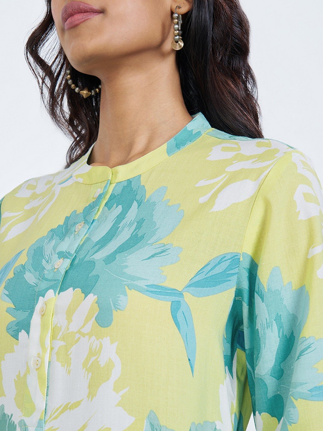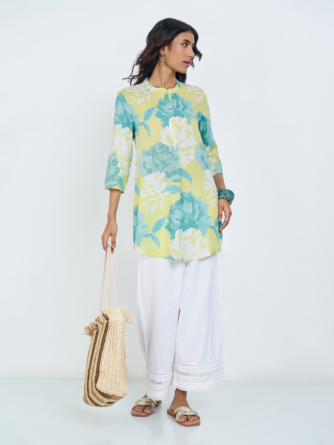 Fresh summer vibrance with a bold painterly floral aesthetic and relaxed ease. The tunic features a relaxed silhouette with a mandarin collar and a clean button placket, and is finished with 3/4 sleeves. Crafted in a soft, lightweight woven fabric that feels airy and comfortable through warm days.