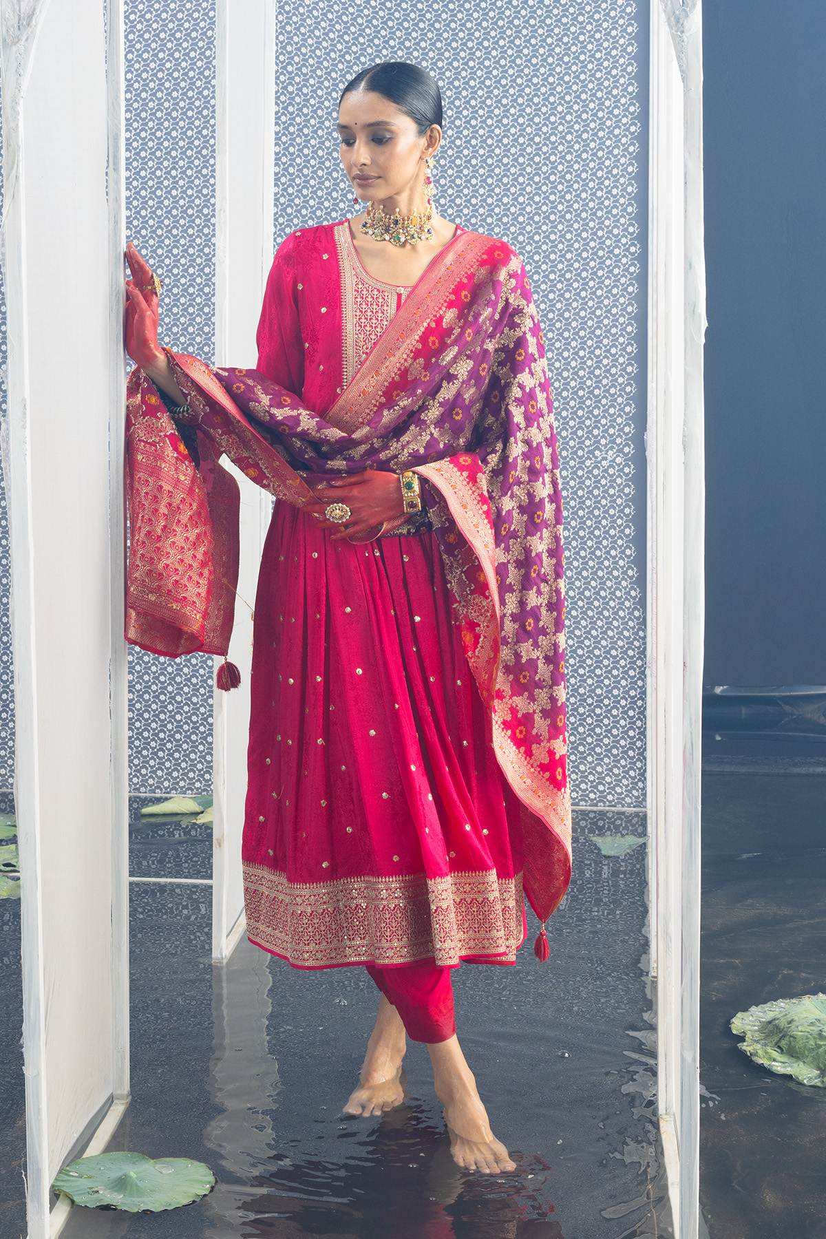Radiant in magenta, this embellished yoke zari embroidered kurta set is perfect for festivities. featuring a round neck and three-quarter sleeves, it combines traditional charm with contemporary elegance, making it an ideal choice for celebratory occasions.